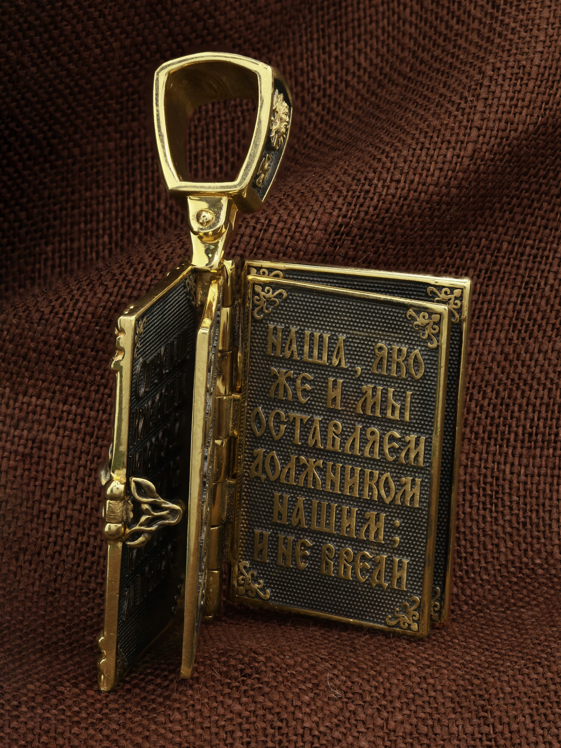 Специальная застежка сбоку скрывает внутреннее содержимое изделия — страницы, на которых выгровированы слова молитвы «Отче наш»: «Отче наш, Иже еси на небесех! Да святится имя Твое, да приидет Царствие Твое, да будет воля Твоя, яко на небеси и на земли. Хлеб наш насущный даждь нам днесь; и остави нам долги наша, яко и мы оставляем должником нашим; и не введи нас в напасть, но избави нас от лукаваго: Яко твое есть царствие и сила и слава во веки. Аминь».