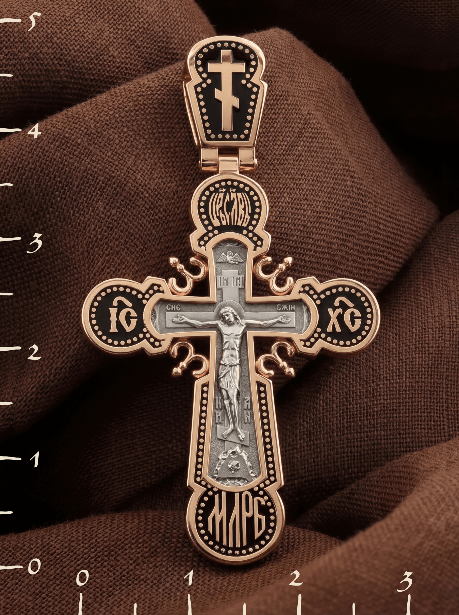 На лицевой стороне креста изображено Распятие Господа и Спасителя нашего Иисуса Христа. Крест- символ спасения и искупления рода человеческого, знамение победы над смертью и адом. Иисус Христос, как искупительная жертва освобождения человечества от власти греха, умер крестной смертью и в третий день воскрес. Над вершиной Распятия помещена надпись «Царь Славы» и изображение Духа Святого в виде голубя, сходящего с небес. На верхней табличке, выше головы Иисуса, расположена надпись, составленная Понтием Пилатом — «IНЦI». Она означает «Иисус Назорей, Царь Иудейский». Надпись «IС» « ХС» означает Иисус Христос и помещается на разных сторонах поперечной перекладины креста. Ниже — слово «НИКА», что означает «победитель». Надпись «МЛРБ» — «место лобное рай бысть» означает, что место лобное стало раем, помещается в нижней части креста. Крест стоит на горе камней, символизирующих Голгофу. В ее основании различается череп — это голова Адама. На православном кресте Христос не умирает, а свободно простирает руки, ладони Иисуса открыты, будто он хочет обнять все человечество, даря им свою любовь и открывая путь к вечной жизни. На кулонном кольце помещен крест.