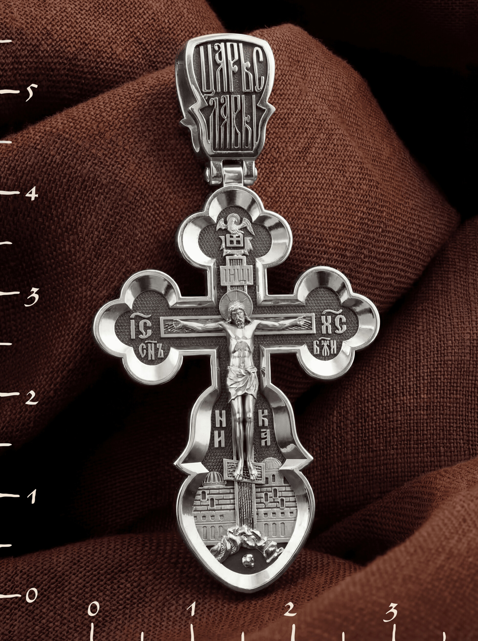 Распятие сопровождается иконографическими надписями, прославляющими Господа Иисуса Христа. На боковых оконечностях размещены инициалы святого имени Спасителя «IС ХС» и надпись «Сын Божий», обозначающая Его божественную природу. На подножии Креста можно прочитать надпись «НИКА» (Победитель) — символ победы Господа над смертью. Венчает лицевую сторону образ Святого Духа в виде голубя.