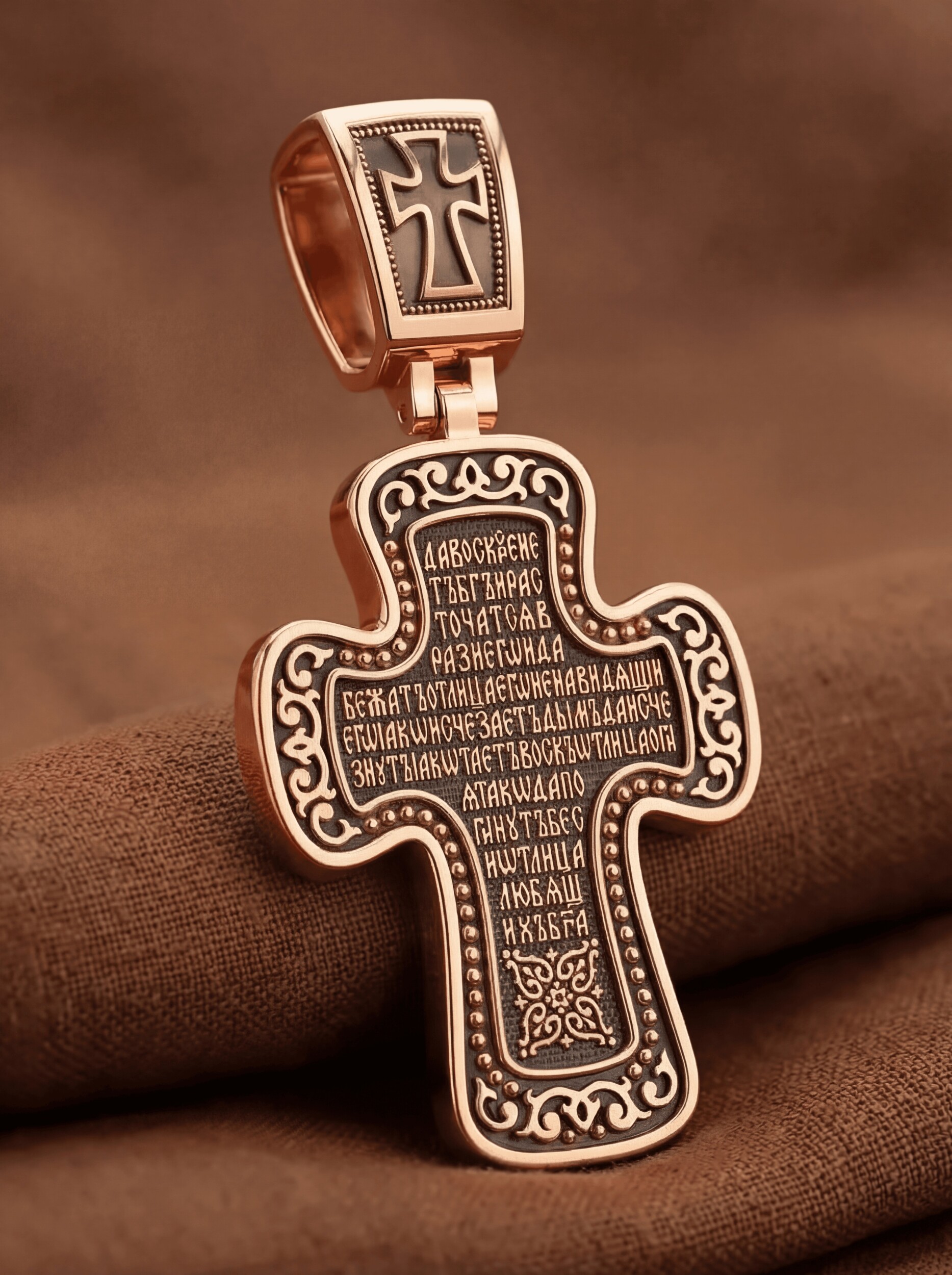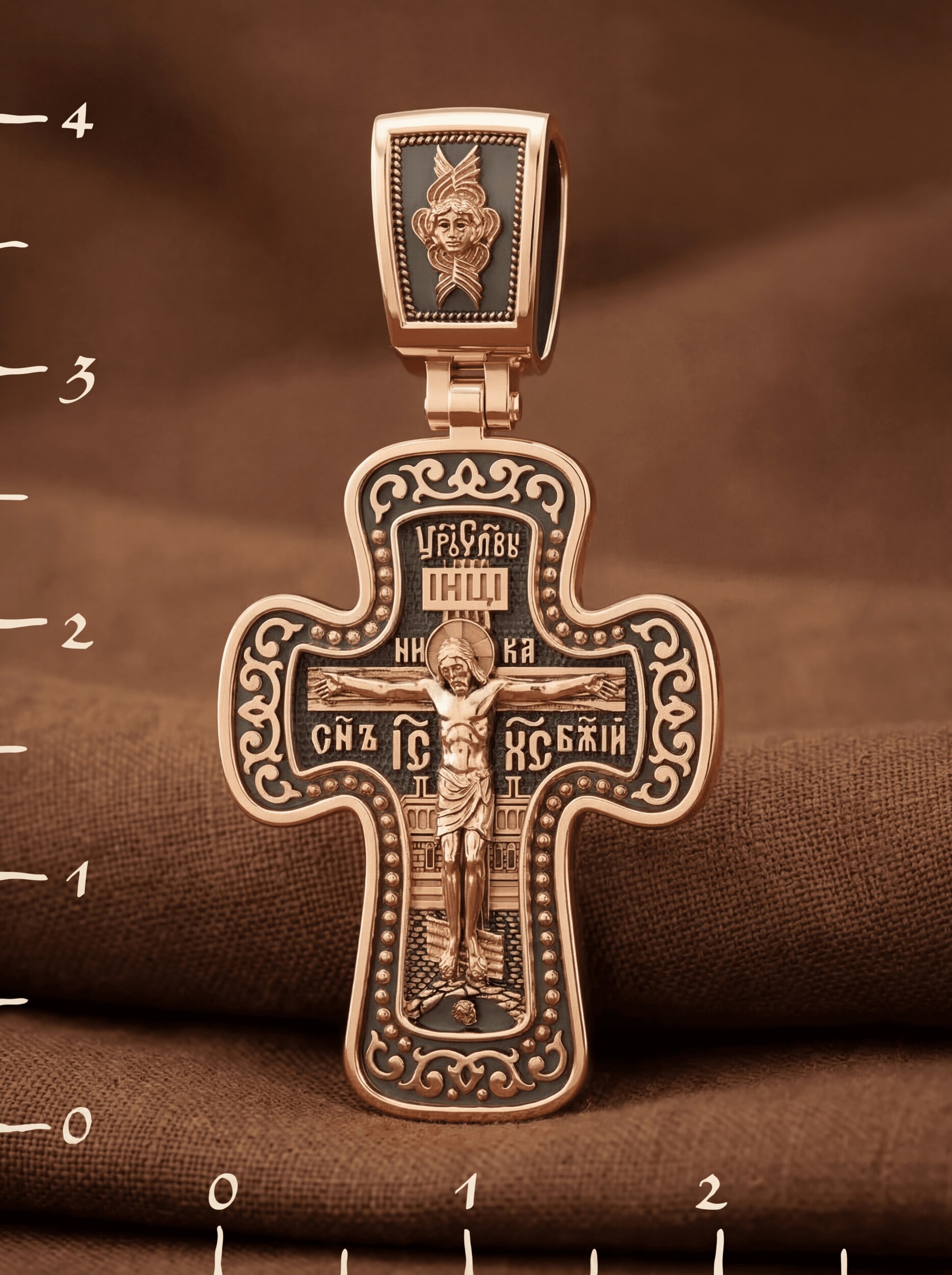 Распятие сопровождается каноническими надписями. Это святое имя Христа, которое принято писать на иконах сокращенно — «ИС ХС», словосочетание «СЫН БОЖИЙ», что означает божественную природу Иисуса Христа. Рядом с Его образом помещены слова «Царь Славы». Над головой Господа на поперечной перекладине аббревиатура «IНЦI», что символизирует табличку, которая была прибита к Кресту, с надписью «Иисус Назорей Царь Иудейский». На кулонном кольце помещено изображение серафима.
