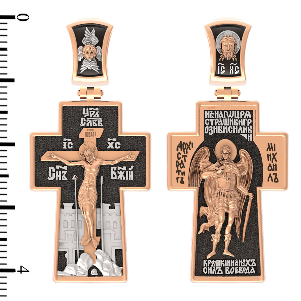 В центре оборота креста изображен Архистратиг Михаил. Могучий Архангел почитается как покровитель воинов и всех верных Богу и ведущих борьбу против сил зла, а также защитник душ умерших, страж райских врат. Вокруг его образа написаны слова: «Небесного царя страшный, грозный, сильный, крепкий небесных сил воевода Архистратиг Михаил».На кулонном кольце изображен Спас Нерукотворный — Символ вочеловечившегося Божества и шестикрылый Серафим — самый приближенный к Господу Ангел.
