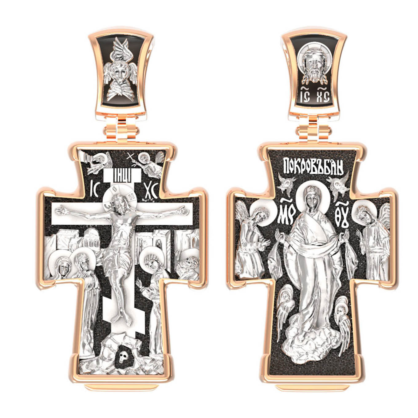 На обороте креста изображена икона Покрова Пресвятой Богородицы. Праздник Покрова Божией Матери является воспоминанием чуда, которое произошло во Влахнернской церкви 1 (14) октября 910 года: Пресвятая Богородица явилась верующим над алтарем храма и распростерла над ними Свое покрывало. В этот день Божия Матерь открыла людям, что Она является Ходатаицей за них перед Богом. Богородица простирает Свой молитвенный покров над всеми православными христианами и умоляет Сына Своего о даровании вечного спасения каждому человеку.