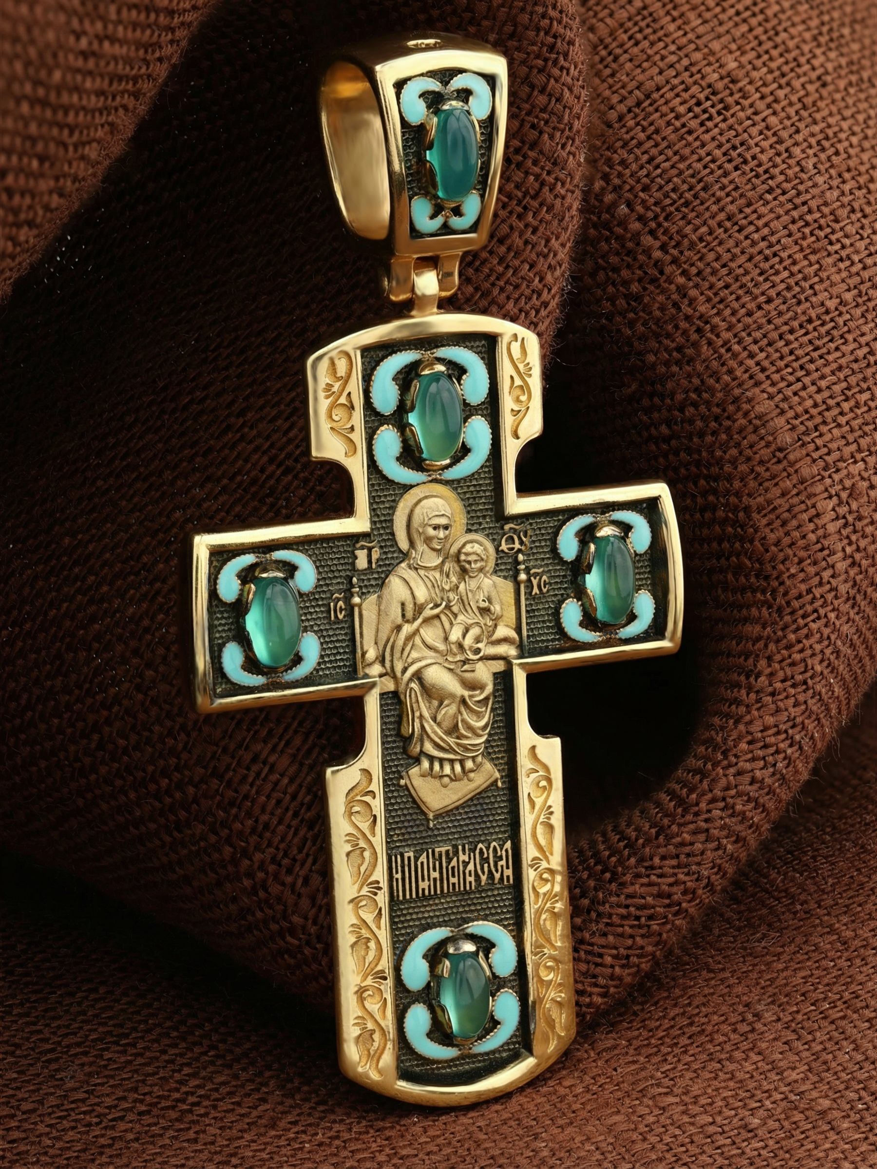 На оборотной стороне креста изображена икона Божией Матери «Всецарица» или «Пантанасса», на которой Пресвятая Богородица восседает на царском троне. На руках Ее — Богомладенец Христос со свитком в левой руке и благословляющий десницей. Правой рукой Богородица указывает на Своего Царственного Сына, как на Спасителя мира. Чудотворная икона была написана в XVII веке и находится на Святой Горе Афон, в одном из древних греческих монастырей — Ватопеде. По молитвам перед иконой совершается множество чудесных исцелений. Пречистая Богородица наставляет на праведный путь, помогает укрепить веру, найти утешение.