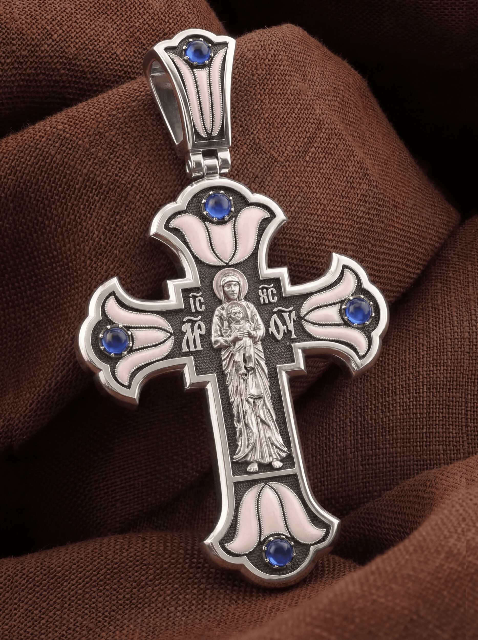 На лицевой стороне креста изображено Распятие Господа и Спасителя нашего Иисуса Христа. Христос, подвергнутый на кресте мучительной казни, своими страданиями искупил нас от древнего греха и даровал нам жизнь вечную. На верхней табличке, выше головы Иисуса, расположена надпись, составленная Понтием Пилатом — «IНЦI». Она означает «Иисус Назорей, Царь Иудейский». Надписи «IС» « ХС» означает Иисус Христос и слово «НИКА», что означает «победитель», помещается на разных сторонах поперечной перекладины креста. За крестом высится Иерусалимская стена, в знак того, что Господь был распят вне стен города. Крест стоит на горе камней, символизирующих Голгофу. Под подножием Креста изображена покоящаяся голова (череп) Адама, грехи которого Христос омыл Своею Кровью.