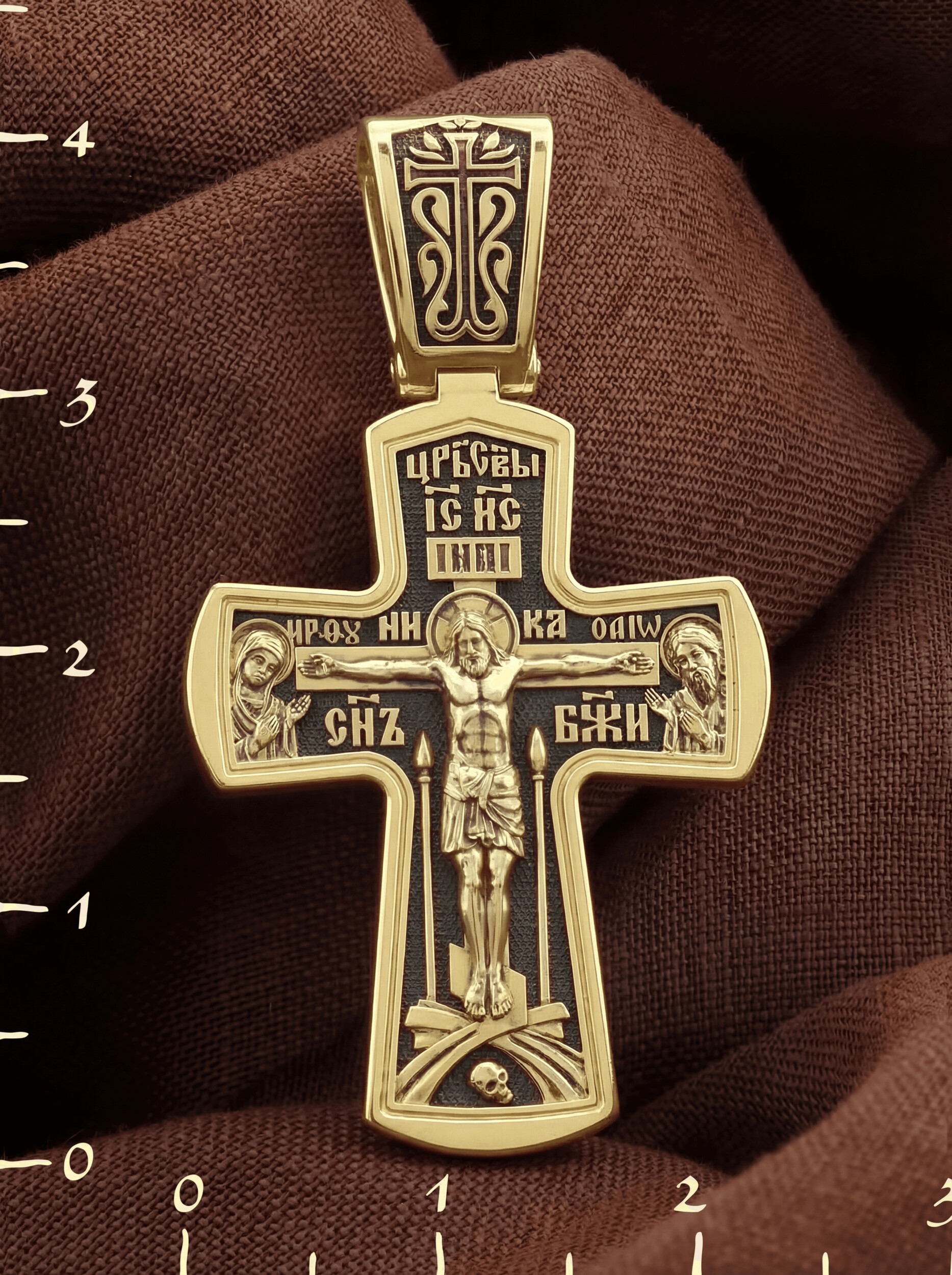 На лицевой стороне креста изображено Распятие Господа и Спасителя нашего Иисуса Христа, отдавшего Себя на смерть, для искупления грехов мира. Крест является символом жертвенной любви Всеблагого Бога к падшим людям, всепобеждающим духовным оружием христиан, основанием и средоточием церковной жизни. Господь сказал: «кто хочет идти за Мною, отвергнись себя, и возьми крест свой, и следуй за Мною». (Мк. 8: 34). На кулонном кольце изображен процветший крест. На верхней табличке, выше головы Иисуса, расположена надпись, составленная Понтием Пилатом — «IНЦI». Она означает «Иисус Назорей, Царь Иудейский». Распятие сопровождается каноническими надписями. Выше Распятия помещена надпись «Царь Славы» и надпись «IC» «ХC», означает Иисус Христос. Слово «НИКА», что означает «победитель» и надпись «Сын Божий», что означает божественную природу Иисуса Христа, помещаются на разных сторонах поперечной перекладины креста. Слева от Распятия изображена Пресвятая Богородица, справа — Про¬рок Предтеча и Креститель Господень Иоанн. Вдоль креста помещены Орудия Страстей Господних — копие сотника Лонгина и трость с губкой. Крест стоит на горе камней, символизирующих Голгофу. В ее основании различается череп– это голова Адама. На православном кресте Христос не умирает, а свободно простирает руки, ладони Иисуса открыты, будто он хочет обнять все человечество, даря им свою любовь и открывая путь к вечной жизни.