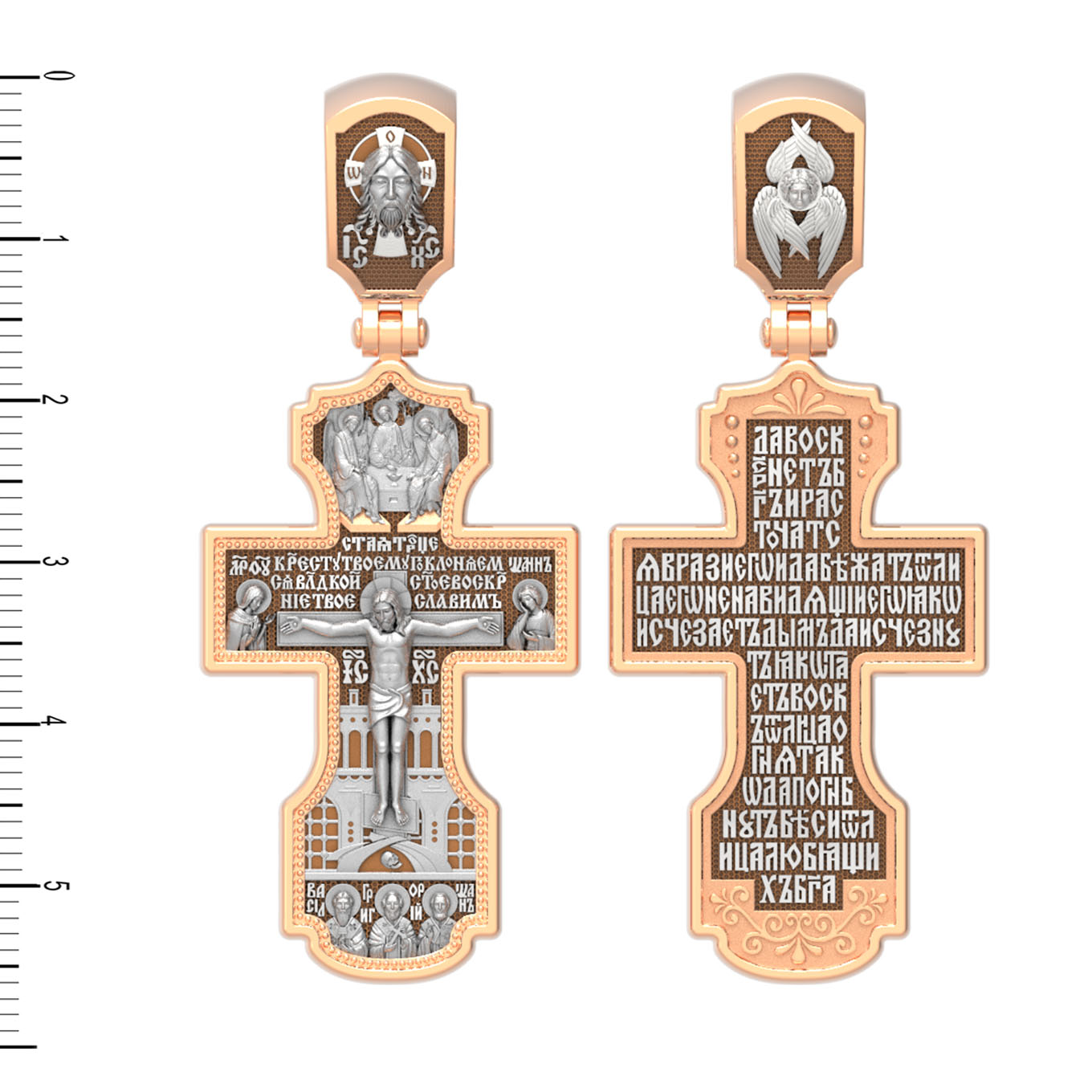На оборотной стороне креста помещена молитва Честному Кресту Господню: «Да воскреснет Бог, и расточатся врази Его, и да бежат от лица Его ненавидящии Его. Яко исчезает дым, да исчезнут; яко тает воск от лица огня, тако да погибнут беси от лица любящих Бога…». На кулонном кольце изображен шестикрылый Серафим.