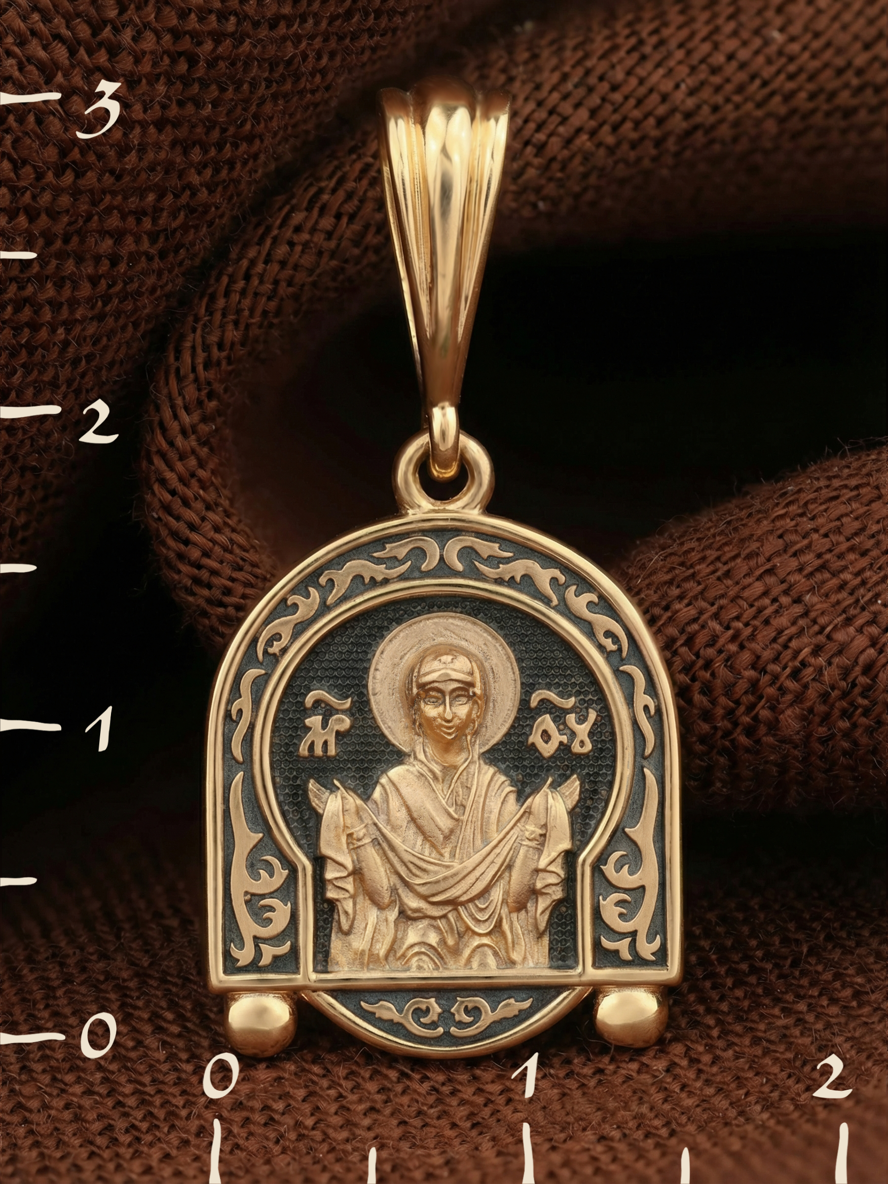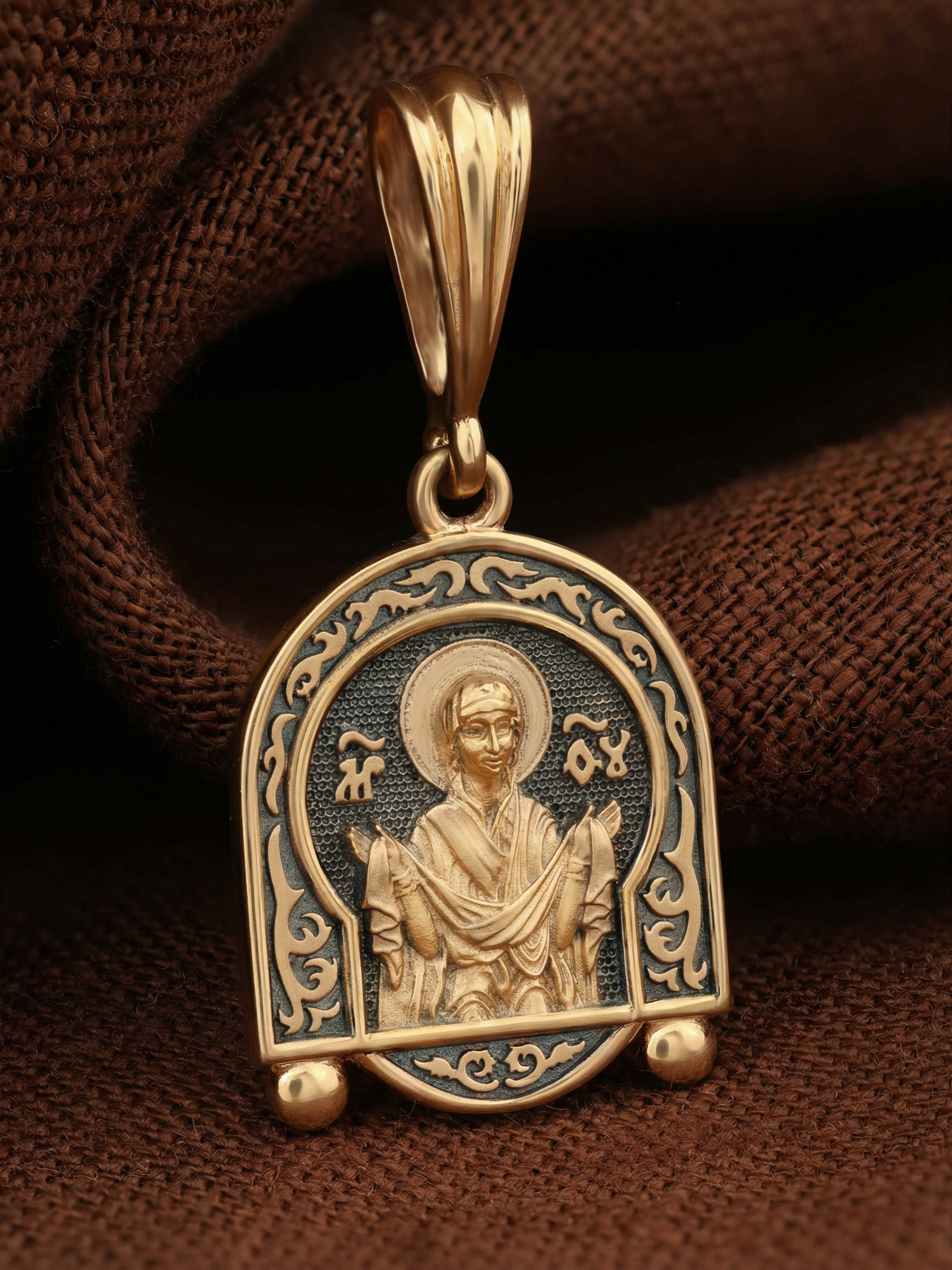 На лицевой части образка изображена икона Покров Пресвятой Богородицы. Праздник Покрова Божией Матери является воспоминанием чуда, которое произошло во Влахнернской церкви 1 (14) октября 910 года: Пресвятая Богородица явилась верующим над алтарем храма и распростерла над ними Свое покрывало. В этот день Божья Матерь открыла людям, что Она является Ходатаицей за них перед Богом. Богородица простирает Свой молитвенный покров над всеми православными христианами и умоляет Сына Своего о даровании вечного спасения каждому человеку.