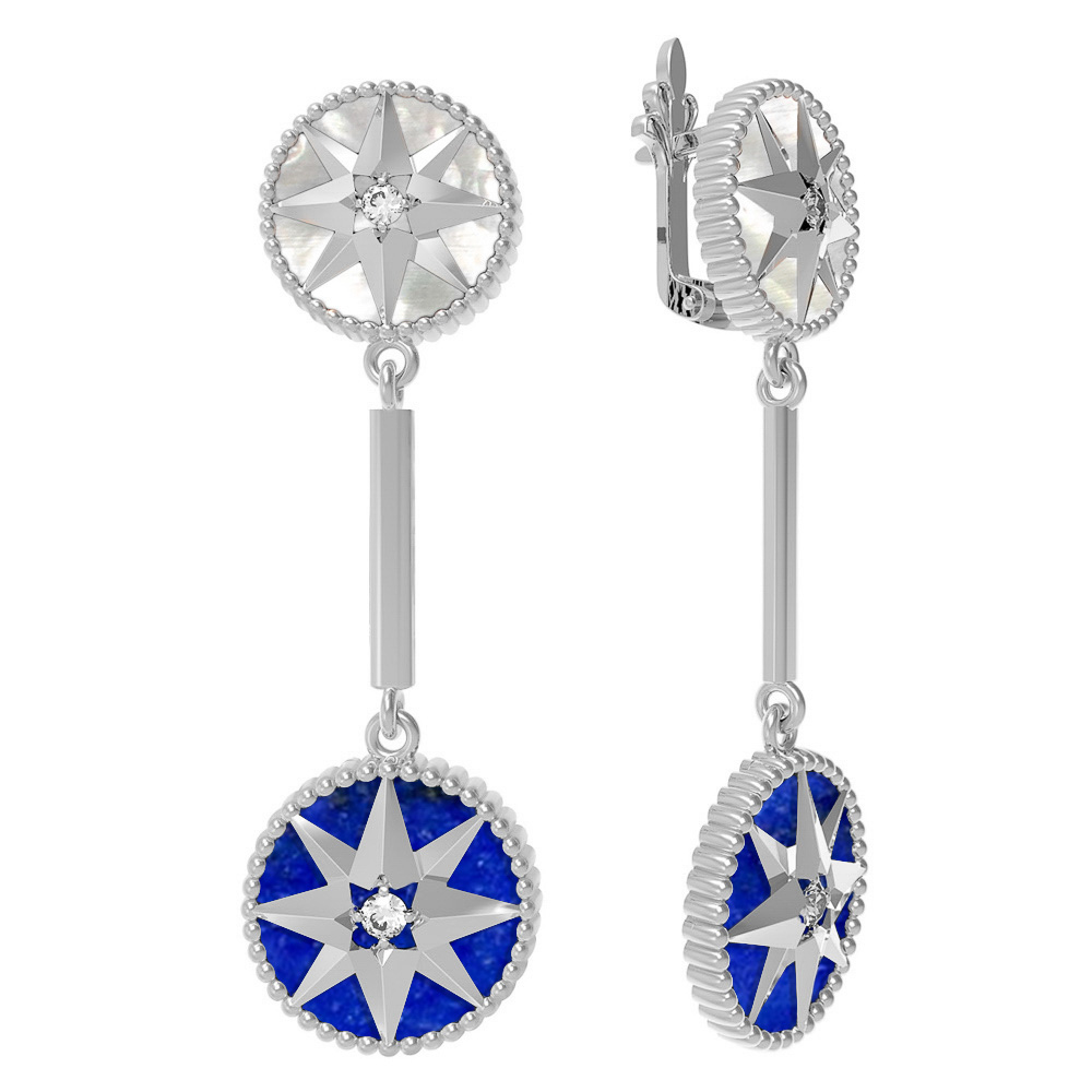 Серьги из белого золота c фианитом, лазуритом и перламутром