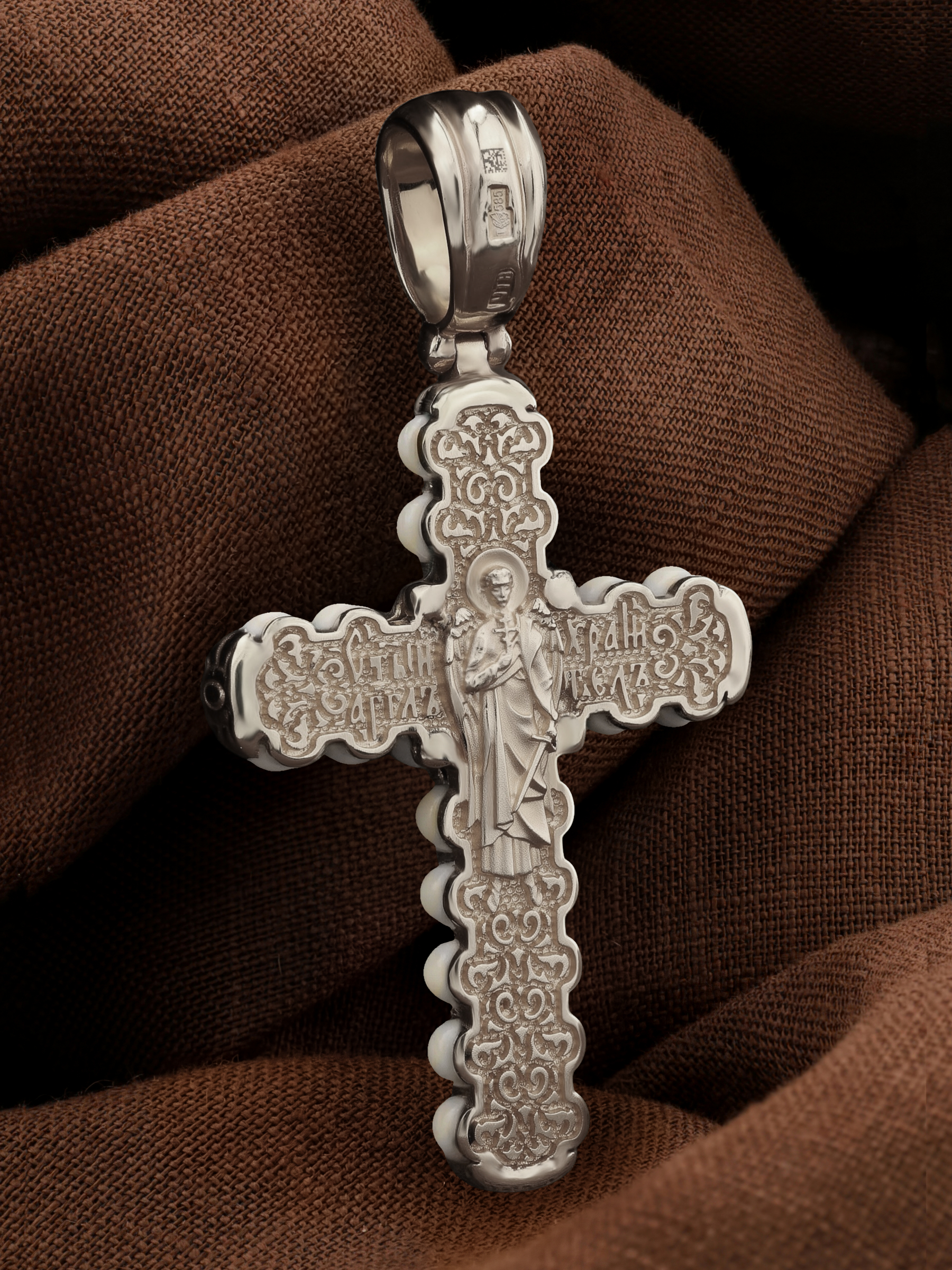 Крест из белого золота c кахолонгом