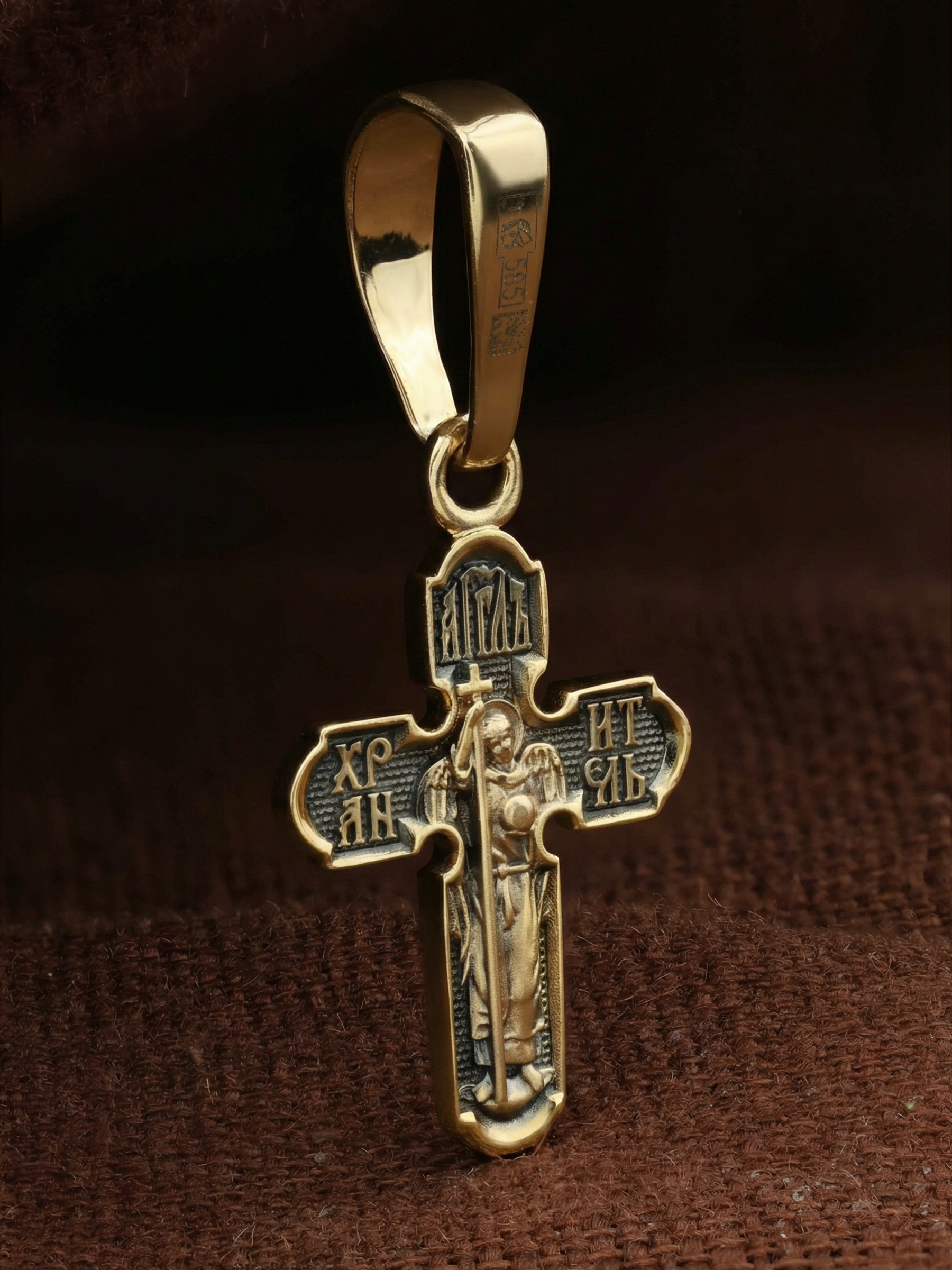На оборотной стороне креста изображен святой Ангел-Хранитель в виде прекрасного юноши держащего в правой руке крест, а в левой — сферу. Ангел-Хранитель — это Ангел приставляемый Богом к человеку при крещении для охраны и помощи в добрых делах. Невидимо пребывая при нас постоянно, он, руководствуя нас ко спасению, не только по нашему желанию таинственно наставляет нас на все доброе и полезное, не только возносит наши молитвы к Богу, но еще и сам от себя охраняют и защищают нас от врагов видимых и невидимых, ходатайствует за нас пред Богом.
