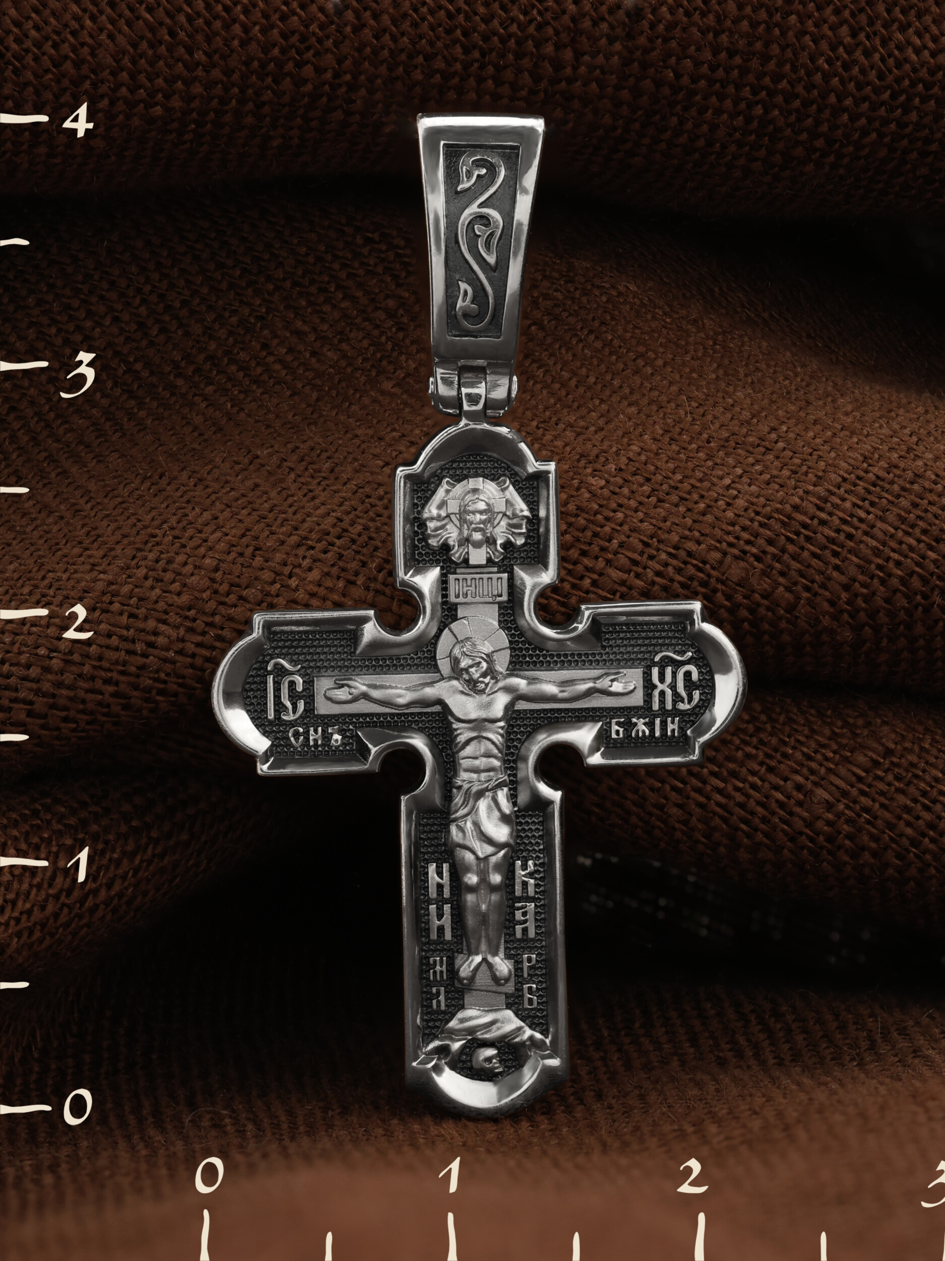 На лицевой стороне нательного креста по традиции изображено Распятие Господа нашего Иисуса Христа. Крест Господень стоит на небольшом каменистом возвышении, символизирующем гору Голгофу, которая обозначена буквами МЛРБ (Место Лобное Рай Бысть). Над головой Господа на поперечной перекладине написано «ИНЦИ», что символизирует табличку, которая была прибита к Кресту, с надписью «Иисус Назорей Царь Иудейский». Этим иудеи хотели посмеяться над Христом, не зная, что распинают истинного Царя всех царей. По сторонам основной перекладины расположены позолоченные рельефные инициалы Христа «ИС ХС». Под перекладиной, по сторонам древа, находится надпись «СЫН БОЖИЙ», а в основании креста — надпись «НИКА» (Победитель).
