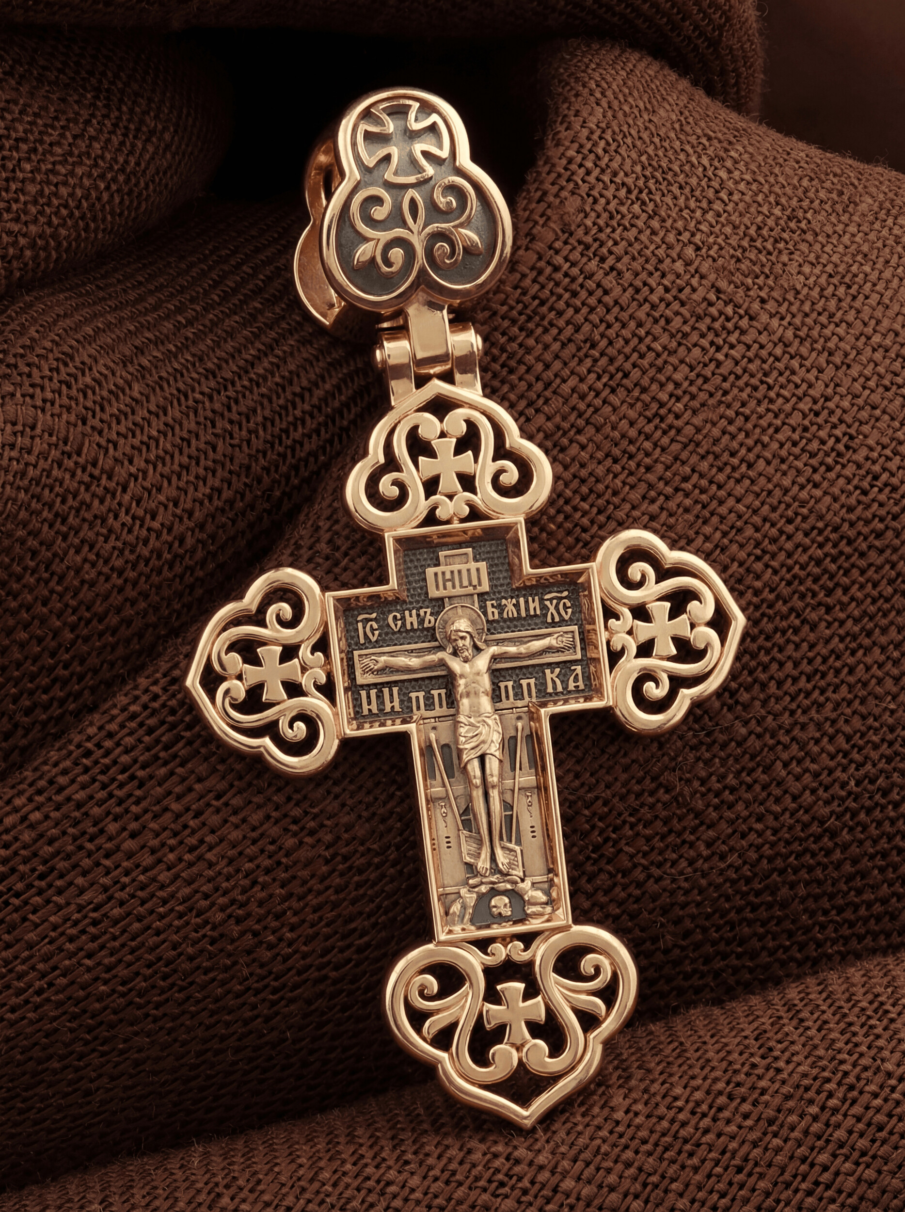 На лицевой стороне изображено Распятие. Над титлом видим слова «ЦРЬ СЛВЫ» — Царь Славы. Верхняя перекладина символизирует собой табличку с надписью «IHЦI» — Иисус Назарянин Царь Иудейский. Над перекладиной пишется сокращенно имя Спасителя «IC XC» — Иисус Христос и словосочетание «СНЪ БЖIЙ» — СЫН БОЖИЙ. Ниже перекладины добавляется «НИКА» (греч. — Победитель). Возвышение, на котором стоит Крест, символизирует гору Голгофу, на которой произошло Распятие. У подножия Креста изображают прах Адама, обозначенный черепом. Рядом с Крестом из горы выступают орудия страданий Господа — трость и копие, обозначенные буквами Т и К.