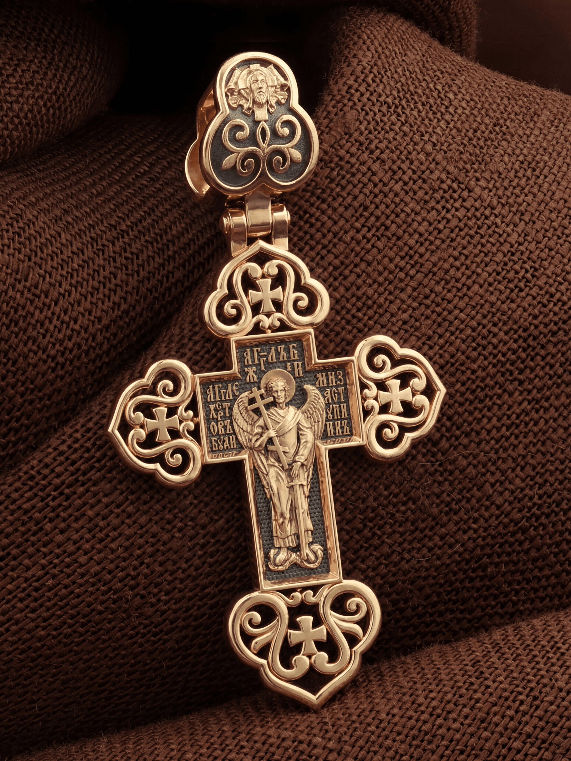 Оборотную сторону креста возглавляет Ангел Хранитель с крестом и мечом: ими он защищает человека от злых духовных и физических нападений. Ангел не может нарушить свободу воли человека, поэтому его надо молитвенно просить о помощи: «Ангеле Христов, буди ми заступник», — эта молитва написана вокруг его образа. На кулонном кольце изображен Спас Нерукотворный — Символ вочеловечившегося Божества.