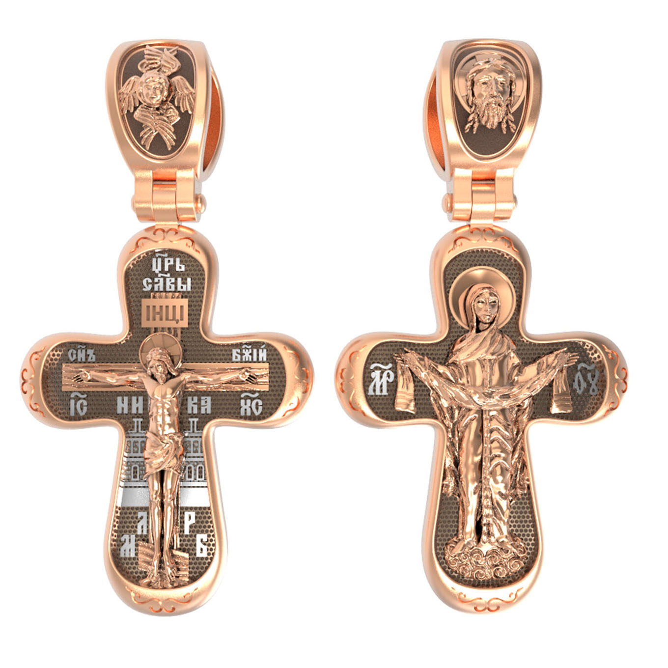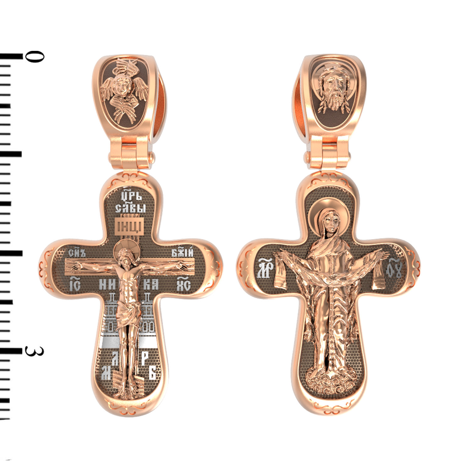 На обороте креста изображена икона Покрова Пресвятой Богородицы. Праздник Покрова Божией Матери является воспоминанием чуда, которое произошло во Влахнернской церкви 1 (14) октября 910 года: Пресвятая Богородица явилась верующим над алтарем храма и распростерла над ними Свое покрывало. В этот день Божья Матерь открыла людям, что Она является Ходатаицей за них перед Богом. Богородица простирает Свой молитвенный покров над всеми православными христианами и умоляет Сына Своего о даровании вечного спасения каждому человеку. На кулонном кольце изображен Спас Нерукотворный — Символ вочеловечившегося Божества и шестикрылый Серафим — самый приближенный к Господу Ангел.
