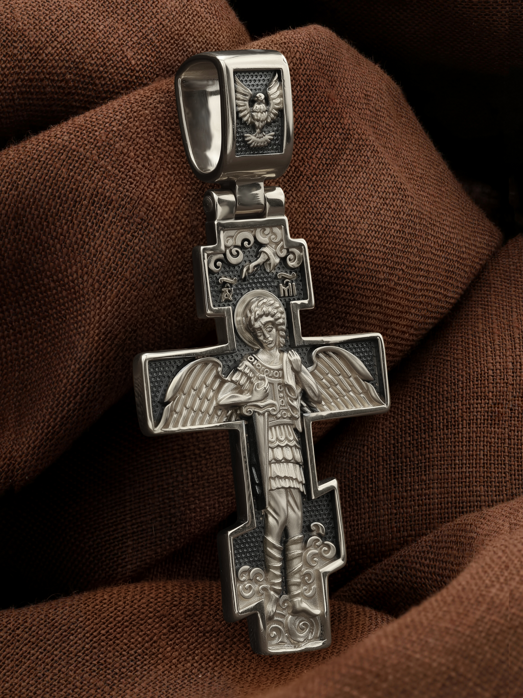 На оборотной стороне креста помещен Архангел Михаил, самый могущественный из ангелов. Это он низверг дьявола и встал во главе ангелов для борьбы с бесовскими силами. Его имя означает «Кто яко Бог?», так как он самый могучий и грозный враг зла. Древнерусские князья и воины стремились обрести покровительство Небесного Воеводы и нередко украшали свои шлемы его крылатой фигурой. На Руси также верили, что Архангел Михаил, как непримиримый враг дьявола, защищает и души умерших от бесовских нападений, провожая их на Небеса. Поэтому ему часто посвящались кладбищенские церкви.