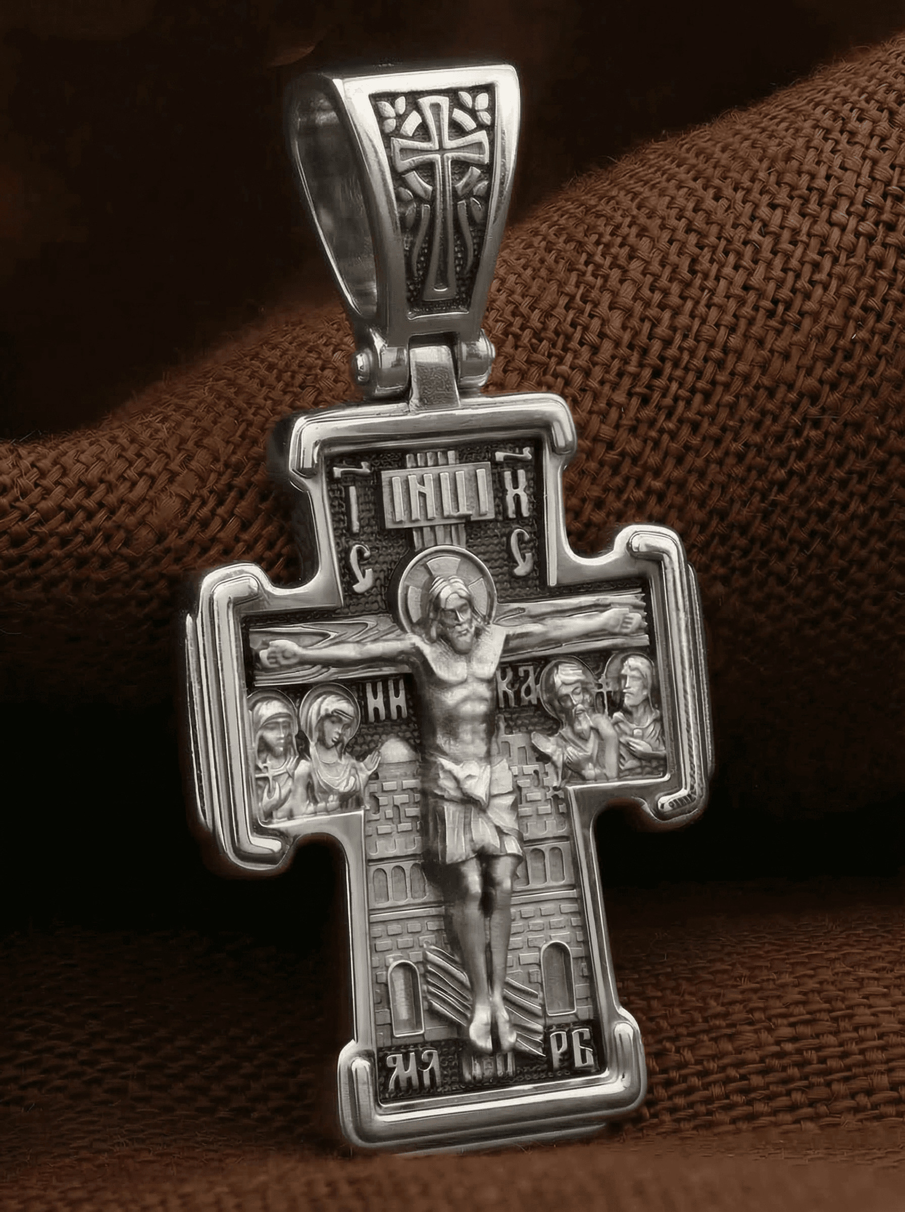 На лицевой стороне креста изображено Распятие Господа и Спасителя нашего Иисуса Христа. Крест- символ спасения и искупления рода человеческого, знамение победы над смертью и адом. Иисус Христос, как искупительная жертва освобождения человечества от власти греха, умер крестной смертью и в третий день воскрес. На верхней табличке, выше головы Иисуса, расположена надпись, составленная Понтием Пилатом — «IНЦI». Она означает «Иисус Назорей, Царь Иудейский». Рядом расположена надпись «IС» « ХС». Она означает Иисус Христос. Ниже — слово «НИКА», что означает «победитель». Слева от Распятия — Пресвятая Богородица и святая мироносица Мария Магдалина с крестом в руке. Справа — апостол и евангелист Иоанн Богослов, один из ближайших учеников Иисуса Христа, и сотник Лонгин с крестом в правой руке и копьем — в левой. За крестом высится Иерусалимская стена. Надпись «МЛРБ» — «место лобное рай бысть» означает, что место лобное стало раем, помещается в нижней части креста. На кулонном кольце помещен крест.