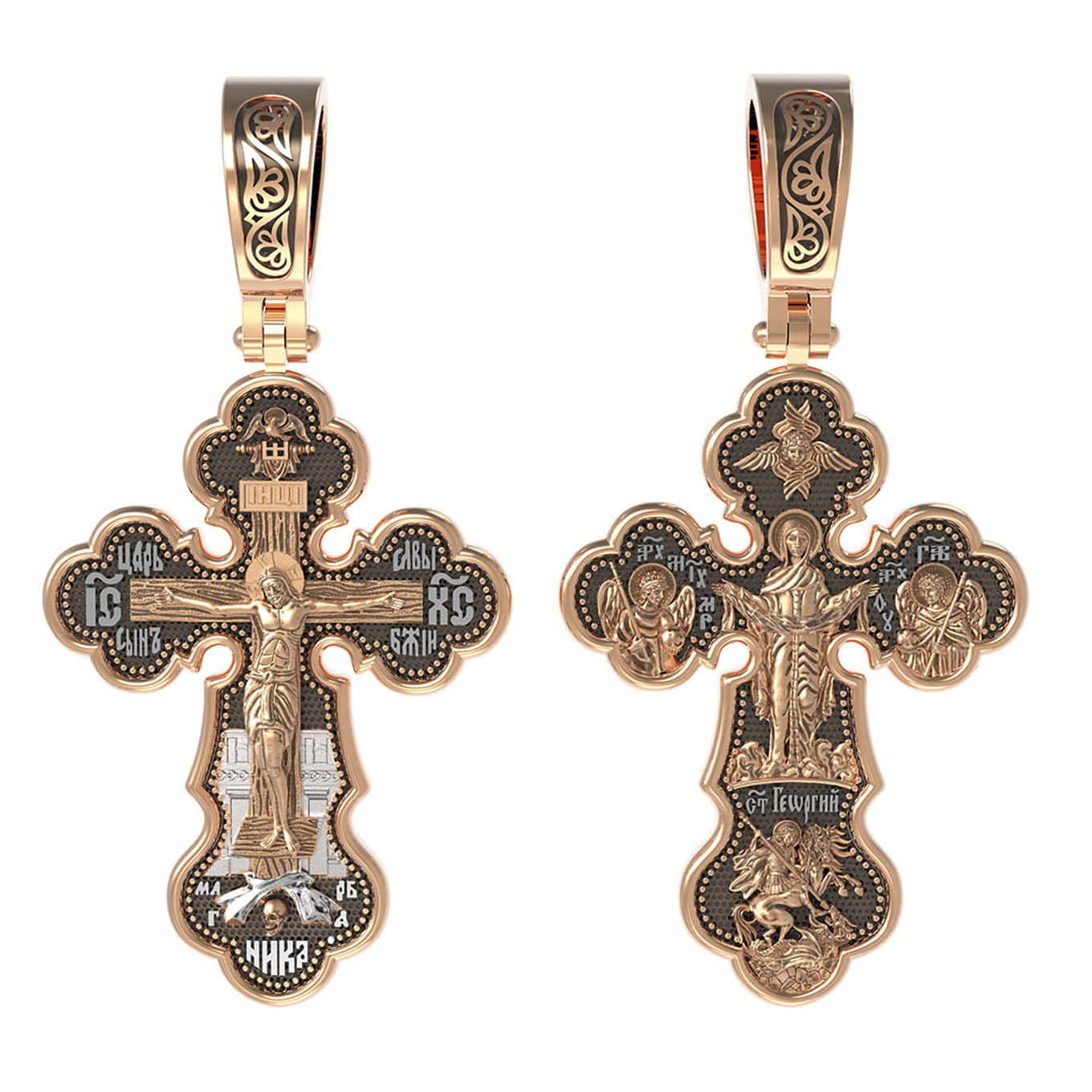 Центральную часть оборотной стороны креста украшает икона Божией Матери «Покров Пресвятой Богородицы». Праздник Покрова Пресвятой Богородицы пришел на Русь в XII веке из Византии и стал одним из самых почитаемых. Пресвятая Богородица простирает Свой молитвенный покров над всеми православными христианами и умоляет Сына своего о даровании вечного спасения каждому человеку. Над образом помещен шестикрылый Серафим. Справа помещено изображение Архангела Гавриила, слева- Архангела Михаила. На кресте внизу помещено изображение Святого Великомученика Георгия Победоносца — одного из самых почитаемых и удивительных святых. Он изображен как воитель, сидящий на вздыбленном коне и поражающий копьем огнедышащего змея. Змей символизирует собою сатанинские силы.