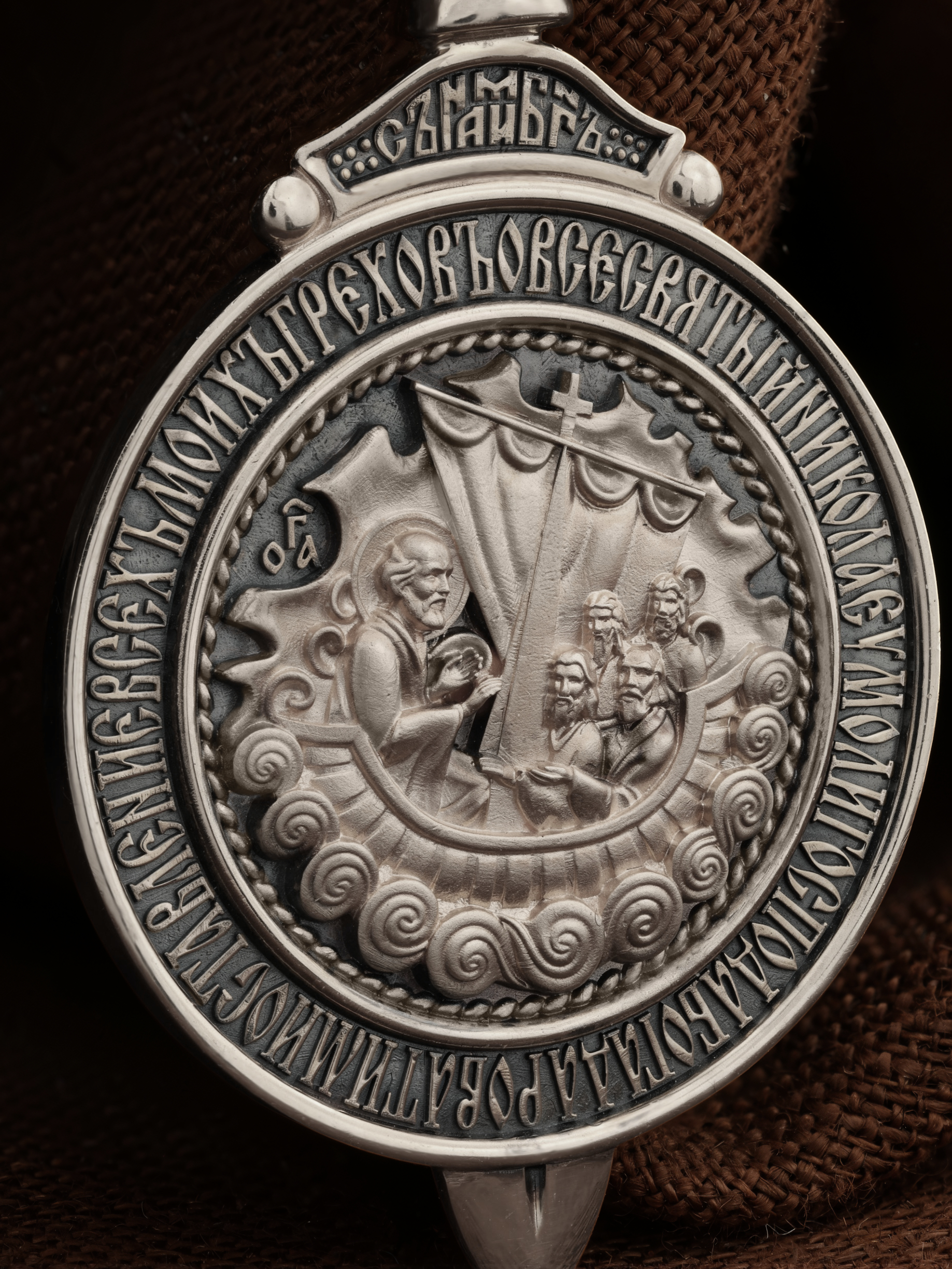 На оборотной стороне образка изображен Святитель Николай Чудотворец, архиепископ Мир Ликийских. Он является одним из самых почитаемых святых в православном мире, издревле считающийся помощником и молитвенником за всех, притекающих к нему. Вся жизнь святого Николая — это служение Богу. Чудес его исчислить невозможно. Одним из чудес было спасение Святым Угодником Николаем погибающих во время шторма моряков. Они никогда не видели епископа города Миры, но слышали о его чудесной помощи. В отчаянии они молитвенно воззвали к нему, и тот неожиданно появился на корме у руля и благополучно привел корабль в гавань. Этот сюжет изображен на образке и обрамлен словами молитвы: « О всесвятый Николае, умоли Господа Бога даровати ми оставление всех моих грехов».