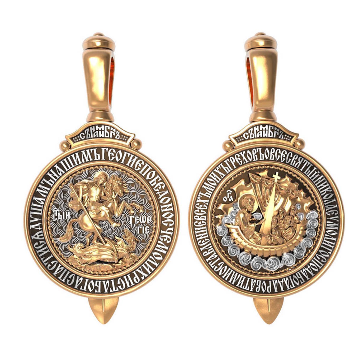 Основой композиции лицевой стороны является изображение Святого Георгия Победоносца. Святой Георгий один из наиболее почитаемых святых в Христианской Церкви. На Руси он известен как Юрий или Егорий, покровитель воинов, помощник в крестьянском труде. На образке изображено самое знаменитое чудо святого: спасение принцессы от змея, которому она предназначалась в жертву. Чудо это имеет символическое толкование. Принцесса означает душу человеческую, а змей — дьявола, желающего ее поглотить. Святой Георгий, небесный защитник, спускается с Небес, чтобы помочь душе избавиться от гибели. По контуру образка написана молитва: «Геогрие Победоносче, моли Христа Бога спастися душам нашим».
