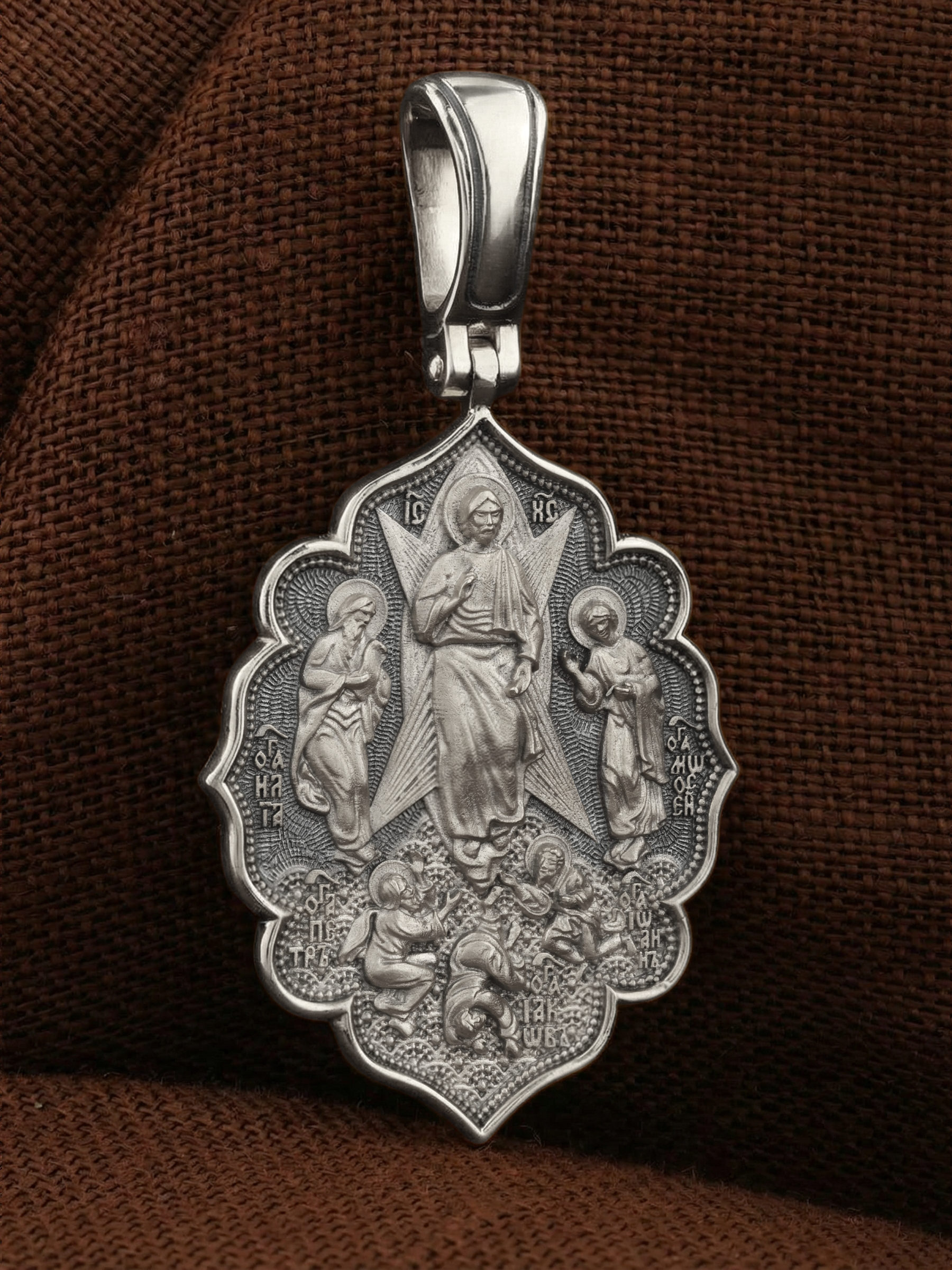 На лицевой стороне образка изображена икона «Преображение». Образ являет Господа Иисуса Христа в тот момент, когда Он предстал трем Своим ученикам: Петру, Иакову и Иоанну Богослову. Пророки Моисей и Илия предстояли рядом и беседовали с Ним. Апостолы едва могли вынести бесконечную радость, которая охватила их в присутствии Бога. Когда же на гору спустилось облако и раздался глас Божий: «Сей есть Сын Мой Возлюбленный; Его слушайте», апостолы в сильном страхе пали на землю (Лк. 9:35). На иконах «Преображение» они так и изображаются — лежащими у ног Христа.