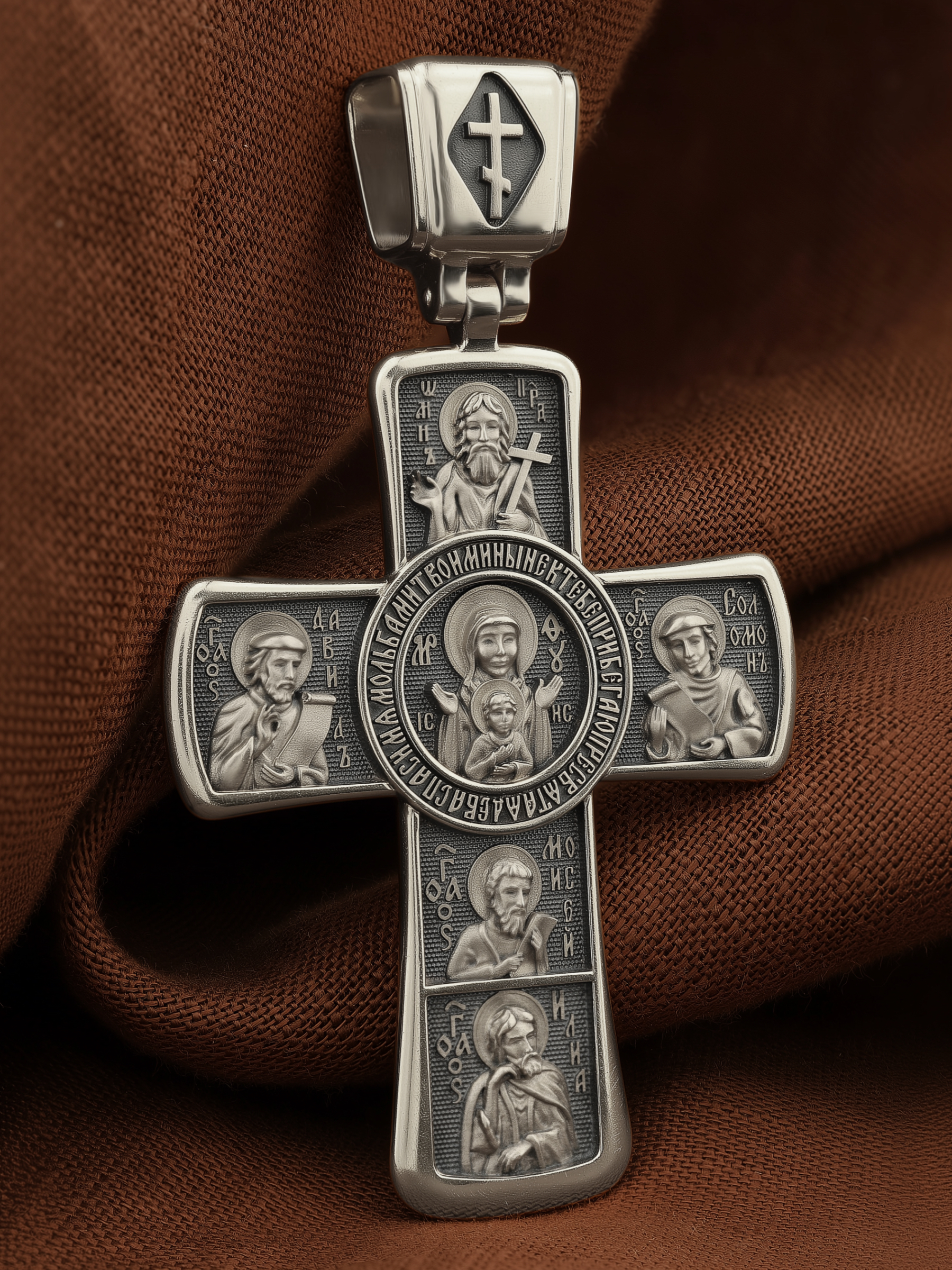 Центральную часть оборота креста украшает икона Божией Матери «Знамение». Вокруг Ее образа написана молитва: «Ныне к Тебе прибегаю, Пресвятая Дева, спаси мя мольбами Твоими».