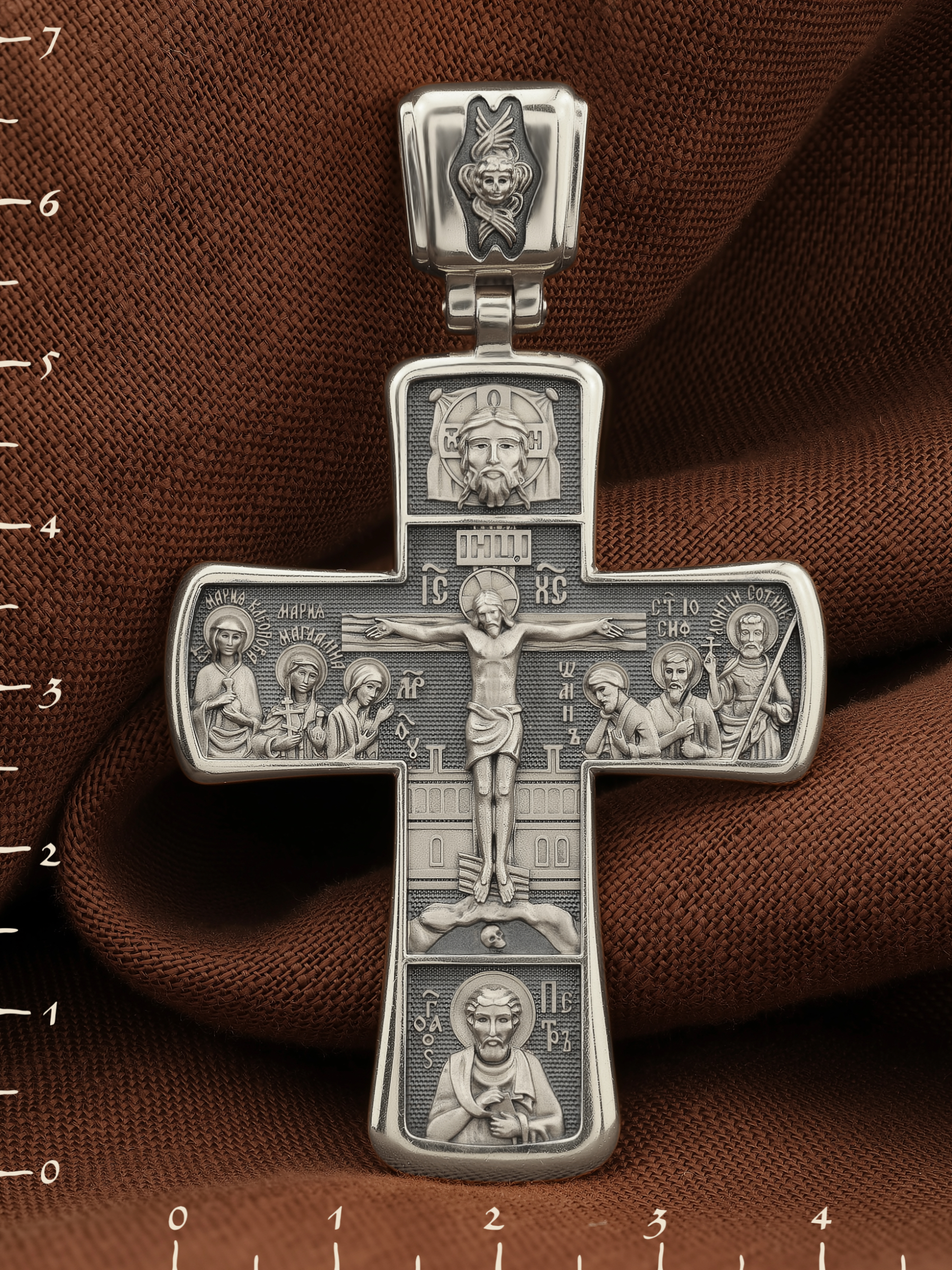 На лицевой стороне креста изображено Распятие Господа Иисуса Христа с предстоящими Ему святыми, которые, по преданию, находились у Креста Господа во время Его казни. Слева — Пресвятая Богородица и жены-мироносицы — равноапостольная Мария Магдалина и святая Мария Клеопова, справа — апостол Иоанн Богослов, прав. Иосиф Аримофейский и мч. Лонгин Сотник.
