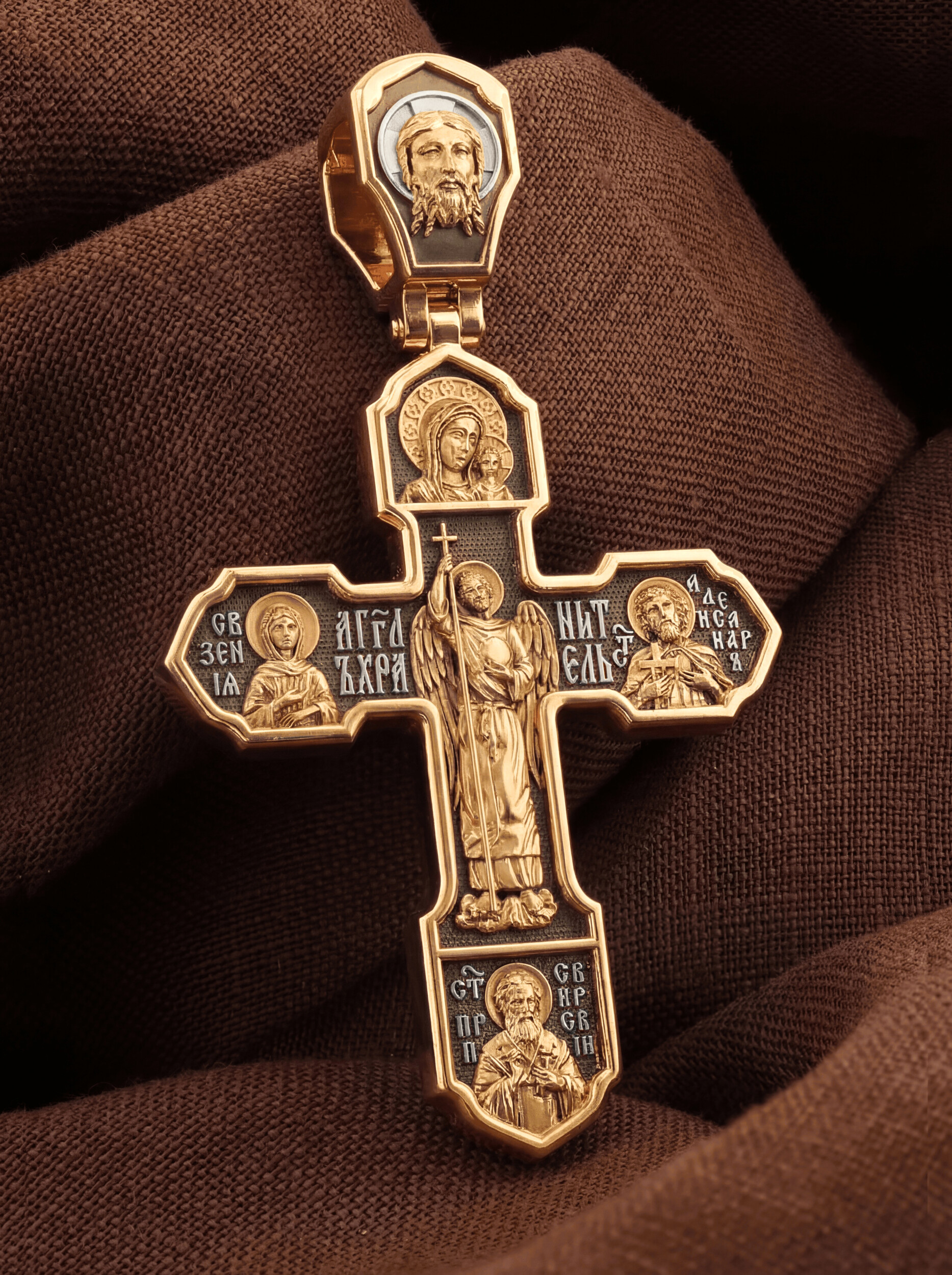 На лицевой стороне изображено Распятие Господа Иисуса Христа, над вершиной которого помещены титлы Его святого имени — «ИС ХС». Под основной перекладиной надписи — «НИКА», что в переводе с греческого означает «победитель», и словосочетание «СЫН БОЖИЙ», что означает божественную природу Иисуса Христа. С двух сторон Христу предстоят Пресвятая Богородица и св. Андрей Первозванный. Внизу — образ Архангела Михаила, могучего защитника от злых сил. Это он низверг дьявола и встал во главе ангелов для борьбы с бесовскими силами. Его имя означает «Кто яко Бог?».