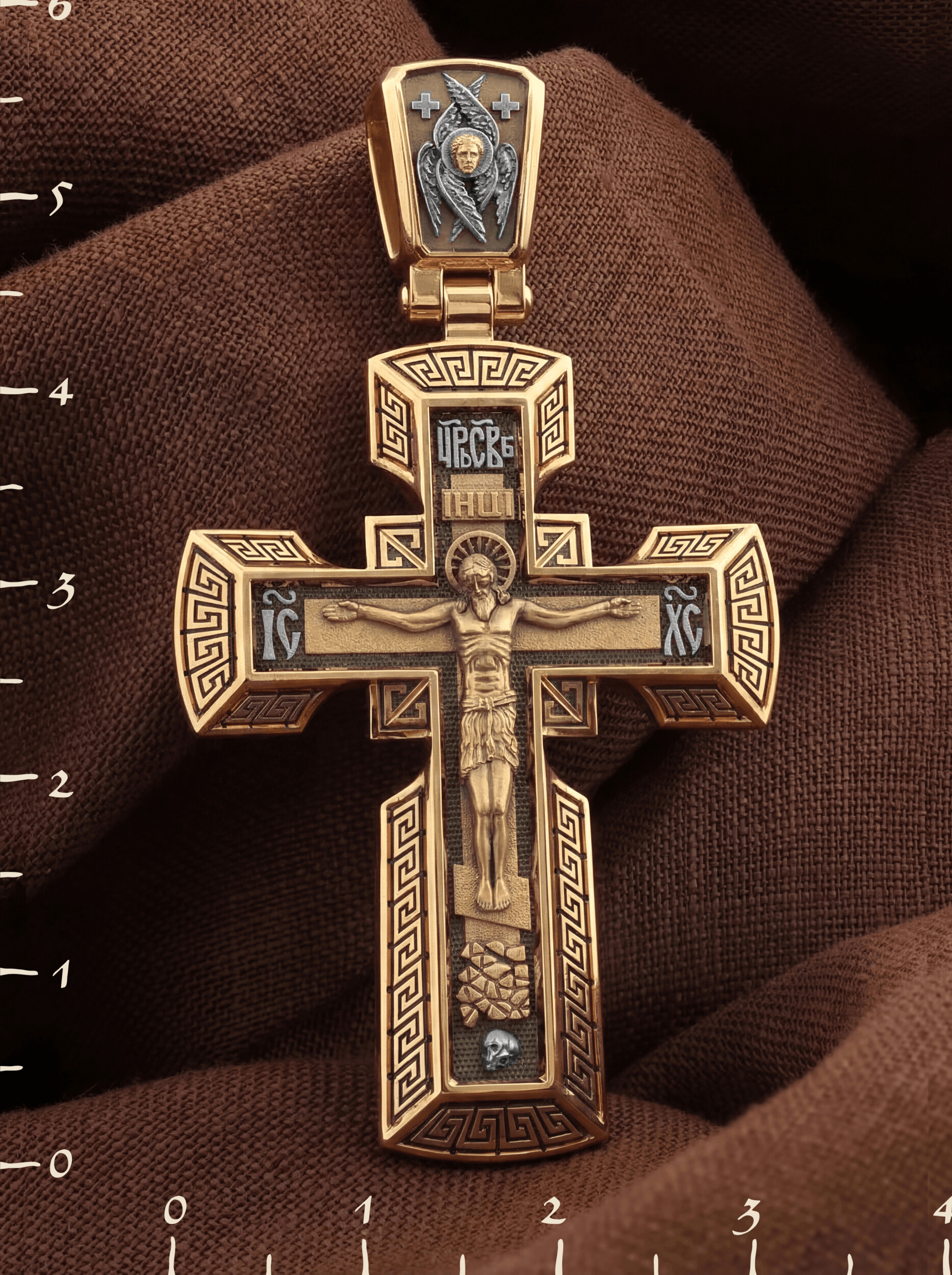 Рамка, украшенная византийским орнаментальным мотивом, обрамляет простой и очень традиционный нательный крест.