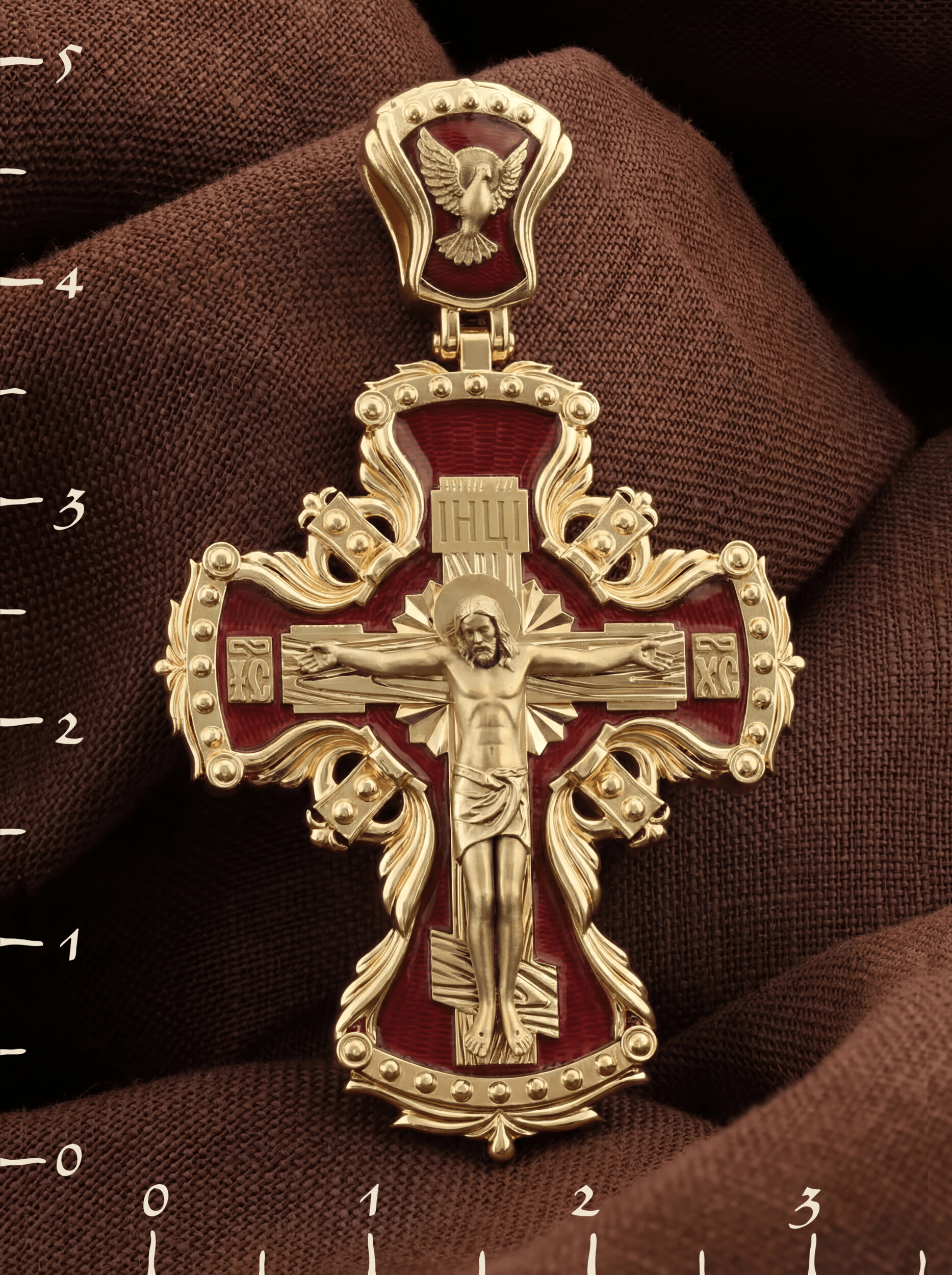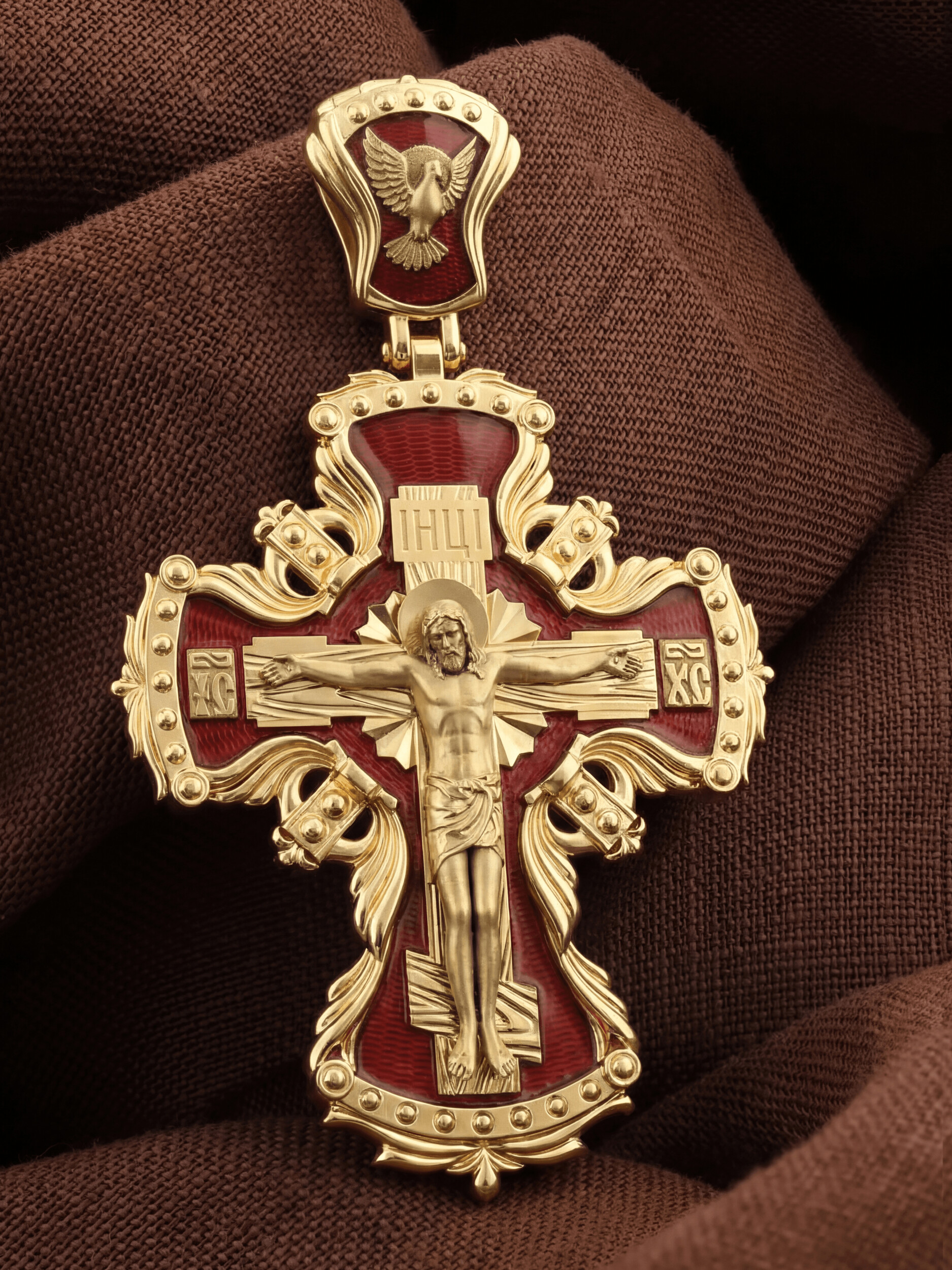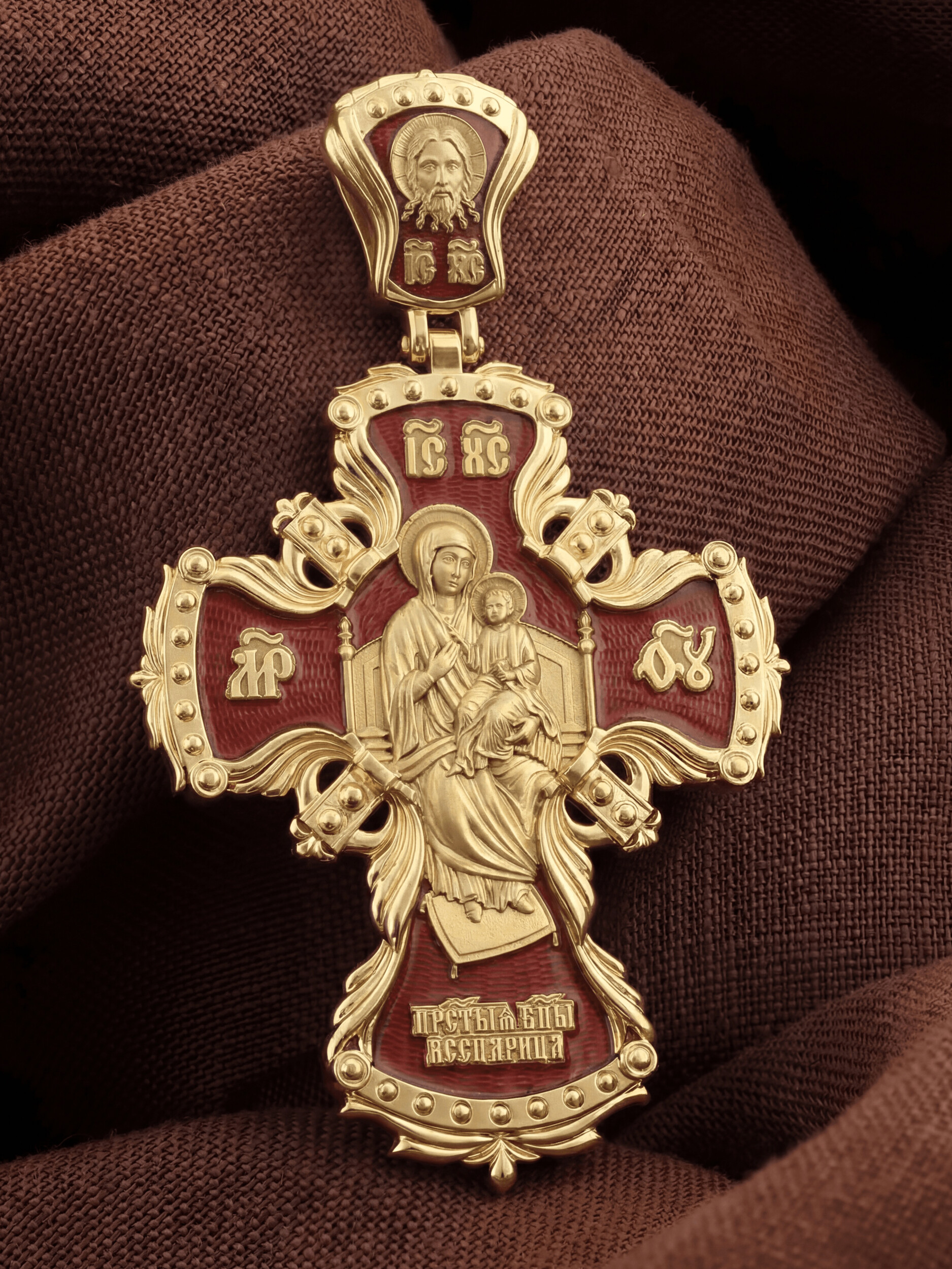Центральную часть лицевой стороны занимает Распятие Христа — образ жертвы, принесенной Господом за грехи людей. Именно ко Христу, сошедшему на землю ради нашего спасения, возносятся все молитвы. Рядом с Его образом помещены слова — «НИКА» и «СЫН БОЖИЙ». Эти слова характеризуют Господа как Великого Архиерея, победителя смерти. Также Распятие сопровождается надписями, олицетворяющими Христа — это святое имя Христа «IC» (Иисус) «ХС» (Христос). На кулонном кольце изображен голуь — символ Святого Духа.
