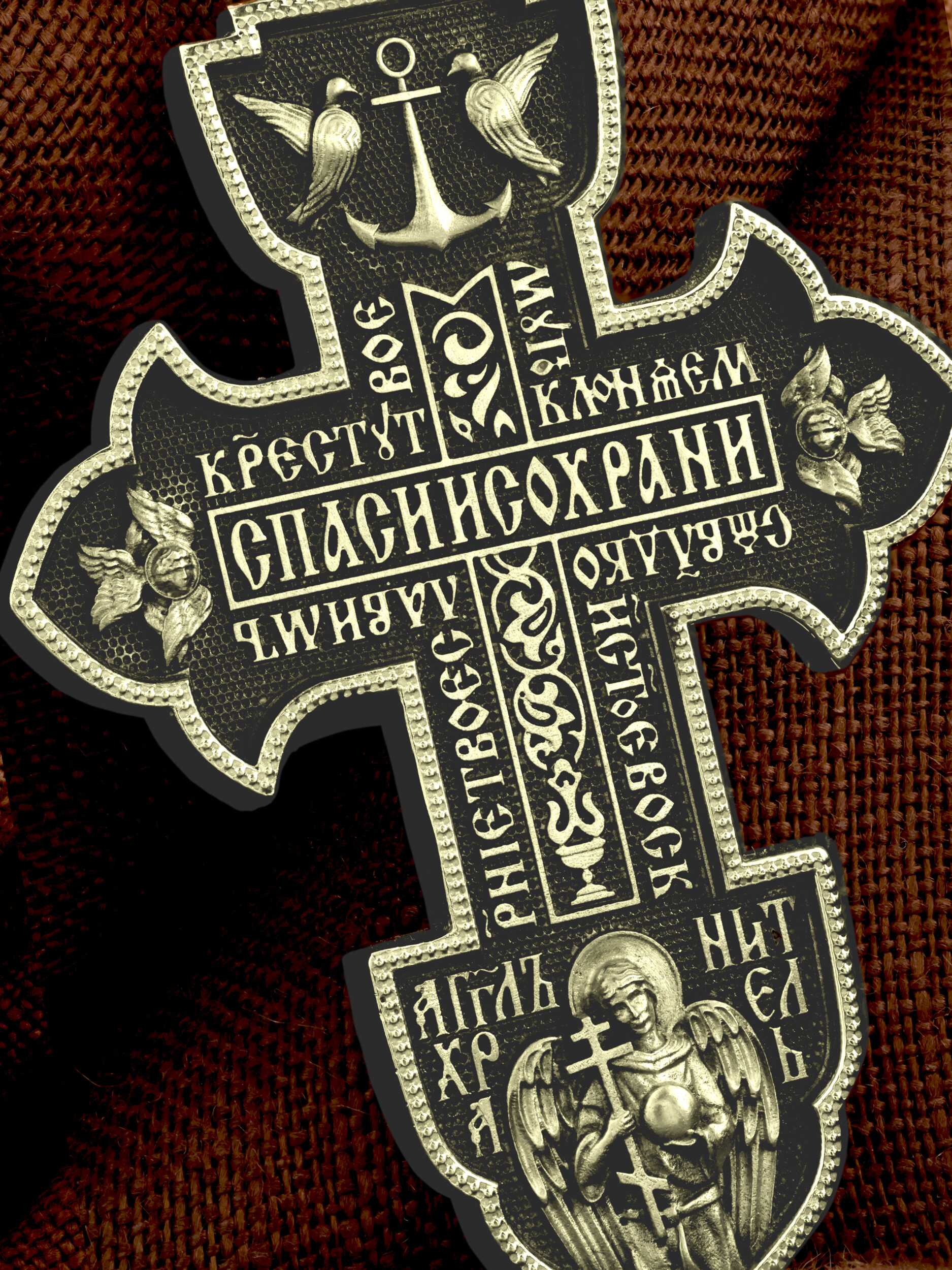 В центральной части оборотной стороны креста написана молитва: «Спаси и сохрани». Рядом — песнь: «Кресту Твоему поклоняемся, Владыко, и святое Воскресение Твое славим». Ниже изображен святой Ангел-Хранитель в виде прекрасного юноши держащего в правой руке крест, а в левой — сферу.. На кулонном кольце изображен Ангел Серафим.