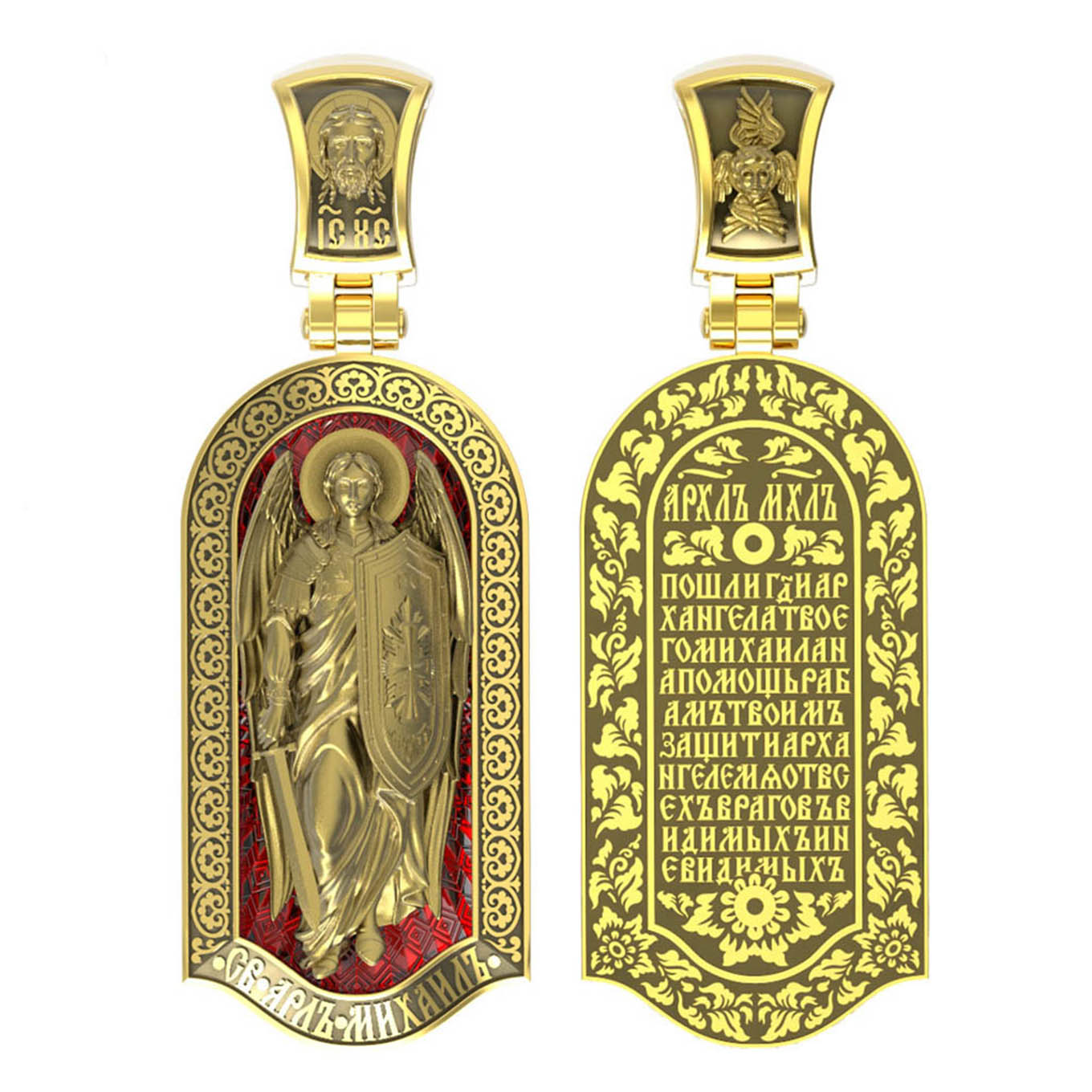 Основой композиции лицевой стороны является ростовое изображение Архангела Михаила — Архистратига всех Небесных Воинств. Он ведет непримиримую войну против сил зла, охраняет райские врата и защищает души людей. Его имя означает «Кто яко Бог?», так как он самый могучий и грозный враг зла. Он первым ополчился на Денницу, когда тот восстал против Бога, низверг его с Неба и не перестает сражаться с его темным воинством. Поэтому он часто изображается в виде воина, в доспехах и с огненным мечом. Но как служитель Небесного Царя и глава Ангелов и Архангелов на многих иконах он предстает в богатой одежде византийских придворных.