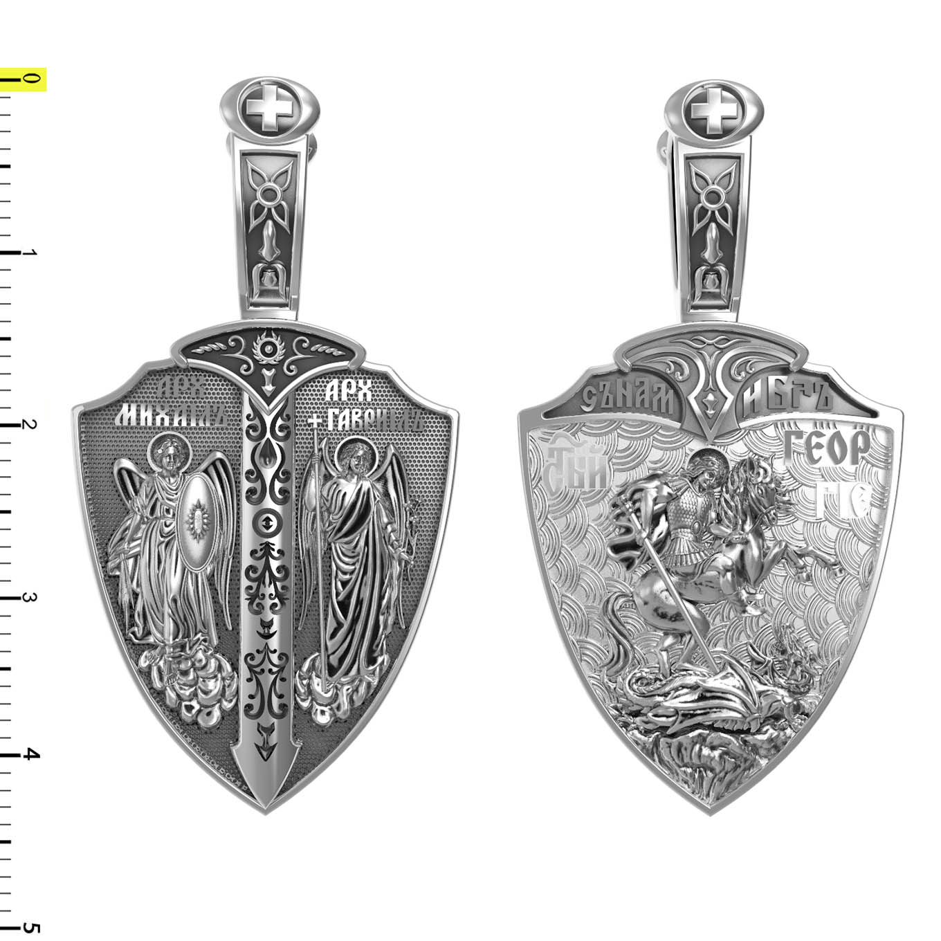 Образок выполнен в виде воинского щита и меча. На лицевой стороне образка изображены Архангел Михаил и Архангел Гавриил. Архангел Михаил изображен в воинственном виде с огненным мечом в правой руке и щитом в левой руке. Архангел Михаил — верный служитель Божий, который низринул с Неба возгордившегося денницу с другими павшими духами. В Православии его называют Архистратигом, что означает глава святого воинства Ангелов и Архангелов. Архангел почитается как покровитель воинов и всех верных Богу и ведущих борьбу против сил зла, борец против ересей, а также защитник душ умерших, страж райских врат. Архангел Гавриил изображен с крестом в правой руке и цветком лилии в левой руке. Он несколько раз упоминается в Писании, как Небесный вестник, которого Бог посылает, чтобы возвестить людям Свои планы о спасении рода человеческого. Так, Архангел Гавриил несколько раз являлся пророку Даниилу и раскрывал ему тайны пришествия Мессии, гонений антихриста и конца мира (Дан. 8, 16, 9−21). Перед пришествием Сына Божия в мир архангел Гавриил явился в храме старцу Захарии и сообщил ему о чудесном зачатии Предтечи. Через шесть месяцев он явился в Назарете Деве Марии с вестью об избрании Ее быть Матерью Христа Спасителя (Лк. 1). Когда Господь перед Своими страданиями молился в Гефсиманском саду до кровавого пота, на укрепление Его, по Церковному Преданию, был послан с Небес Архангел Гавриил. (Лк.22:43). Жены мироносицы услышали от Архистратига радостную весть о Воскресении Христовом.