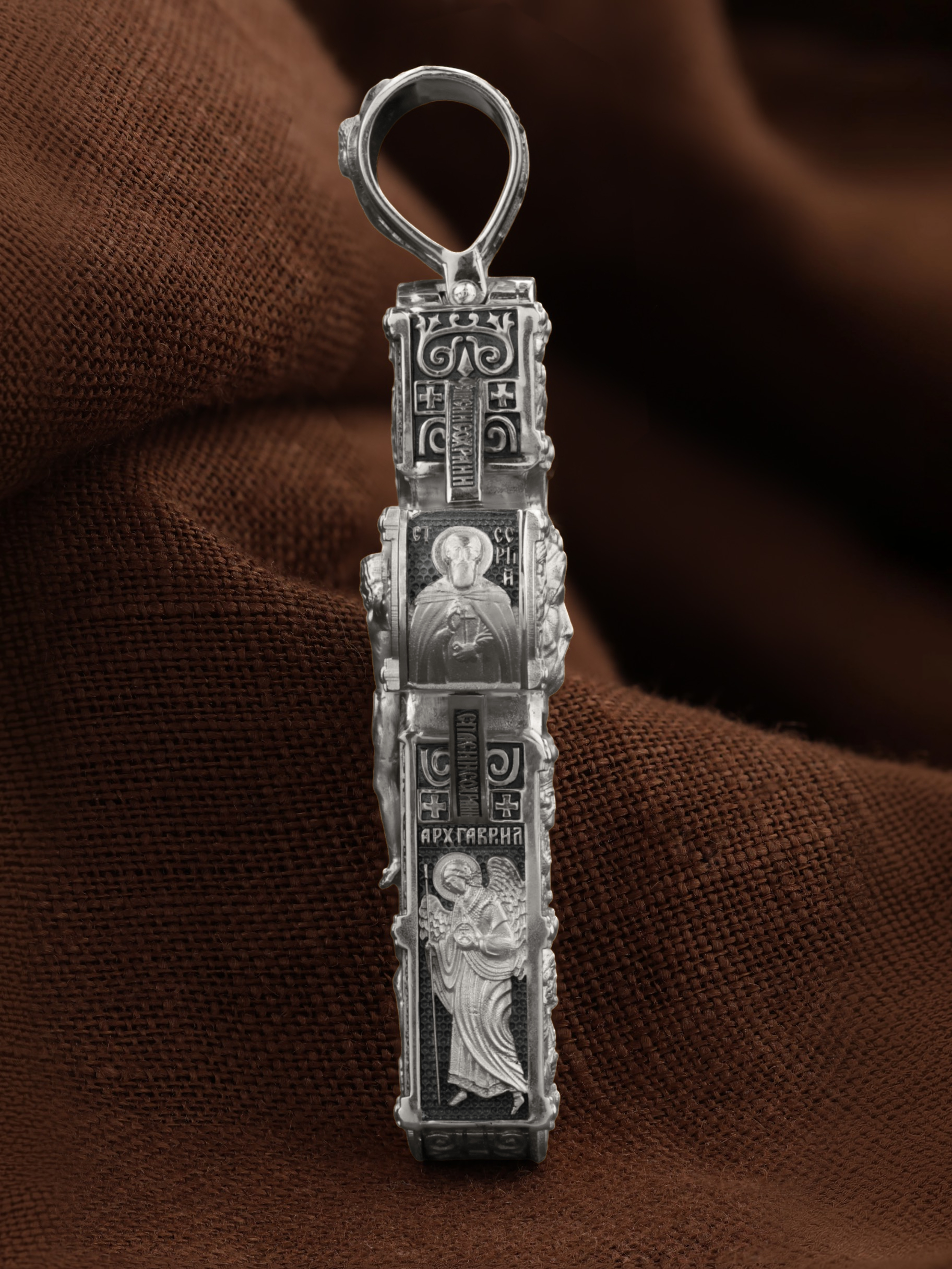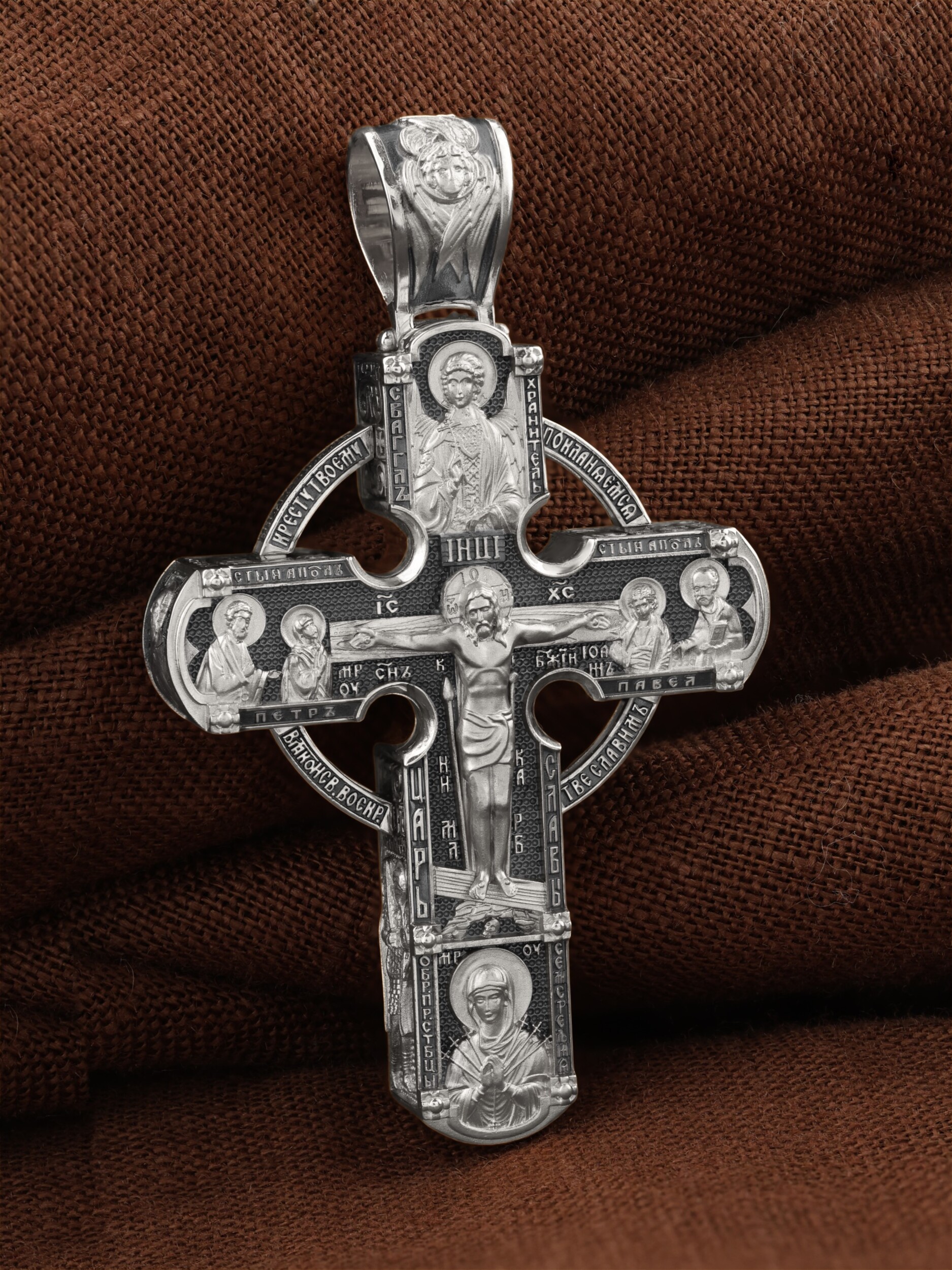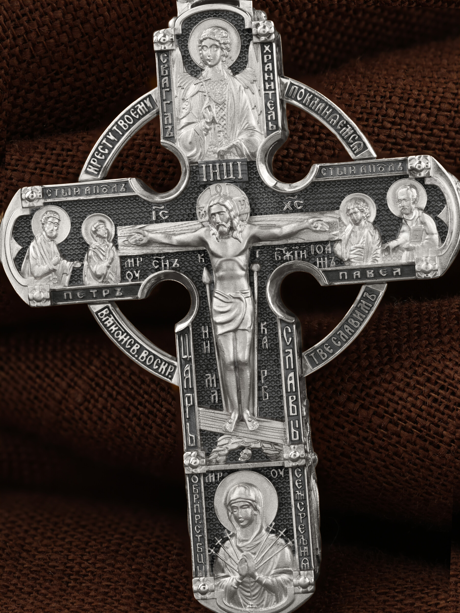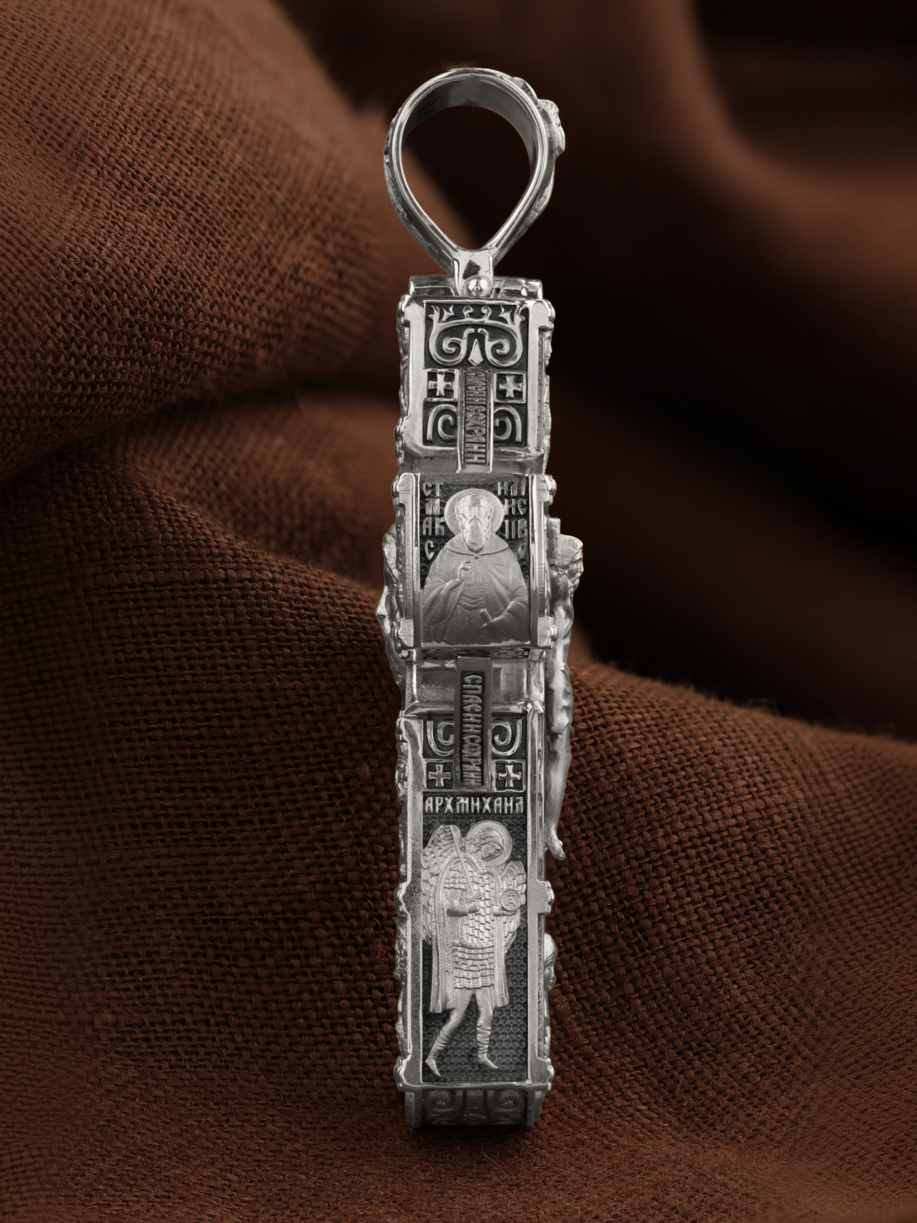 Крест объединяет в одной фигуре два христианских символа — круг-нимб и крест. На лицевой стороне креста изображено Распятие Господа и Спасителя нашего Иисуса Христа. Крест — символ спасения и искупления рода человеческого, знамение победы над смертью и адом. Распятие сопровождается каноническими надписями. На верхней табличке, выше головы Иисуса, расположена надпись, составленная Понтием Пилатом — «IНЦI». Она означает «Иисус Назорей, Царь Иудейский». Надписи «IC» «ХC», что означает Иисус Христос и «Сын Божий» размещается на разных сторонах поперечной перекладины креста. Вдоль Распятия размещены надписи «Царь Славы», «НИКА» (греч. — Победитель) и «МЛРБ» — «место лобное рай бысть» означает место лобное стало раем». Крест стоит на горе камней, символизирующих Голгофу. В ее основании различается череп — это голова Адама. Вдоль креста изображены орудия Страстей Христовых: копие сотника Лонгина, которым пронзили подреберье мёртвого Иисуса, чтобы убедиться в Его смерти, и трость с губкой, с которой Иисуса напоили уксусом. Они обозначены буквами «К» и «Т». Слева от Распятия помещены лики Пречистой Богородицы и Апостола Петра, справа изображены Апостол и евангелист Иоанн Богослов и Апостол Павел. Над Распятием изображен Святой Ангел-Хранитель, ниже — икона Божией Матери «Семистрельная». По кругу размещена молитва: «Кресту Твоему поклоняемся, Владыко, и Святое Воскресение Твое славим». На кулонном кольце помещено изображение Креста «Голгофа», на котором был распят Господь и Спаситель наш Иисус Христос.