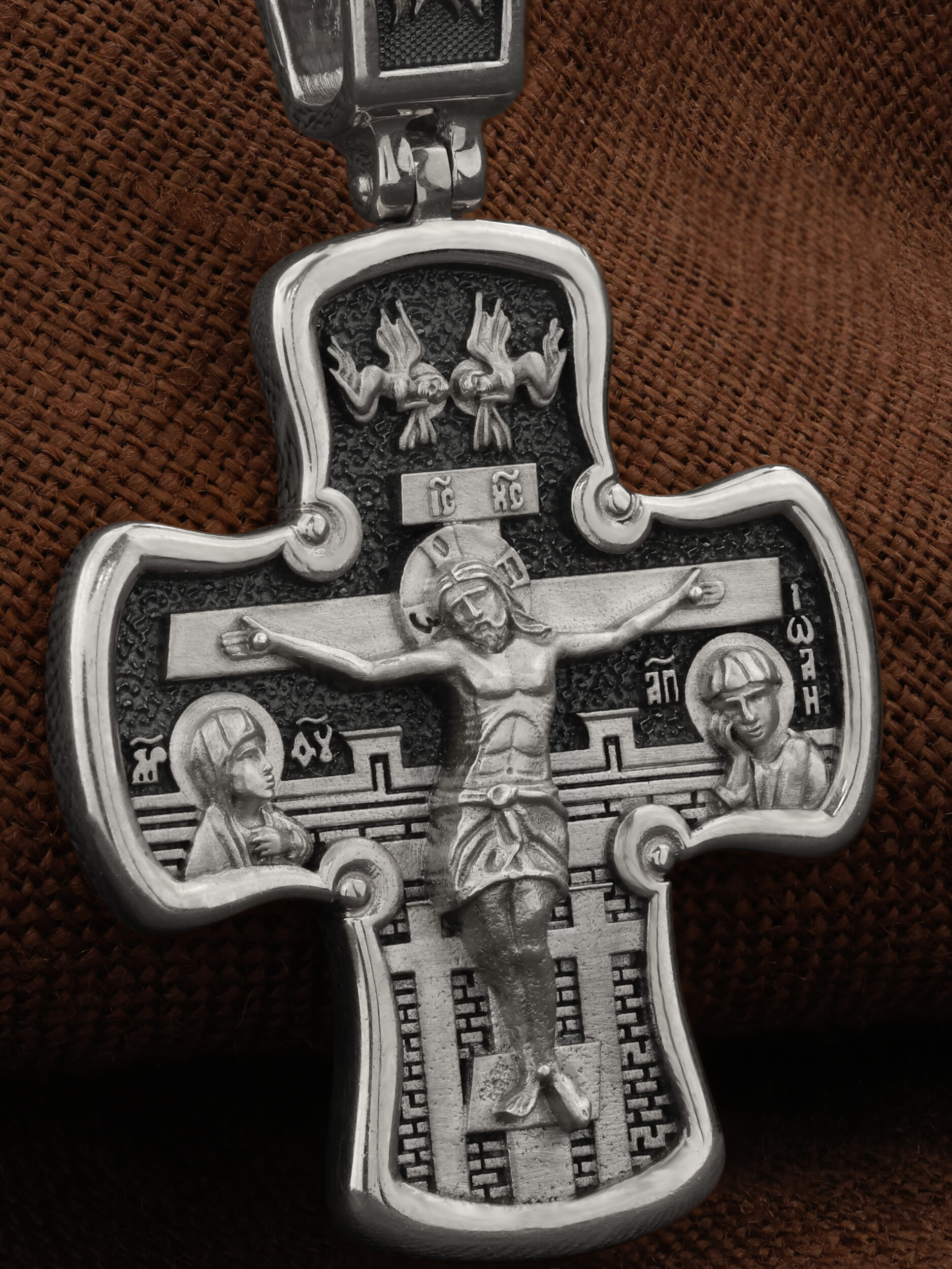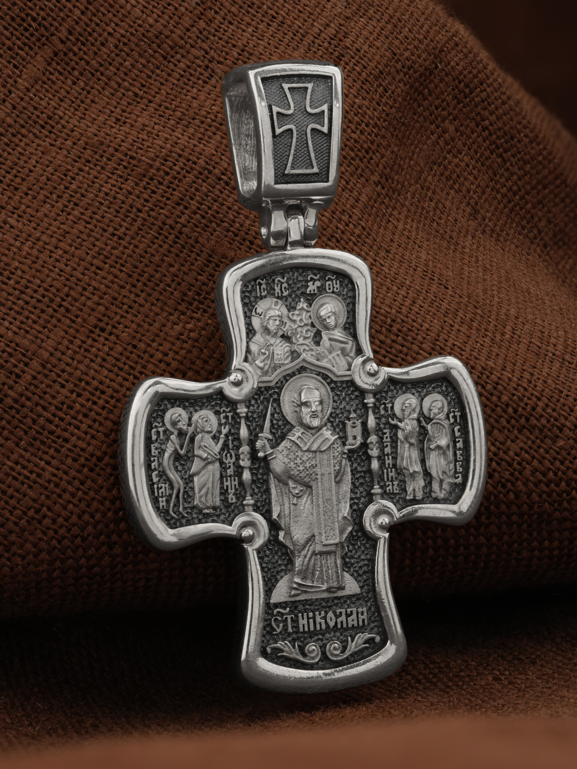 Лицевая сторона креста по канону посвящена Господу Иисусу Христу. Чаще всего на нательных крестах изображается Распятие, которое символизирует победу над грехом и смертью. Своими страданиями Господь искупил грехи человечества: умерев и сошествовав во ад, Он победил дьявола, освободил души праведников от вечной смерти и открыл им Небесные врата рая. Жертва Христа сделала возможным спасение для каждого человека. Поэтому на православных крестах Господь изображается не страдающим, а словно возносящимся и обнимающим весь мир. Он — Спаситель человечества, поправший смертию смерть и призывающий к Себе «все концы земли» (Ис. 45, 22). С двух сторон от Христа изображаются Его Мать, Пресвятая Богородица, и любимый ученик, апостол Иоанн Богослов. Они стояли у Креста неотлучно до самого конца, пока Господь не предал дух Свой Небесному Отцу. Позади — Иерусалимская стена. На иконах она обозначает место казни и символизирует Небесный Иерусалим, путь в который открылся для человечества через Голгофу.