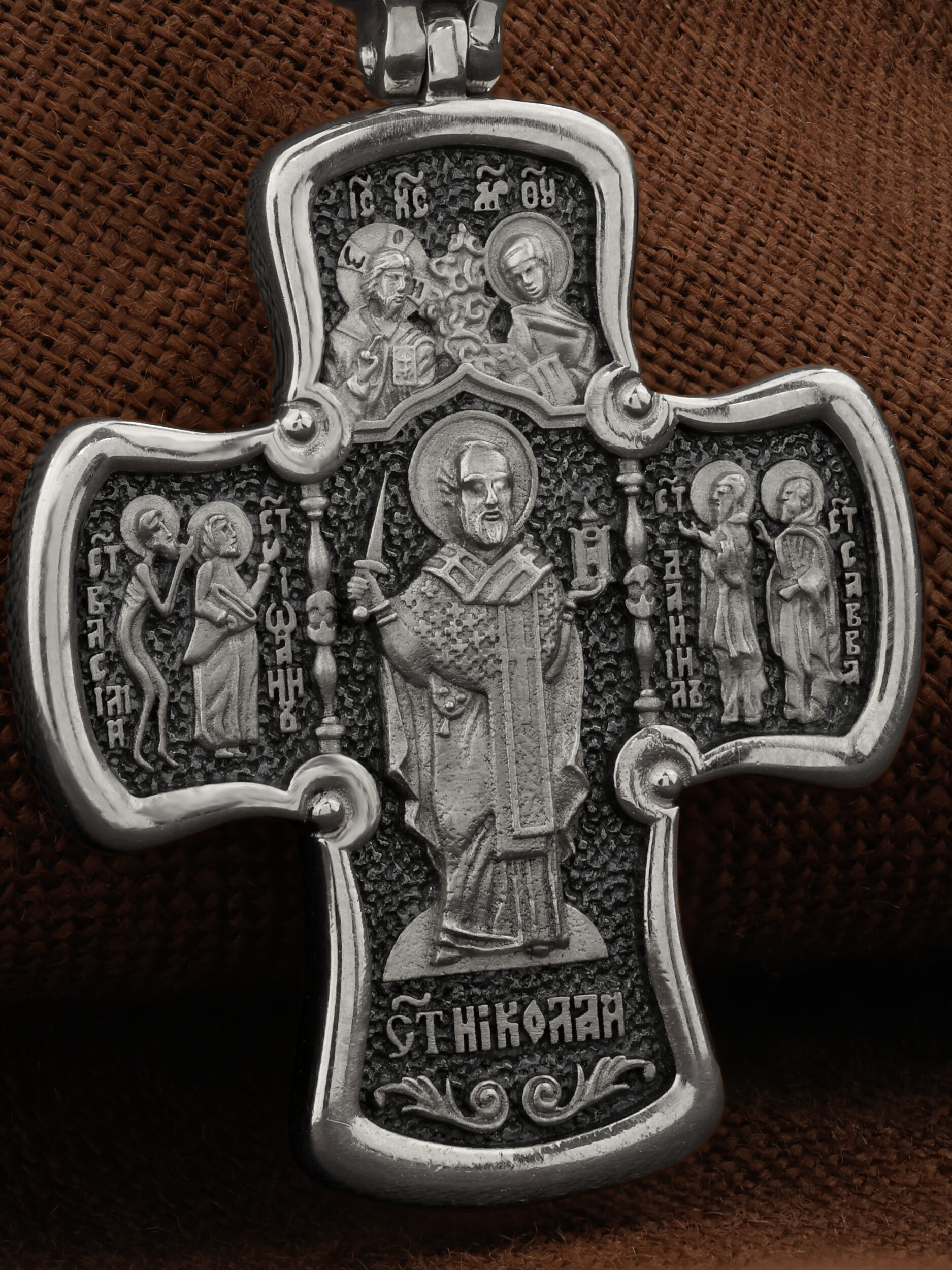На обороте креста помещена икона самого почитаемого на Руси Святого — Николая Чудотворца (втор. пол. III в.).В руках Они держат знаки епископского достоинства. Чудотворец получил омофор и Евангелие лично из рук Богородицы и Спасителя как защитник и проповедник веры. С двух сторон от Святителя Николая помещены образы великих московских святых, прославившихся чудесами на всю Россию. Слева стоят Христа ради юродивые XVI века: Василий Блаженный, в честь которого назван самый знаменитый русский собор на Красной площади в Москве, и Иоанн Большой Колпак, блаженный, который похоронен в этом храме вместе с Василием Блаженным. Слева — преподобные чудотворцы Даниил Московский, младший сын Александра Невского, и Савва Сторожевский. Оба святых были основателями великих русских монастырей XIV века — Свято-Данилова в Москве и Саввино-Сторожевского в Звенигороде.