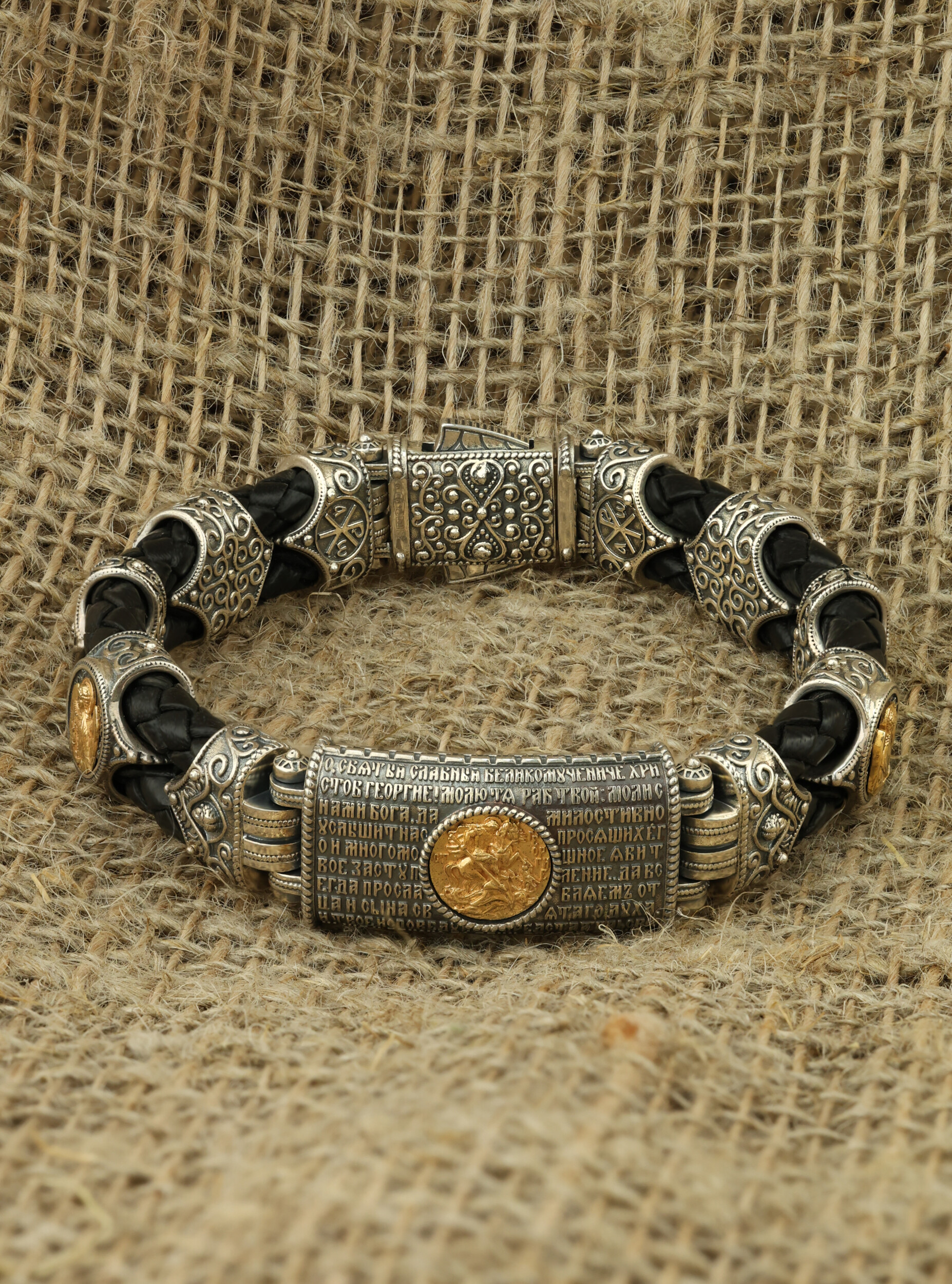 Браслет из серебра и золота c кожаным шнурком