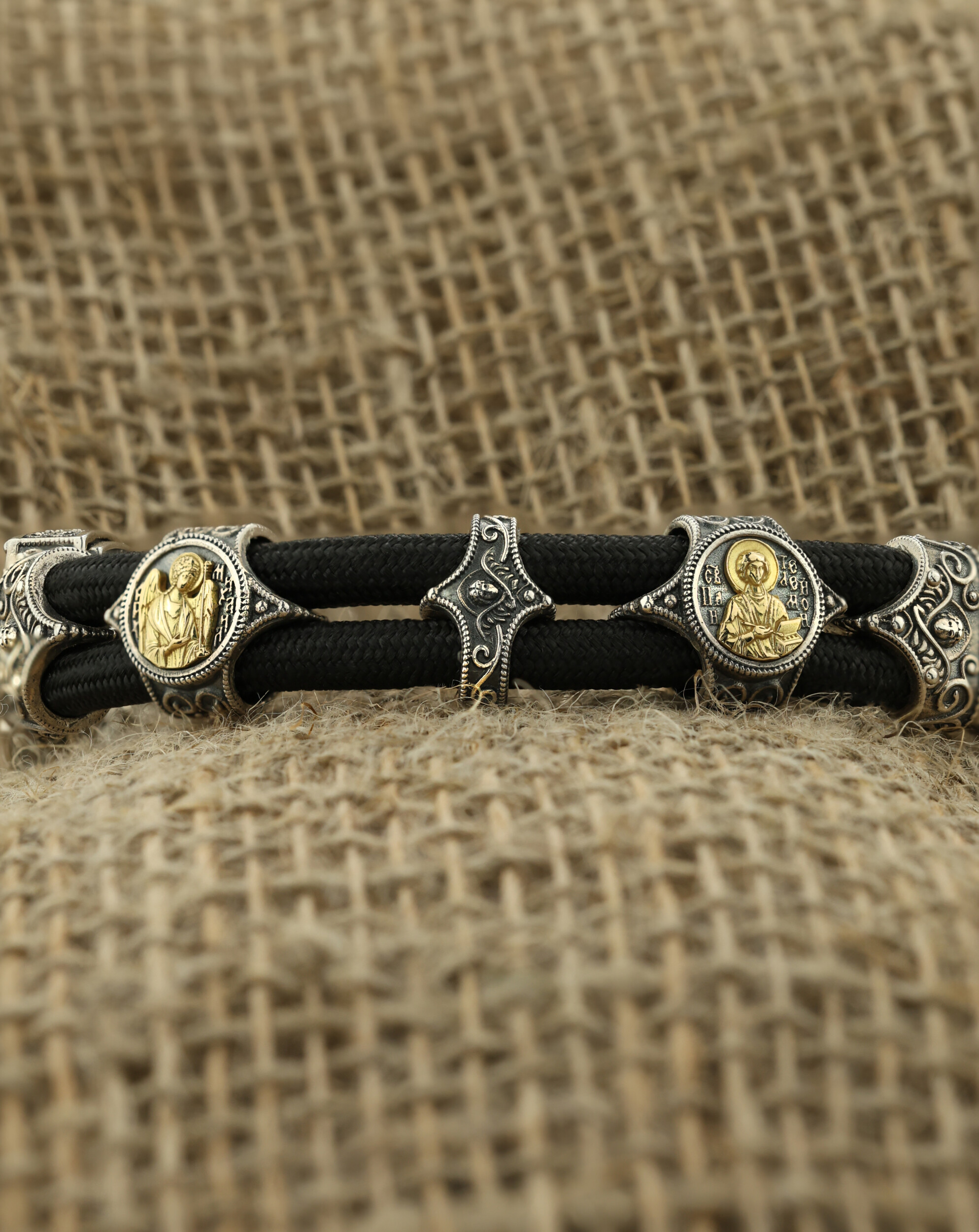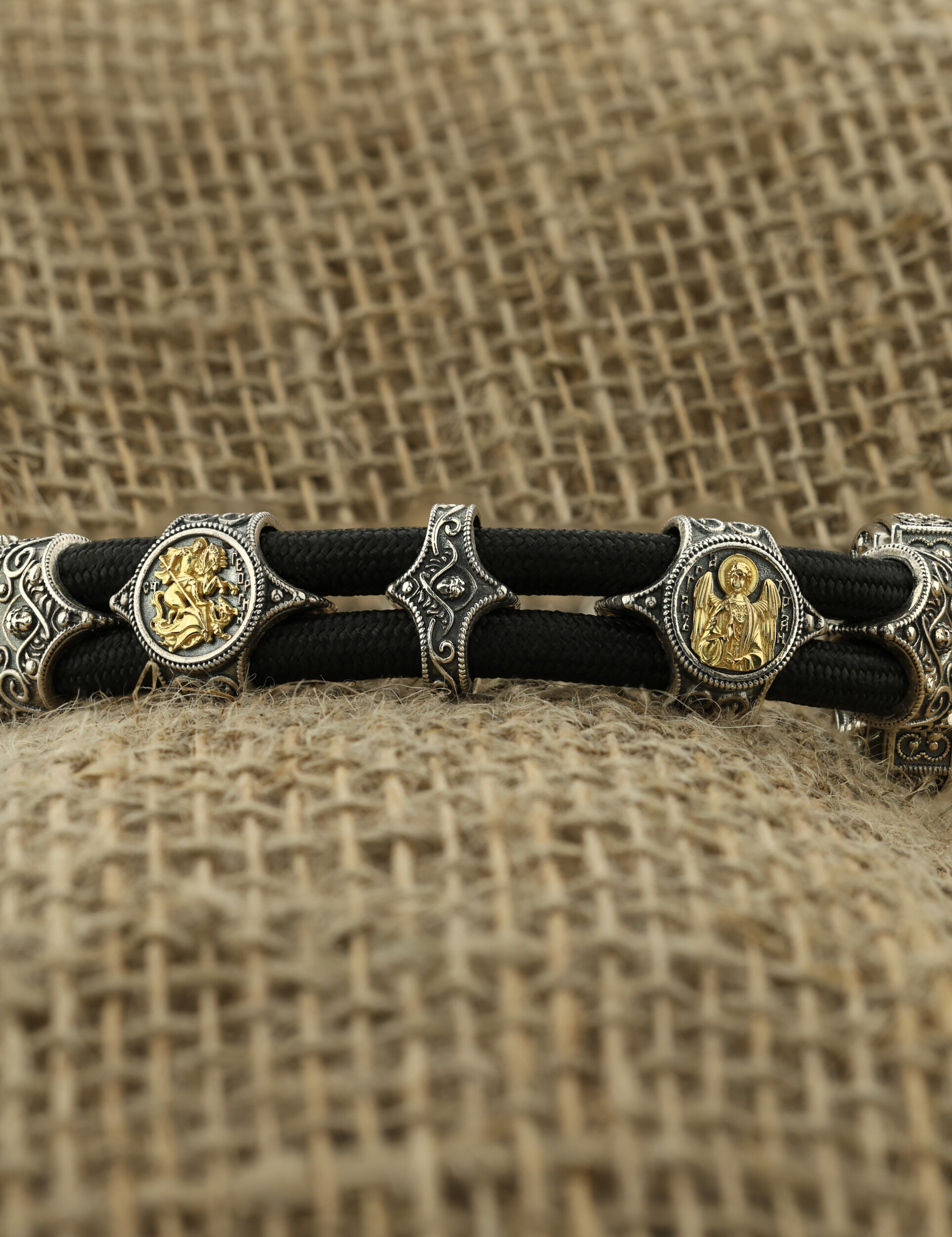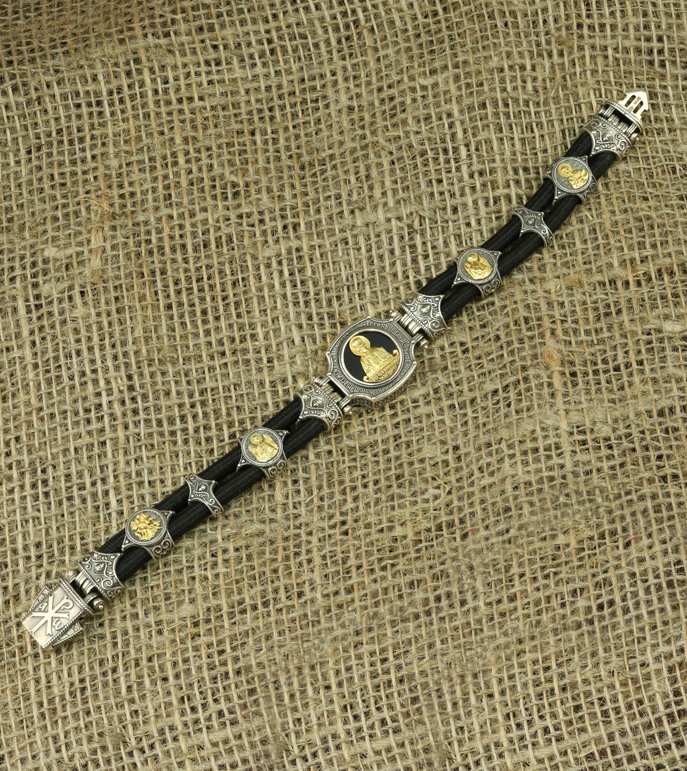 Браслет из серебра и золота c ониксом и шёлковым шнурком