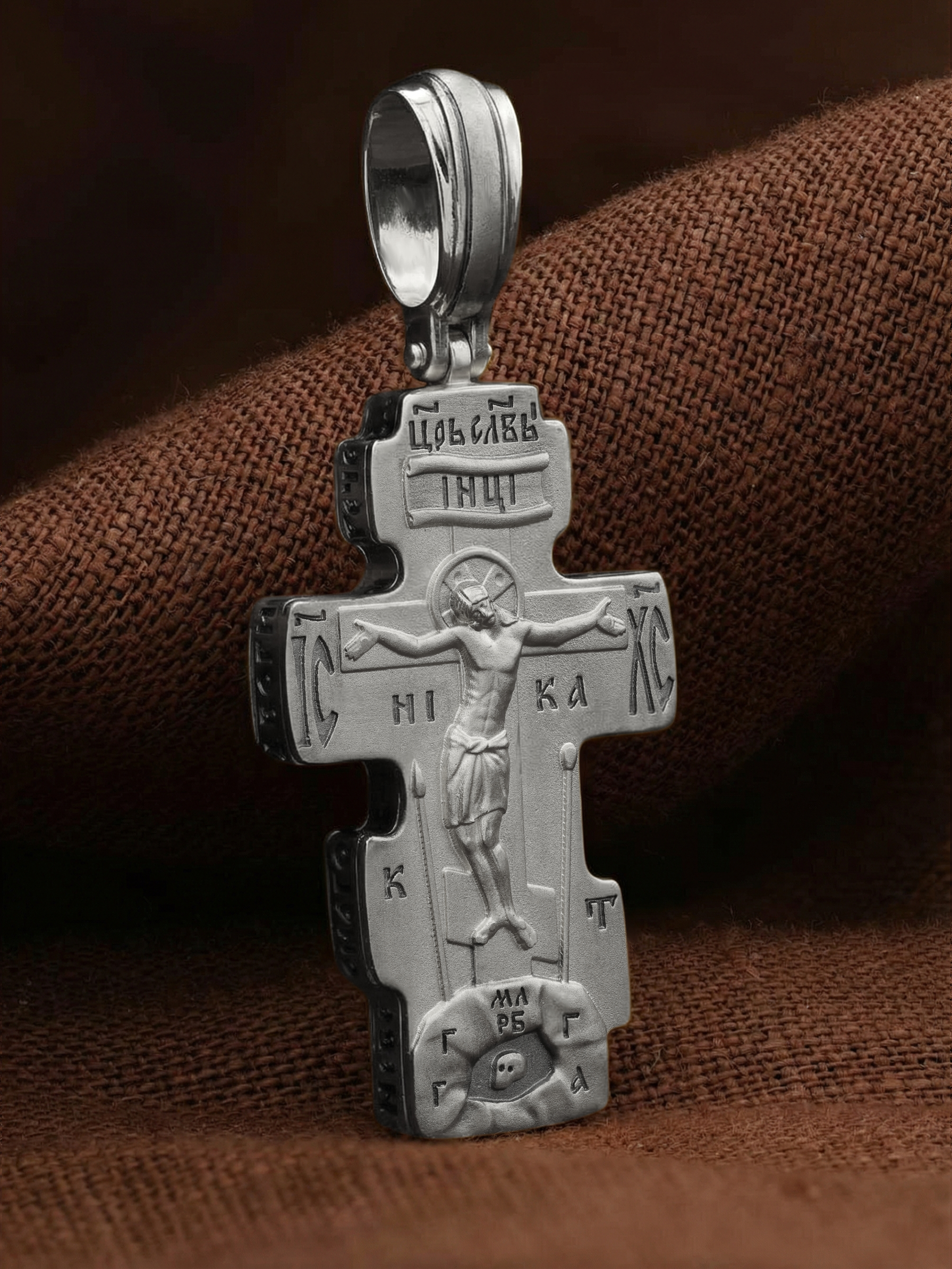 На лицевой стороне креста изображено Распятие Господа и Спасителя нашего Иисуса Христа. Крест- символ спасения и искупления рода человеческого, знамение победы над смертью и адом. Иисус Христос, как искупительная жертва освобождения человечества от власти греха, умер крестной смертью и в третий день воскрес. Над вершиной Распятия помещена надпись «Царь Славы». На верхней табличке, выше головы Иисуса, расположена надпись, составленная Понтием Пилатом — «IНЦI». Она означает «Иисус Назорей, Царь Иудейский». Надпись «IC» «ХC», означает Иисус Христос, помещается на разных сторонах поперечной перекладины креста. Под ней помещено слово «НIКА», что означает Победитель. Крест стоит на горе камней, символизирующих Голгофу, которая обозначена надписью «Г Г». В ее основании различается череп — это голова Адама, обозначенный надписью «Г А». Надпись «МЛРБ» — «место лобное рай бысть» означает место лобное стало раем. Вдоль креста изображены орудия Страстей Христовых: копие сотника Лонгина, которым пронзили подреберье мёртвого Иисуса, чтобы убедиться в Его смерти, и трость с губкой, с которой Иисуса напоили уксусом. Они обозначены буквами «К» и «Т».