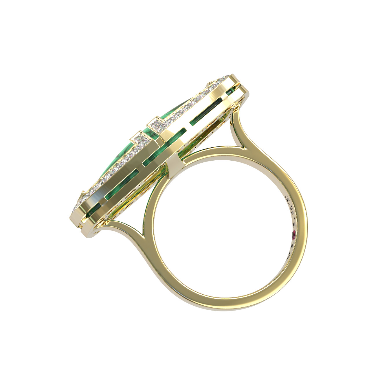 Кольцо из лимонного золота c бриллиантами, рубином и малахитом