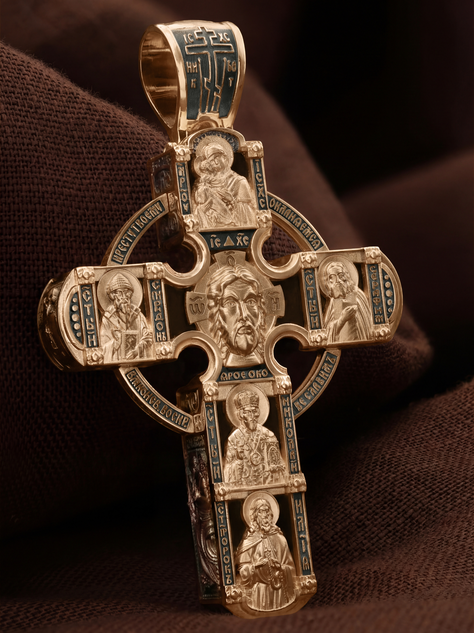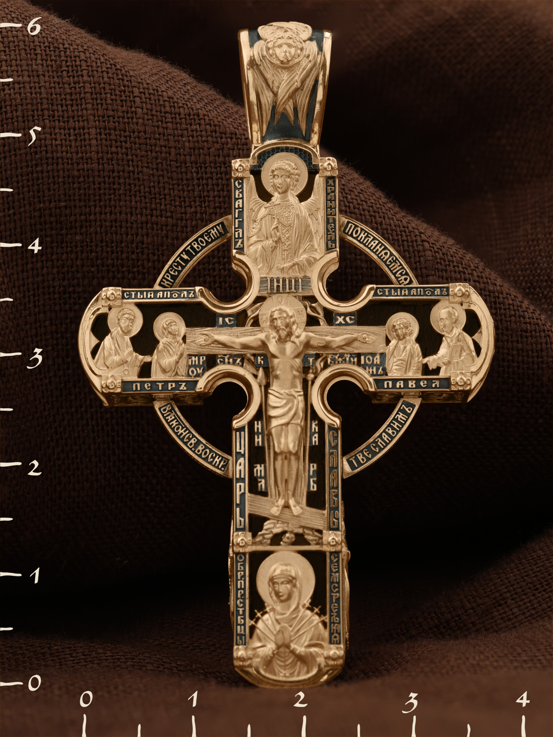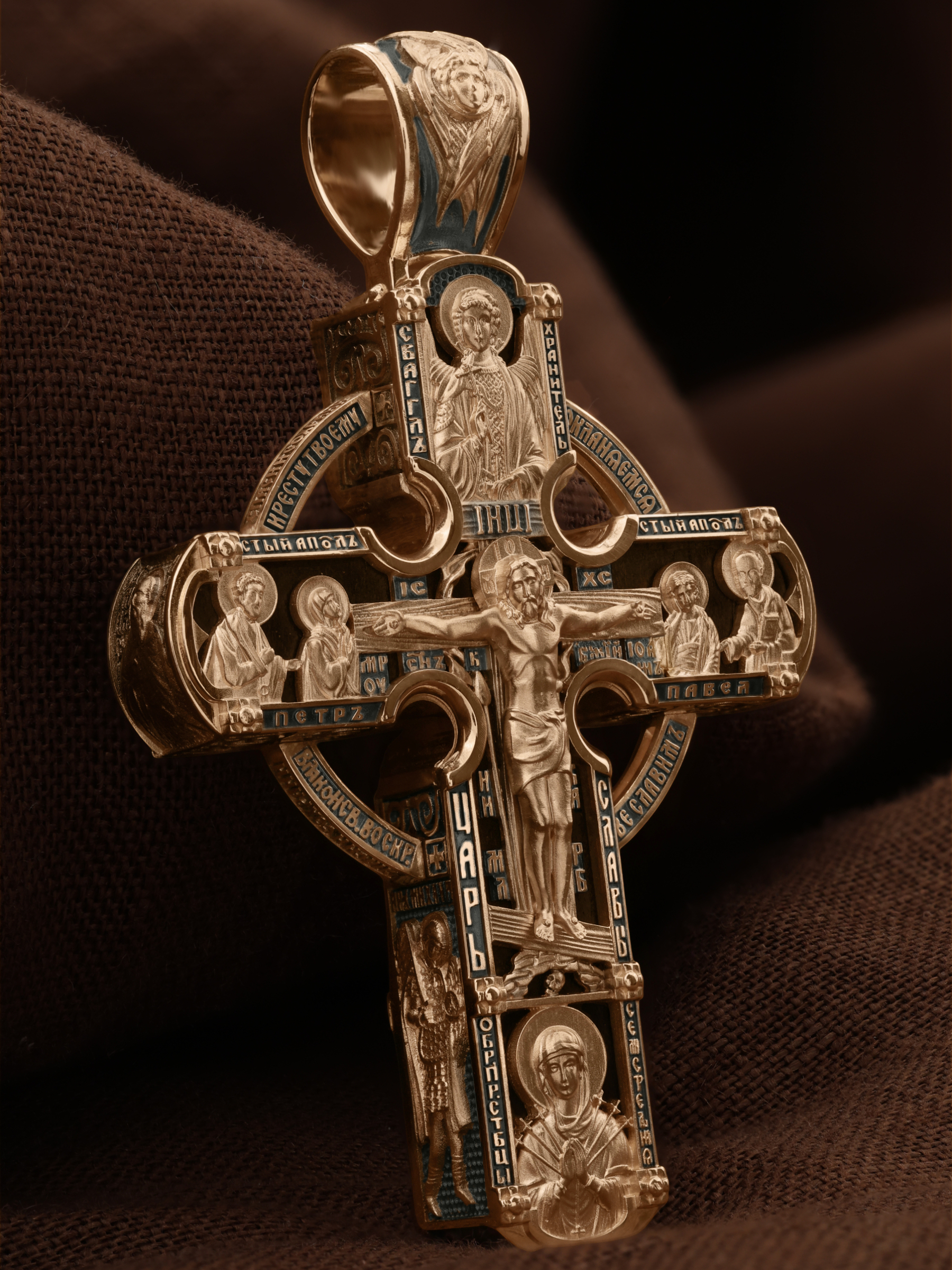 Крест объединяет в одной фигуре два христианских символа — круг-нимб и крест. На лицевой стороне креста изображено Распятие Господа и Спасителя нашего Иисуса Христа. Крест — символ спасения и искупления рода человеческого, знамение победы над смертью и адом. Распятие сопровождается каноническими надписями. На верхней табличке, выше головы Иисуса, расположена надпись, составленная Понтием Пилатом — «IНЦI». Она означает «Иисус Назорей, Царь Иудейский». Надписи «IC» «ХC», что означает Иисус Христос и «Сын Божий» размещается на разных сторонах поперечной перекладины креста. Вдоль Распятия размещены надписи «Царь Славы», «НИКА» (греч. — Победитель) и «МЛРБ» — «место лобное рай бысть» означает место лобное стало раем». Крест стоит на горе камней, символизирующих Голгофу. В ее основании различается череп — это голова Адама. Вдоль креста изображены орудия Страстей Христовых: копие сотника Лонгина, которым пронзили подреберье мёртвого Иисуса, чтобы убедиться в Его смерти, и трость с губкой, с которой Иисуса напоили уксусом. Они обозначены буквами «К» и «Т». Слева от Распятия помещены лики Пречистой Богородицы и Апостола Петра, справа изображены Апостол и евангелист Иоанн Богослов и Апостол Павел. Над Распятием изображен Святой Ангел-Хранитель, ниже — икона Божией Матери «Семистрельная». По кругу размещена молитва: «Кресту Твоему поклоняемся, Владыко, и Святое Воскресение Твое славим». На кулонном кольце помещено изображение Креста «Голгофа», на котором был распят Господь и Спаситель наш Иисус Христос.