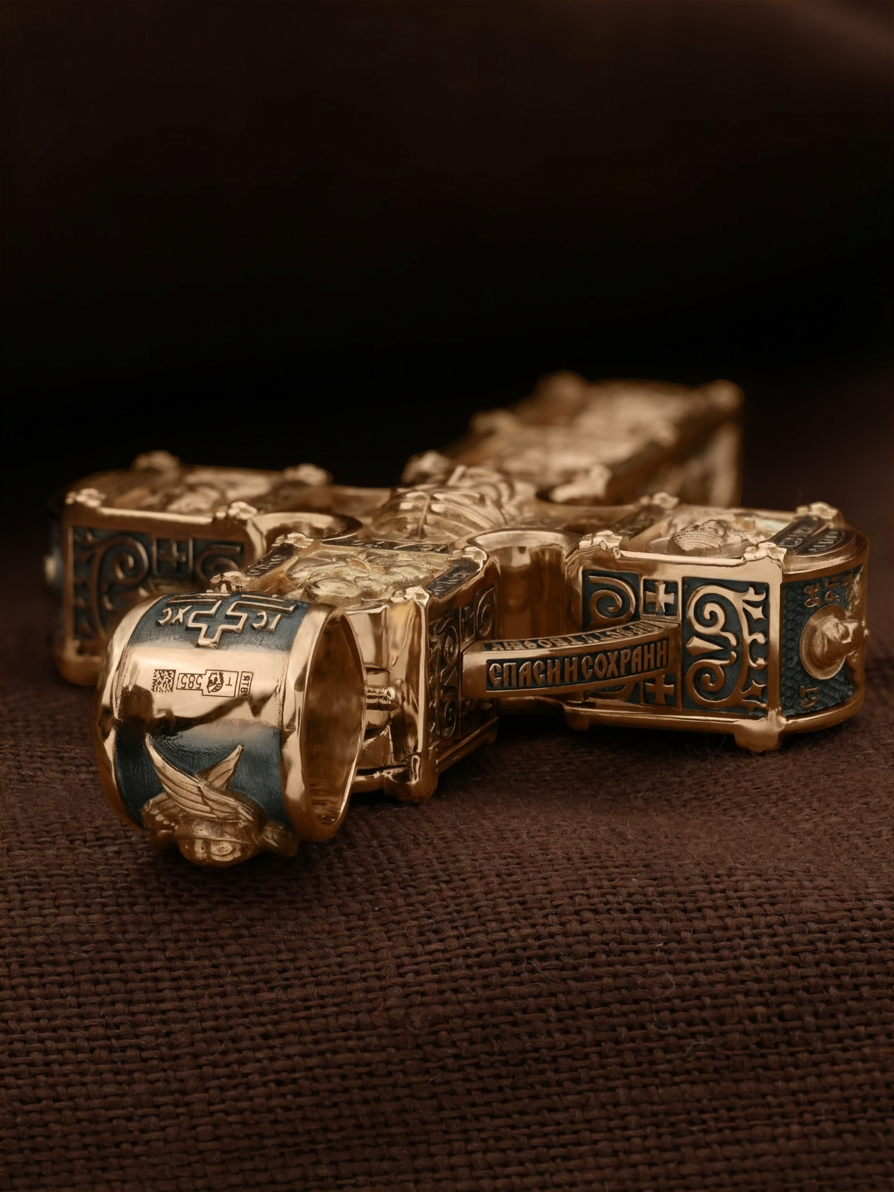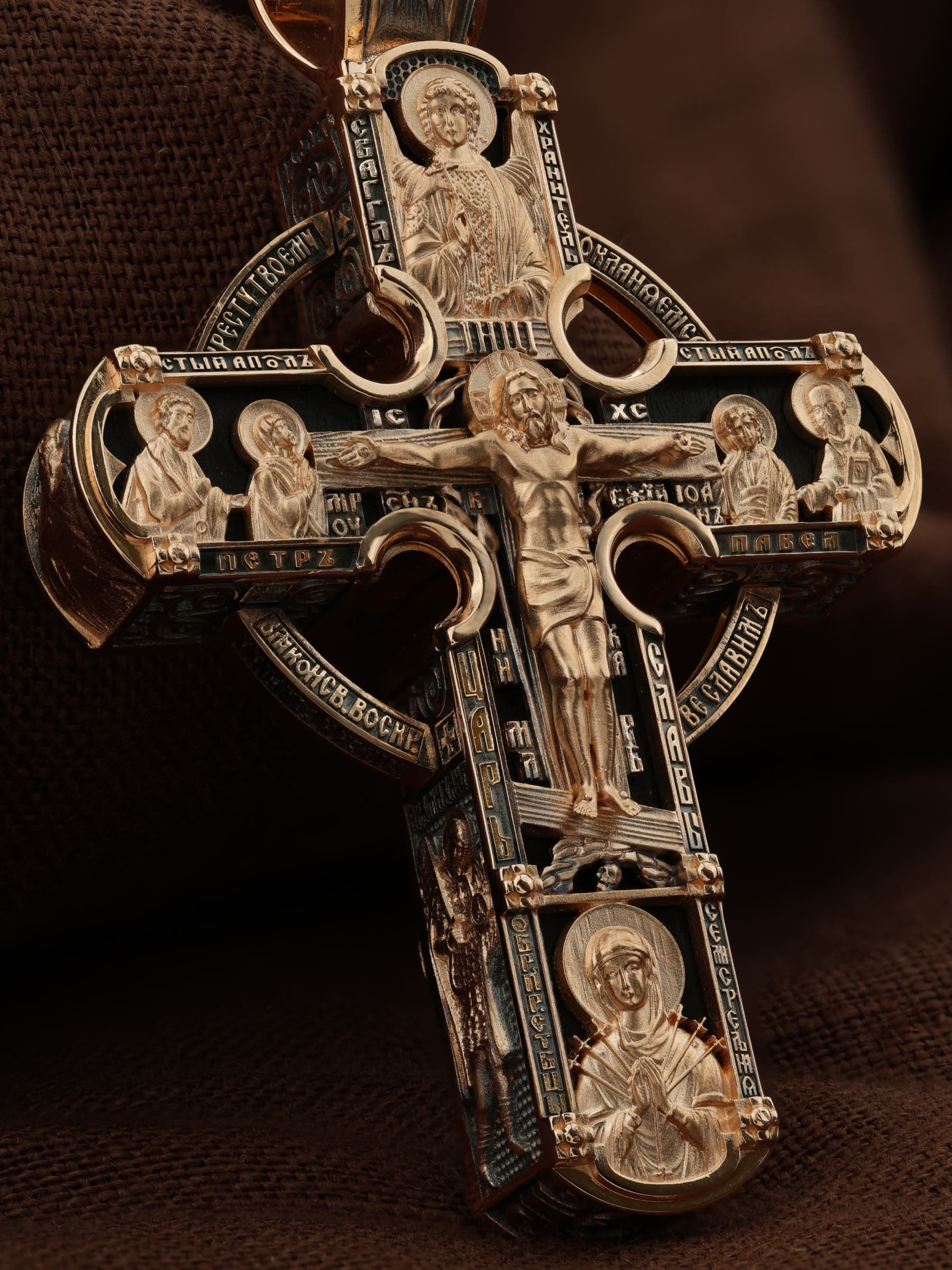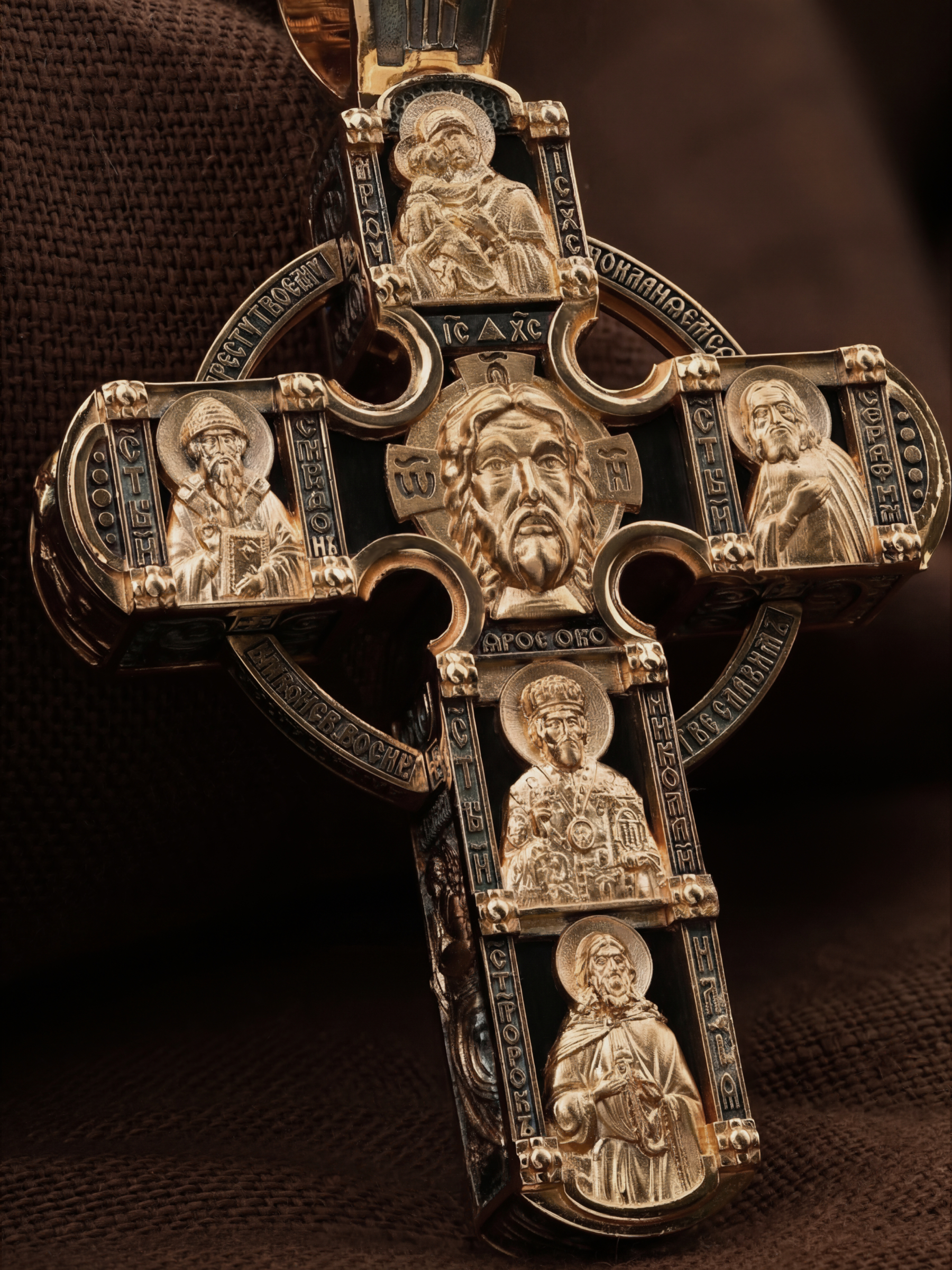 Крест объединяет в одной фигуре два христианских символа — круг-нимб и крест. На лицевой стороне креста изображено Распятие Господа и Спасителя нашего Иисуса Христа. Крест — символ спасения и искупления рода человеческого, знамение победы над смертью и адом. Распятие сопровождается каноническими надписями. На верхней табличке, выше головы Иисуса, расположена надпись, составленная Понтием Пилатом — «IНЦI». Она означает «Иисус Назорей, Царь Иудейский». Надписи «IC» «ХC», что означает Иисус Христос и «Сын Божий» размещается на разных сторонах поперечной перекладины креста. Вдоль Распятия размещены надписи «Царь Славы», «НИКА» (греч. — Победитель) и «МЛРБ» — «место лобное рай бысть» означает место лобное стало раем». Крест стоит на горе камней, символизирующих Голгофу. В ее основании различается череп — это голова Адама. Вдоль креста изображены орудия Страстей Христовых: копие сотника Лонгина, которым пронзили подреберье мёртвого Иисуса, чтобы убедиться в Его смерти, и трость с губкой, с которой Иисуса напоили уксусом. Они обозначены буквами «К» и «Т». Слева от Распятия помещены лики Пречистой Богородицы и Апостола Петра, справа изображены Апостол и евангелист Иоанн Богослов и Апостол Павел. Над Распятием изображен Святой Ангел-Хранитель, ниже — икона Божией Матери «Семистрельная». По кругу размещена молитва: «Кресту Твоему поклоняемся, Владыко, и Святое Воскресение Твое славим». На кулонном кольце помещено изображение Креста «Голгофа», на котором был распят Господь и Спаситель наш Иисус Христос.