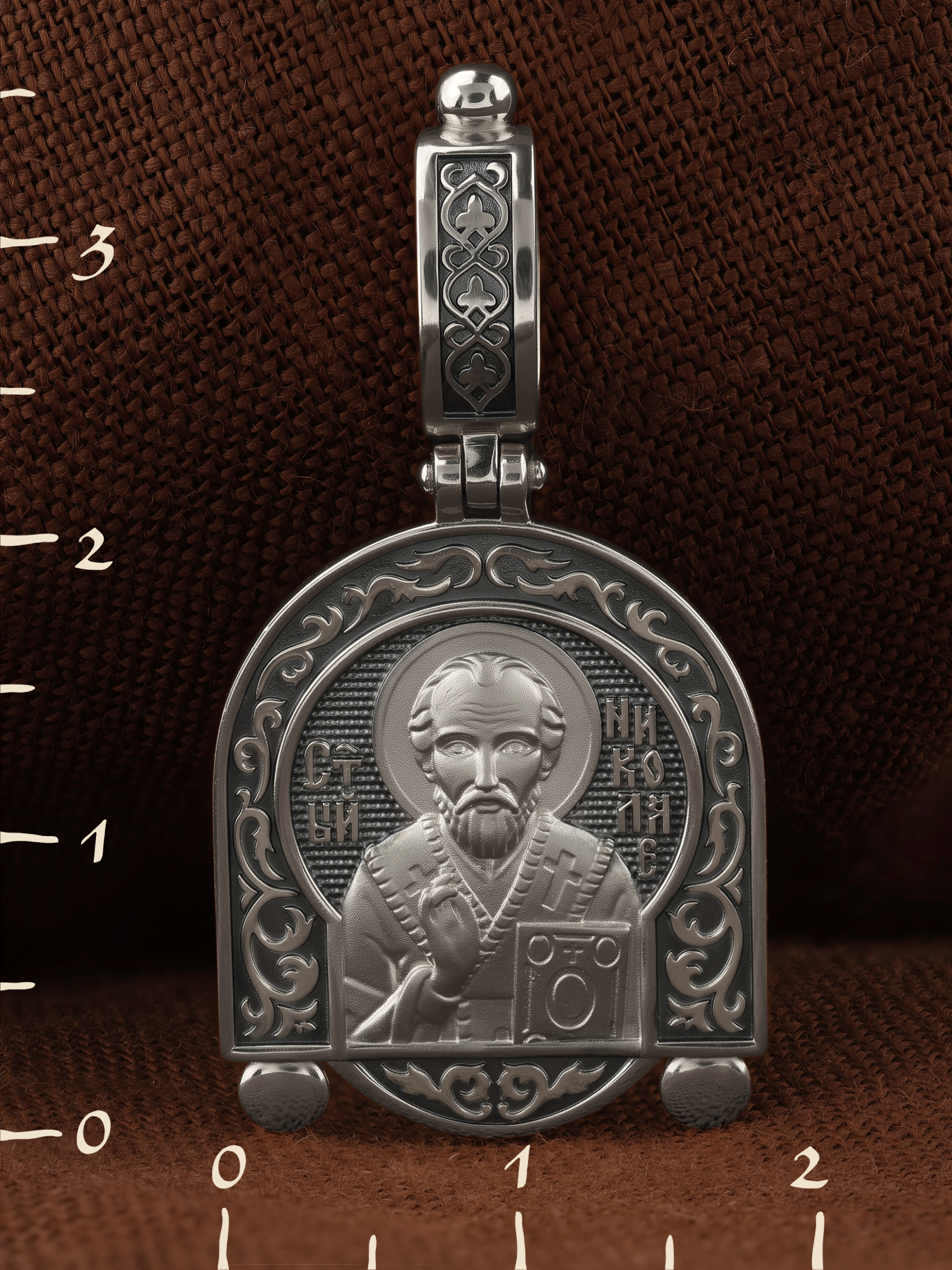 На лицевой стороне образка изображен Святитель Николай архиепископ Мир Ликийских, Чудотворец. Он является одним из самых почитаемых святых в православном мире. Святитель Николай родился во второй половине III века в Малой Азии в Ликийском городе Патары. С рождения Божий Угодник проявлял необыкновенные дарования. Сохранилось Предание, что во время крещения он, никем не поддерживаемый, простоял в купели три часа. Приняв сан священника, святитель Николай стал проводить еще более строгую подвижническую жизнь. Избранник Божий Николай стал вершиной всех добродетелей, поднятой до райской высоты. С кем из величайших праведников не сравнялся он образом духов­ной красоты, кому из них не последовал в своих деяниях и чудотворениях? Вся жизнь святого Николая — это служение Богу. Много великих и преславных чудес сотворил великий Святитель Николай Угодник. Он помогал сущим в бедах, укрощал штормы, спасал от потопления и выносил на сушу из глубины морской, освобождал из плена и приносил освобожденных домой, избавлял от уз и темницы, защищал от посечения мечом, освобождал от смерти и подавал многим различные исцеления: слепым — прозрение, хромым — хождение, глухим — слух, немым — дар слова.