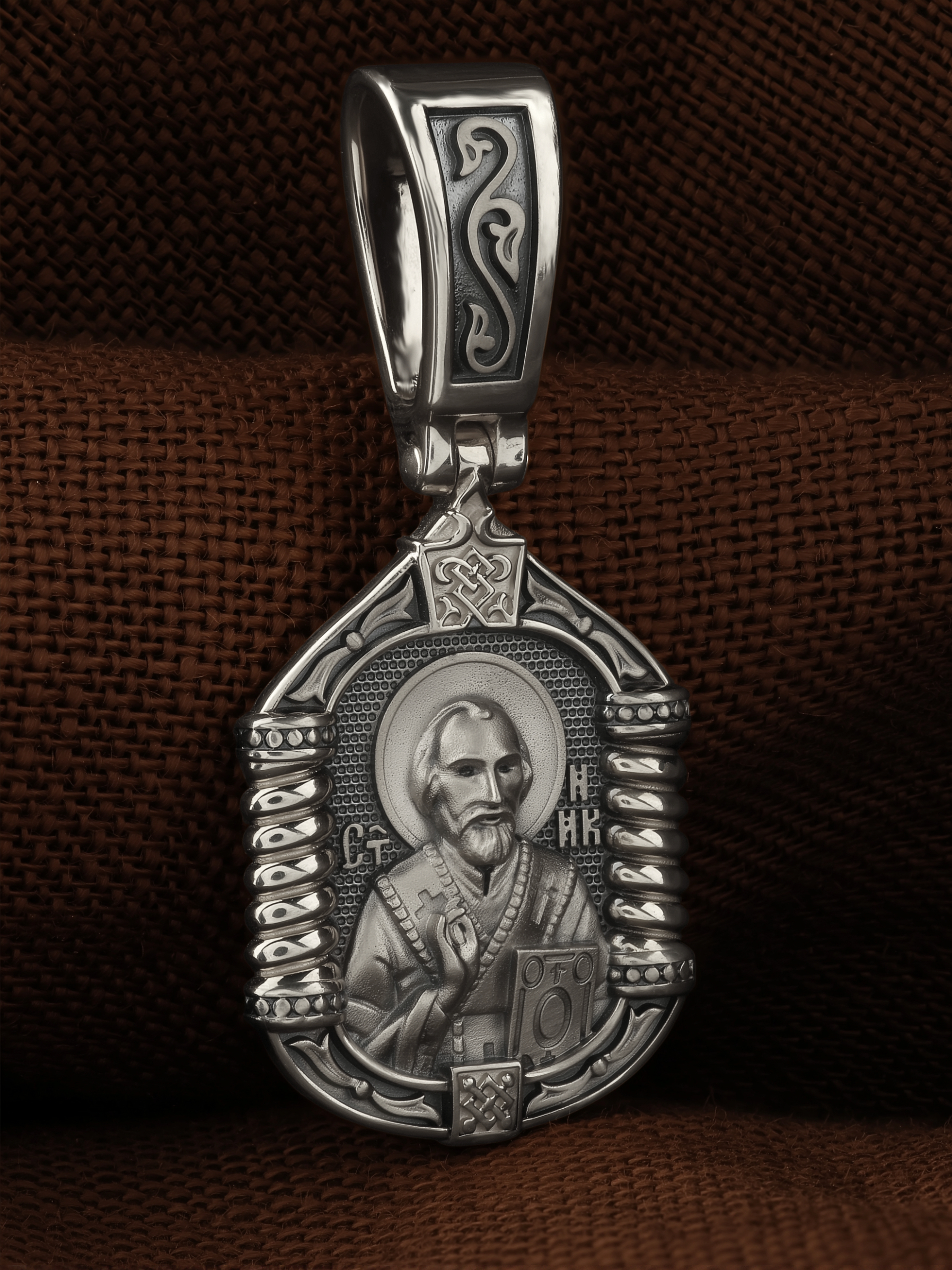 На лицевой стороне образка изображен Святитель Николай архиепископ Мир Ликийских, Чудотворец. Он является одним из самых почитаемых святых в православном мире. Святитель Николай родился во второй половине III века в Малой Азии в Ликийском городе Патары. С рождения Божий Угодник проявлял необыкновенные дарования. Сохранилось Предание, что во время крещения он, никем не поддерживаемый, простоял в купели три часа. Приняв сан священника, святитель Николай стал проводить еще более строгую подвижническую жизнь. Избранник Божий Николай стал вершиной всех добродетелей, поднятой до райской высоты. С кем из величайших праведников не сравнялся он образом духов­ной красоты, кому из них не последовал в своих деяниях и чудотворениях? Вся жизнь святого Николая — это служение Богу. Много великих и преславных чудес сотворил великий Святитель Николай Угодник. Он помогал сущим в бедах, укрощал штормы, спасал от потопления и выносил на сушу из глубины морской, освобождал из плена и приносил освобожденных домой, избавлял от уз и темницы, защищал от посечения мечом, освобождал от смерти и подавал многим различные исцеления, слепым прозрение, хромым хождение, глухим слух, немым дар слова.
