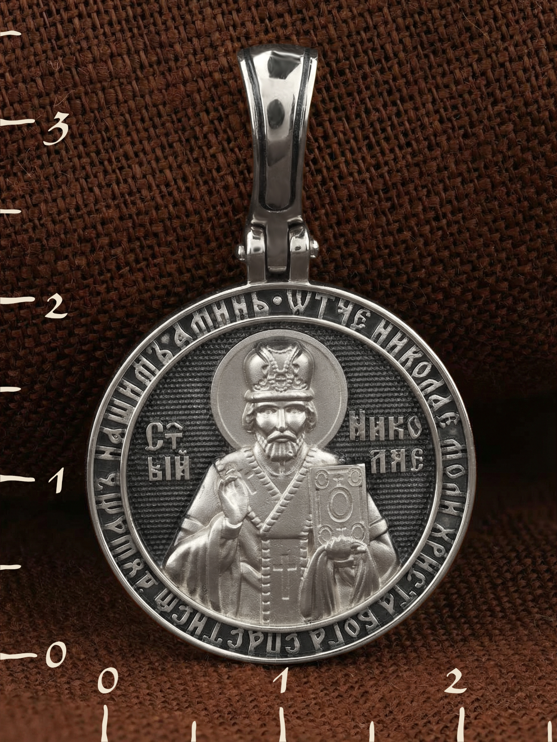 На лицевой стороне образка изображен Святитель Николай архиепископ Мир Ликийских, Чудотворец. Он является одним из самых почитаемых святых в православном мире. Избранник Божий Николай стал вершиной всех добродетелей. С кем из величайших праведников не сравнялся он образом духовной красоты, кому из них не последовал в своих деяниях и чудотворениях? Всеблаженный Николай был кроток, как Моисей, мужественен, как Давид, славен простотой нрава, как Иаков. Словно Ной, он спасал стадо Господне в новом ковчеге от потопа ересей. Вся жизнь святого Николая — это служение Богу. Много великих чудес сотворил на земле и на море великий Святитель Николай Угодник. Он укрощал штормы, спасал от потопления и выносил на сушу из глубины морской, освобождал из плена и приносил освобожденных домой, избавлял от уз и темницы, освобождал от смерти и подавал многим различные исцеления: слепым — прозрение, хромым — хождение, глухим — слух.