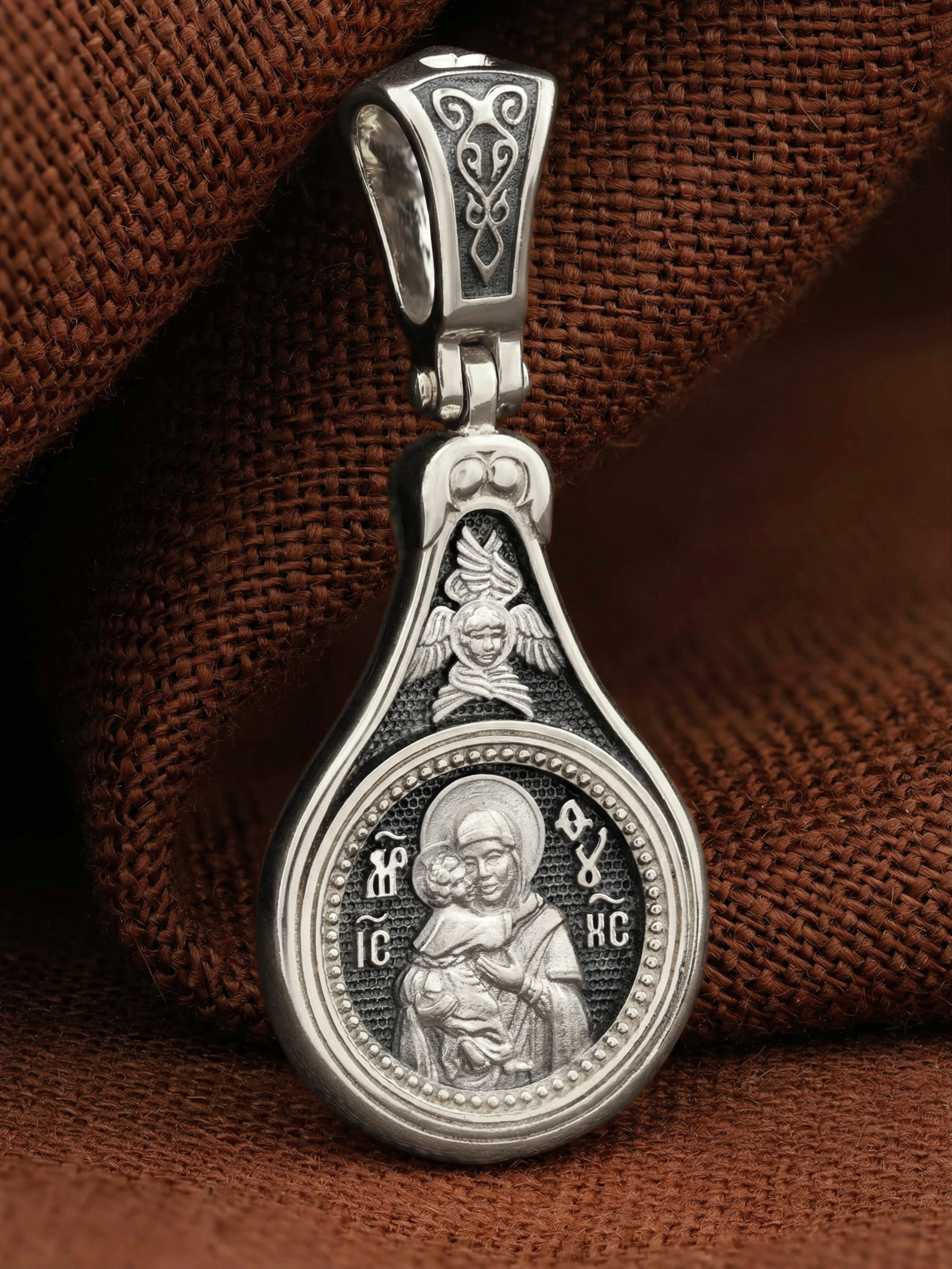 Лицевую сторону образка и кулонное кольцо украшает шестикрылый Серафим — самый приближенный к Господу Ангел.