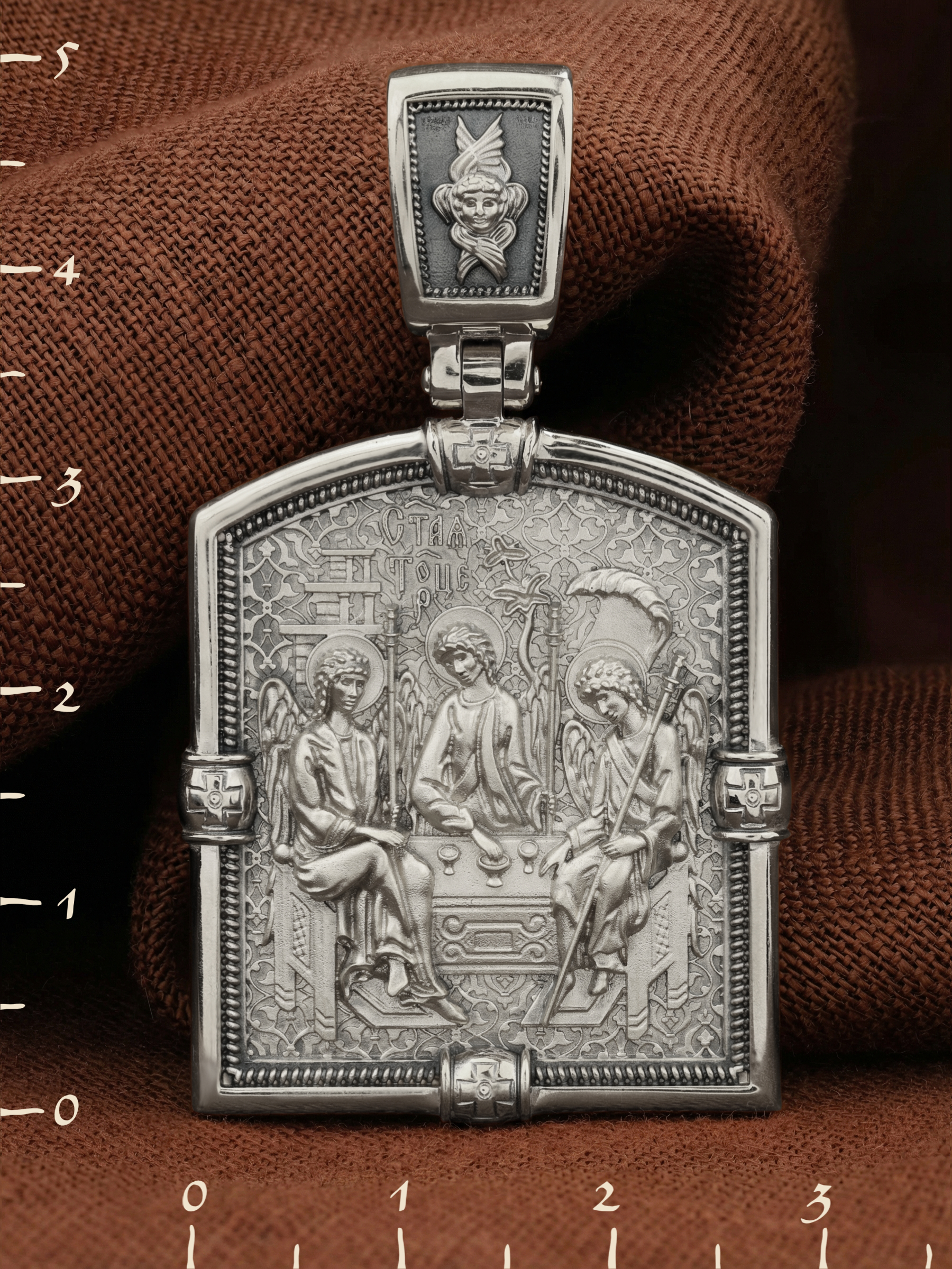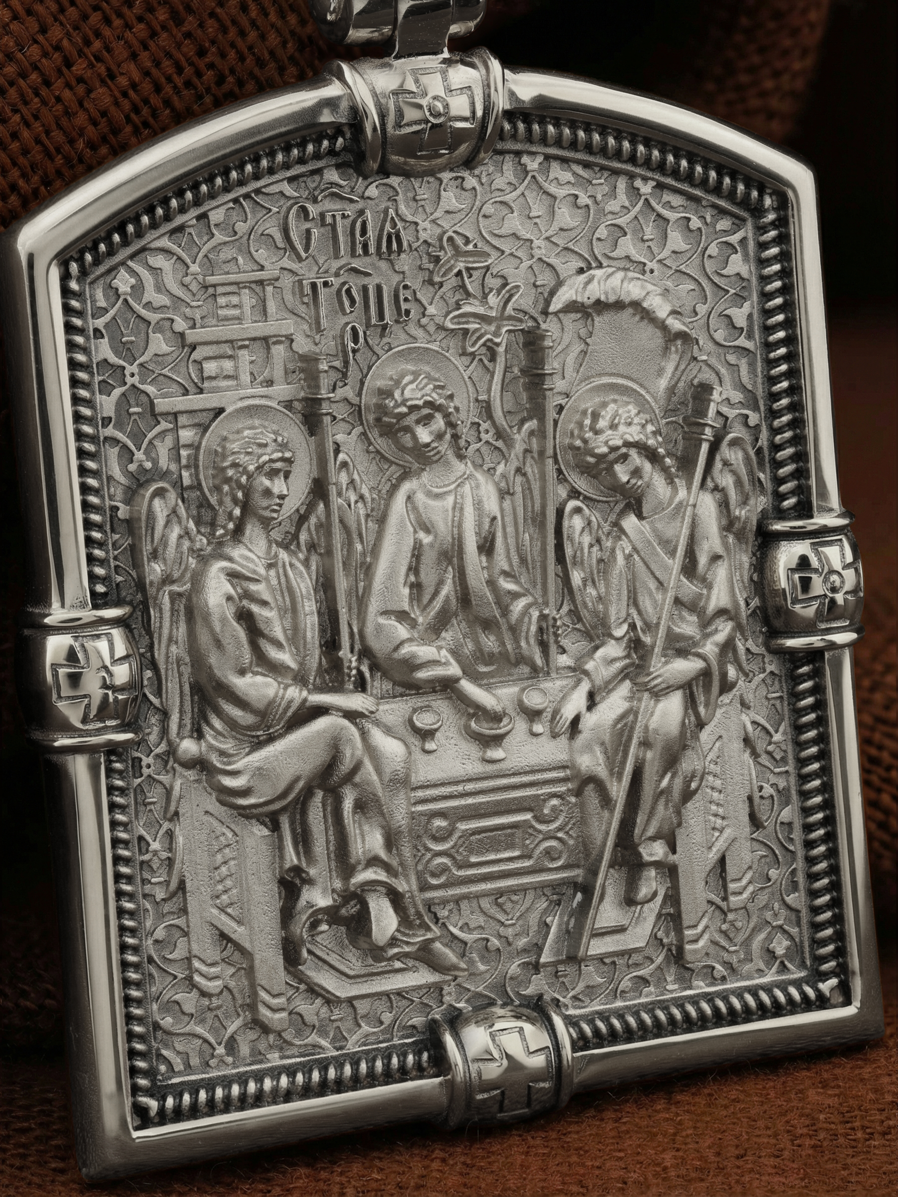 Основой композиции лицевой стороны является икона Святой Троицы.