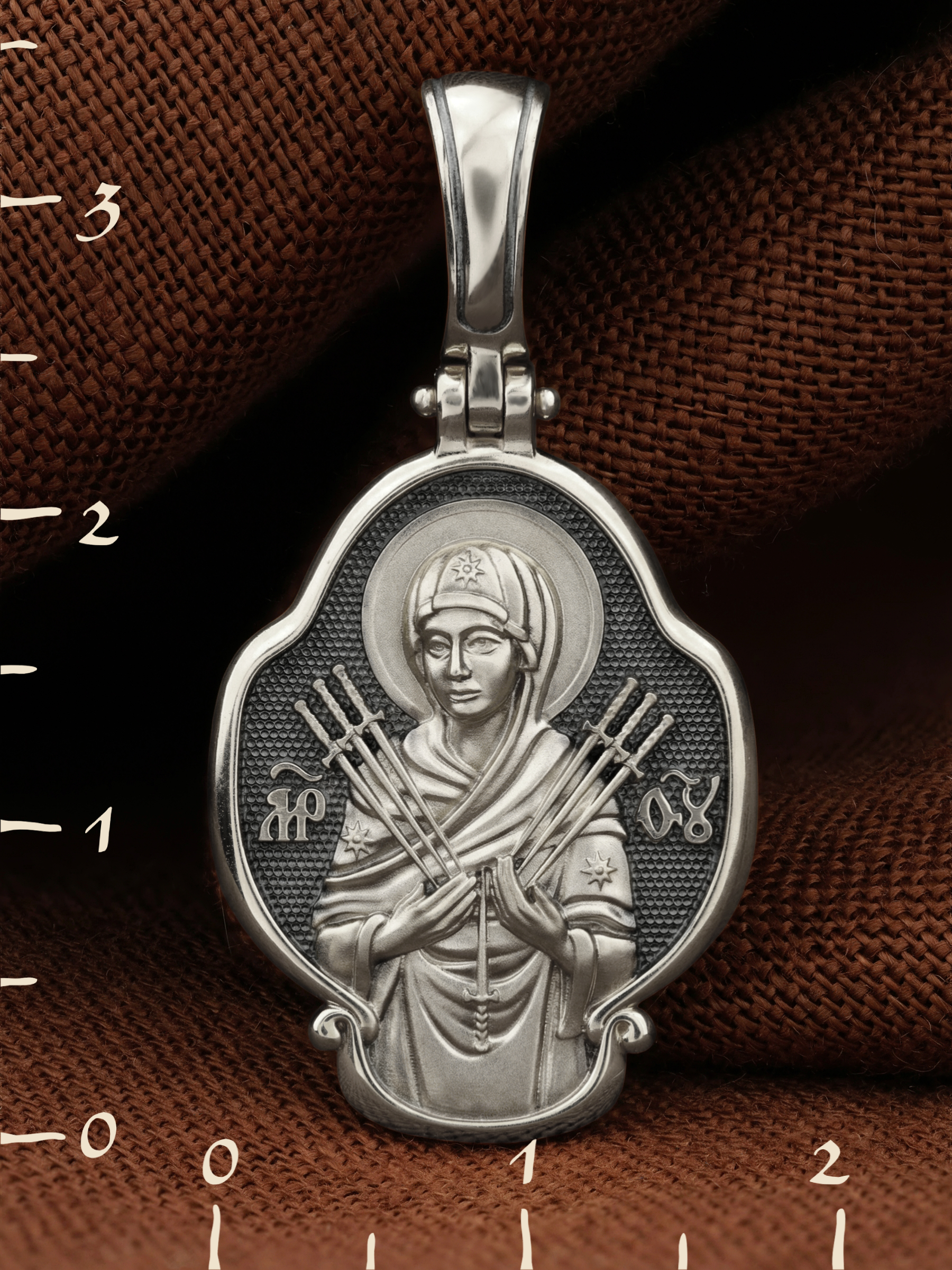На лицевой стороне образка изображена икона Пресвятой Богородицы «Семистрельная» — одна из самых чудотворных икон на Руси. На протяжении многих веков христиане взывали к Царице Небесной через эту икону, если в стране начинались войны или мятежи.