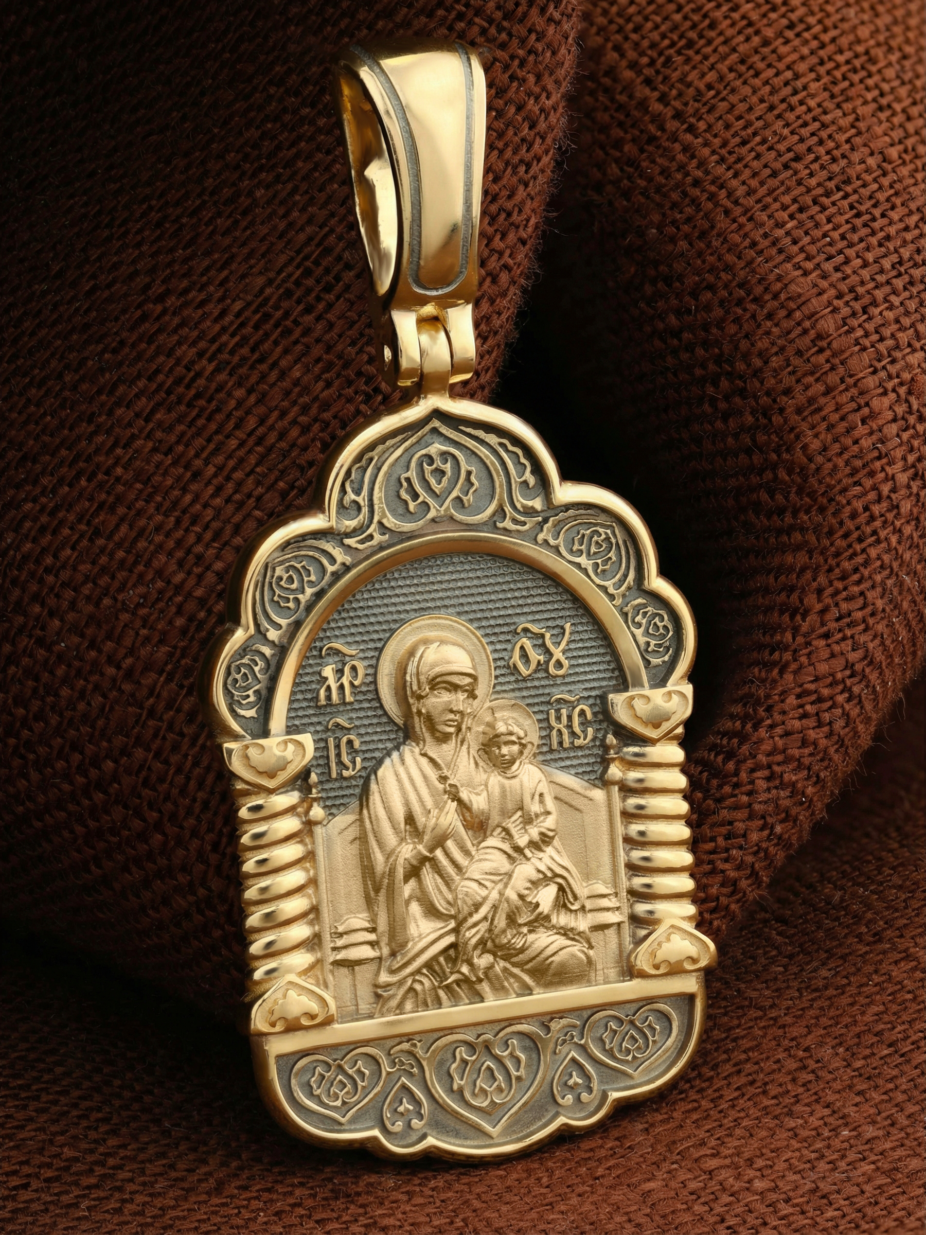 В центр образка помещен образ Божией Матери «Всецарица», восседающая на царском троне. На руках Ее — Богомладенец Иисус Христос со свитком в левой руке. Пальцы Его правой руки сложены в благословляющем жесте.