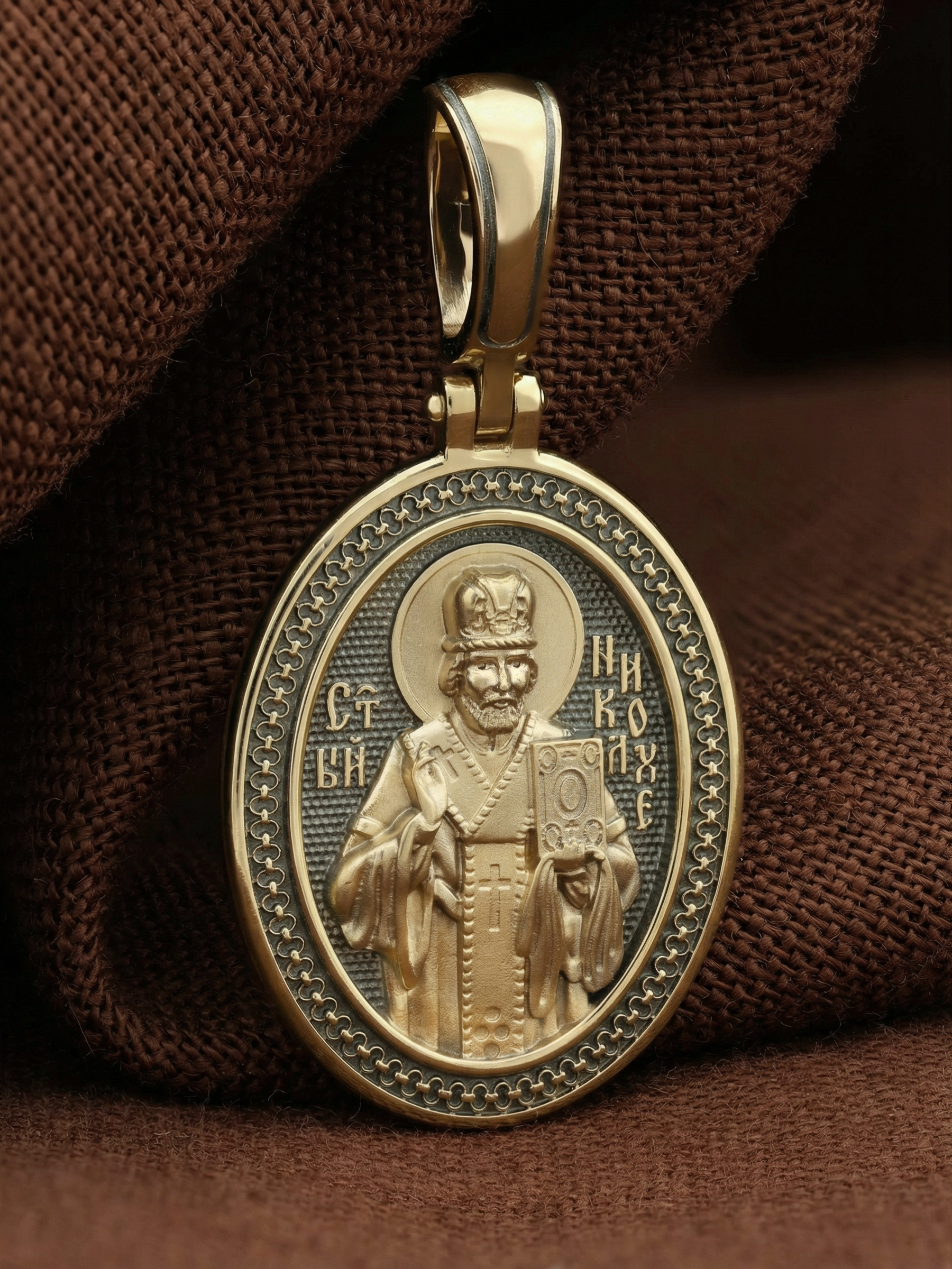 Лицевую сторону возглавляет икона святителя Николая Чудотворца. Святитель Николай родился во второй половине III века в Малой Азии в Ликийском городе Патары. С рождения Божий Угодник проявлял необыкновенные дарования. Сохранилось Предание, что во время крещения он, никем не поддерживаемый, простоял в купели три часа. С детства святитель избегал пустых развлечений, любил молитву, прекрасно учился и проводил свободное время за чтением Священного Писания. По достижении зрелого возраста жители Патар выбрали его своим пресвитером. Несколько лет спустя св. Николай стал епископом в городе Миры, столице Ликии.