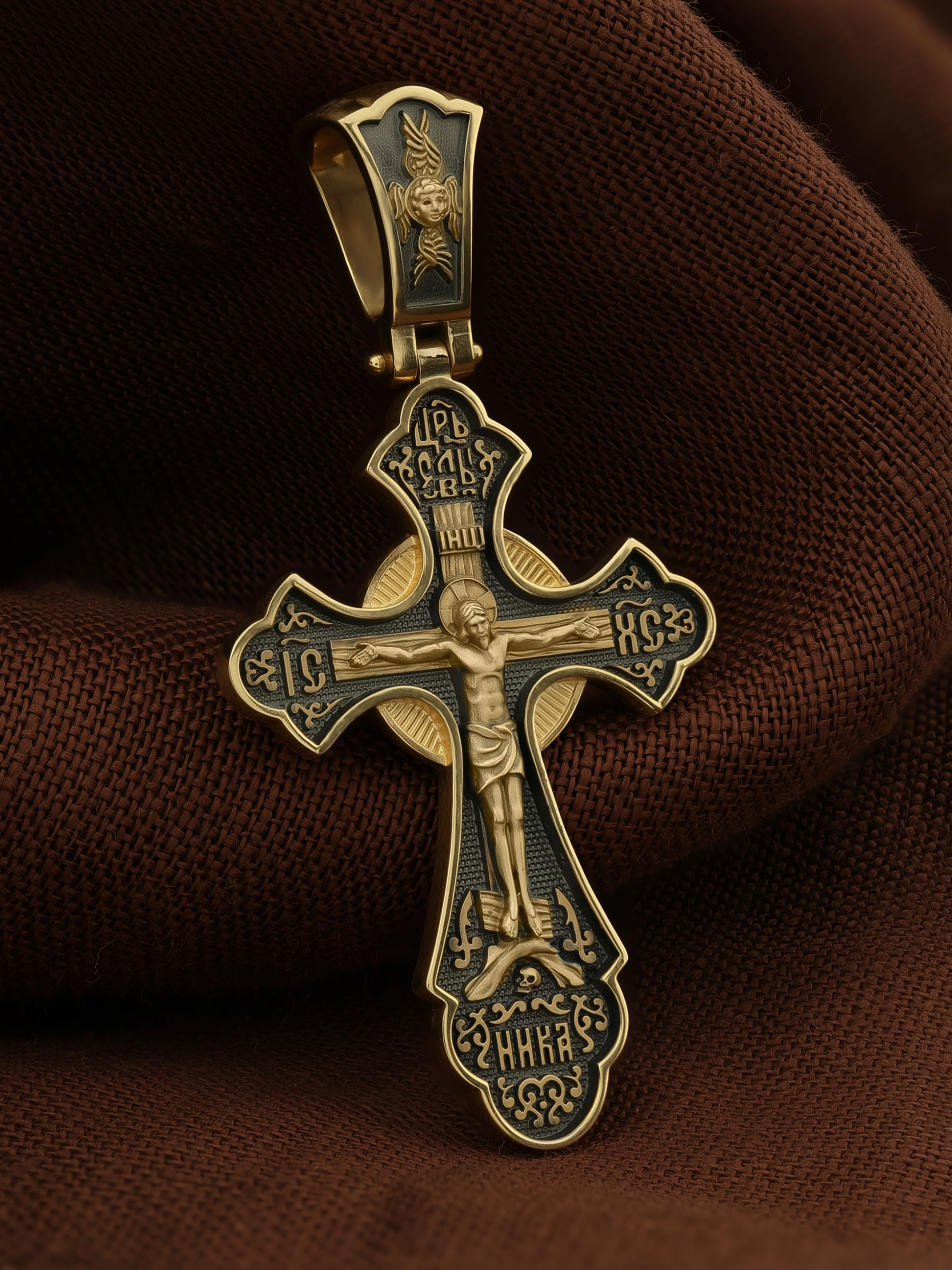 На лицевой стороне креста по каноническим правилам Церкви изображен Господь Иисус Христос. Сверху у изголовья Иисуса Христа размещена табличка с надписью в виде аббревиатуры ИНЦИ — «Иисус Назорей Царь Иудейский», которая, согласно Евангелию, была прибита к кресту после Распятия. У подножия креста Господа в виде скалистой горки изображена гора Голгофа с Главой Адамовой в пещере.